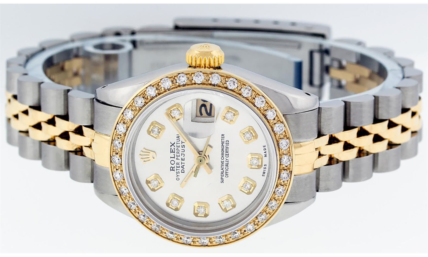 One Ladies Pre Owned Quickset Two Tone 18K Yellow Gold And Stainless Steel Rolex Datejust Polished, Serviced And Electronically Tested, Yellow Gold And Stainless Steel Case: 26mm, Yellow Gold Crown, Custom Bezel: New 18K Yellow Gold Beadset Diamond Bezel, Diamond Count: 32 Diamonds. Custom Crystal: New Sapphire With Magnified Date Window. Custom Hands: New Luminescent Hands. Movement: Automatic Winding Movement 2135. Custom Dial: Silver Dial Set With Diamond Hour Markers, 10 Diamond in Dial. Date Window: 3 O'Clock Position Date Display, Model: Quickset Datejust. Condition: G-6 Extra Fine. Rolex Bracelet: Two Tone 18K Yellow Gold And Stainless Steel Jubilee Band. Bright Polish. 6.0 Inch Length, Adjustable. Standard Clasp, With Rolex Logo. This Watch Has Been Serviced Time Tested And Is In Excellent Condition It Is Free Of All Scratches And Dents.