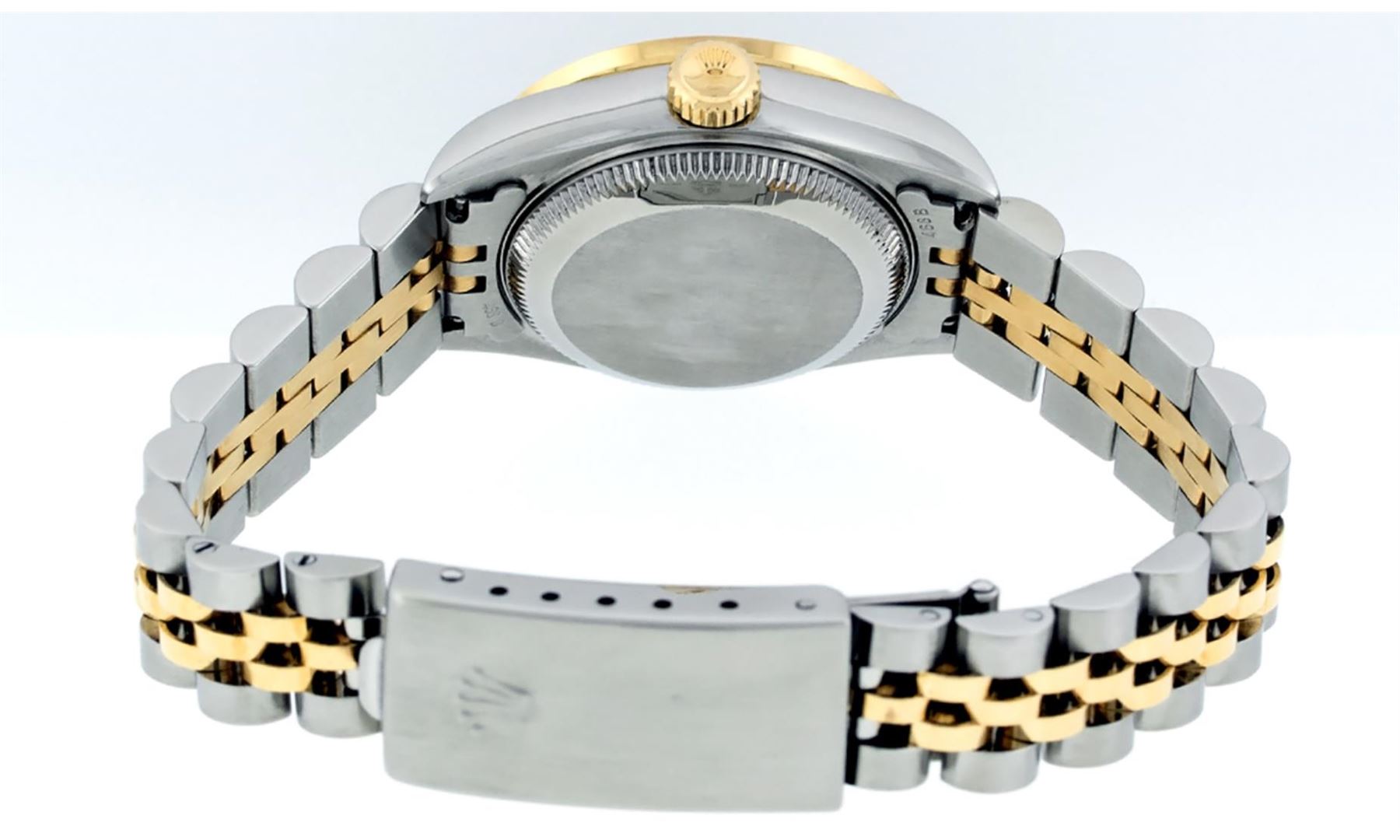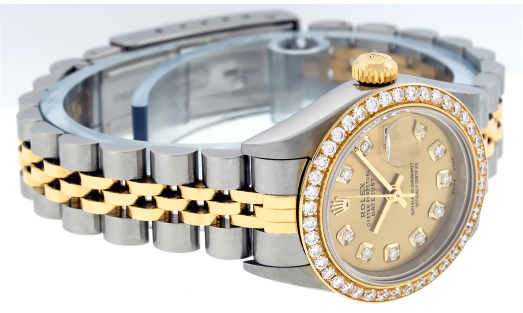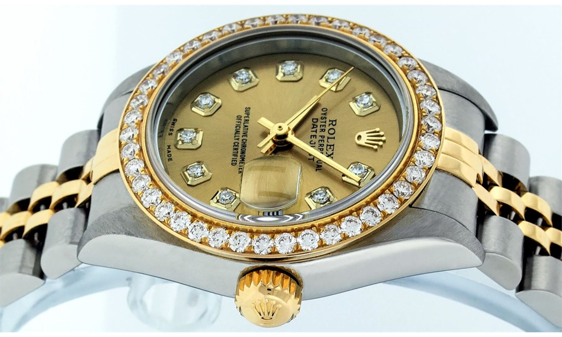 One Ladies Pre Owned Quickset 18K Yellow Gold And Stainless Steel Rolex Datejust Polished, Serviced And Electronically Tested, 18K Yellow Gold And Stainless Steel Case: 26mm, 18K Yellow Gold Crown, Custom Bezel: New 18K Yellow Gold Beadset Diamond Bezel, Diamond Count: 42 Diamonds On dial, Total Weight 1.00 Carat. Custom Crystal: New Sapphire With Date Window. Custom Hands: New Solid Hands. Rolex Movement: Automatic Winding Movement 2235. Custom Dial: Custom Champagne Dial With Added Diamonds, Stone Count: 10 Diamonds. Date Window: 3 O'Clock Position Date Display, Model: Quickset Datejust. Condition: G-6 Extra Fine. Rolex Bracelet: Two Tone 18K Yellow Gold And Stainless Steel Jubilee Band. Bright Polish. 6.0 Inch Length, Adjustable. Standard Clasp, With Rolex Logo. This Watch Has Been Serviced Time Tested And Is In Excellent Condition It Is Free Of All Scratches And Dents.
