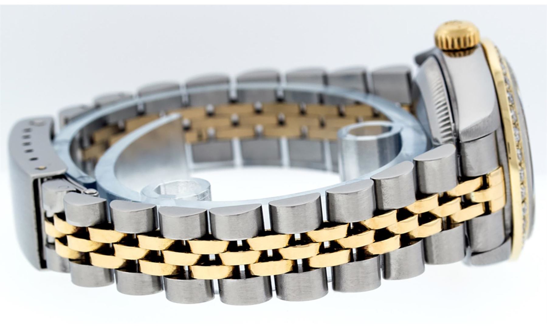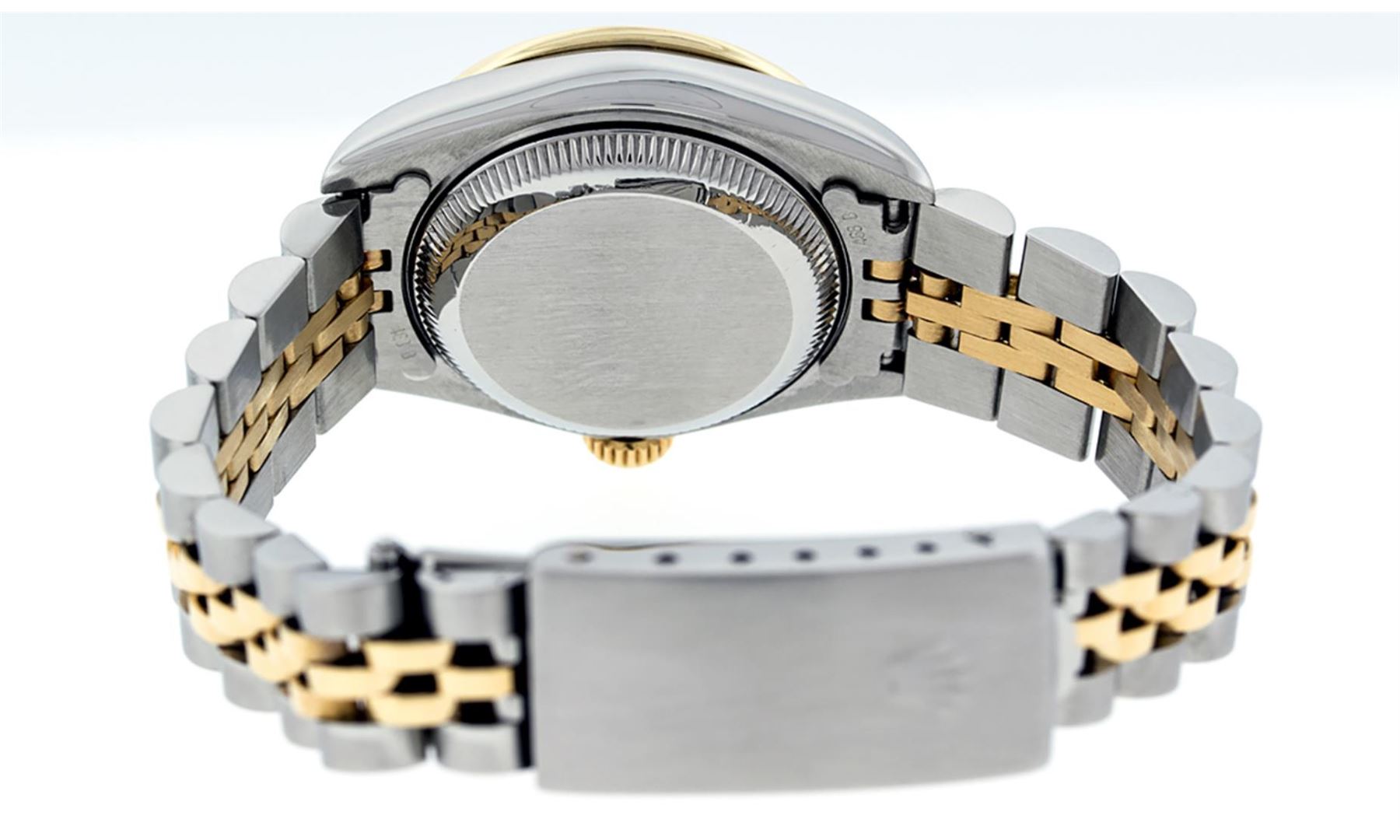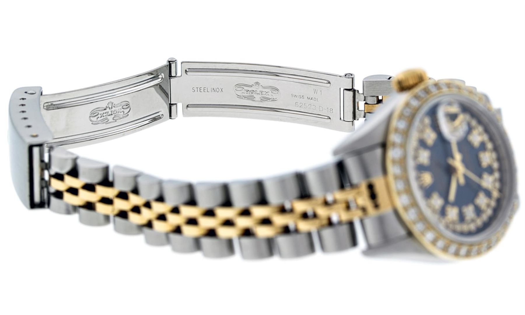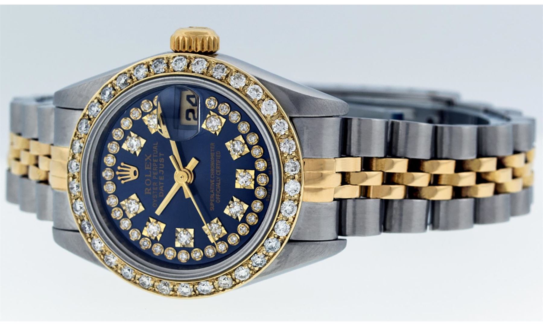 One Ladies Pre Owned Quickset Two Tone 18K Yellow Gold And Stainless Steel Rolex Datejust Polished, Serviced And Electronically Tested, 18K Yellow Gold And Stainless Steel Case: 26mm, 18K Yellow Gold Crown, Custom Bezel: New 18K Yellow Gold Beadset Diamond Bezel, Diamond Count: 43 Diamonds On Dial. Custom Crystal: New Sapphire With Date Window. Custom Hands: New Solid Hands. Rolex Movement: Quickset Automatic Winding Movement 2235. Custom Dial: Custom Blue Dial With Added Diamonds, Stone Count: 43 Diamonds. Date Window: 3 O'Clock Position Date Display, Model: Datejust. Condition: G-6 Extra Fine. Rolex Bracelet: Two Tone 18K Yellow Gold And Stainless Steel Jubilee Band. Bright Polish. 6.0 Inch Length, Adjustable. Standard Clasp, With Rolex Logo. This Watch Has Been Serviced Time Tested And Is In Excellent Condition It Is Free Of All Scratches And Dents.