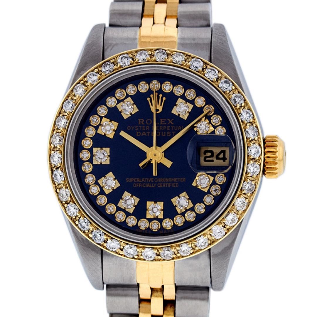One Ladies Pre Owned Quickset Two Tone 18K Yellow Gold And Stainless Steel Rolex Datejust Polished, Serviced And Electronically Tested, 18K Yellow Gold And Stainless Steel Case: 26mm, 18K Yellow Gold Crown, Custom Bezel: New 18K Yellow Gold Beadset Diamond Bezel, Diamond Count: 43 Diamonds On Dial. Custom Crystal: New Sapphire With Date Window. Custom Hands: New Solid Hands. Rolex Movement: Quickset Automatic Winding Movement 2235. Custom Dial: Custom Blue Dial With Added Diamonds, Stone Count: 43 Diamonds. Date Window: 3 O'Clock Position Date Display, Model: Datejust. Condition: G-6 Extra Fine. Rolex Bracelet: Two Tone 18K Yellow Gold And Stainless Steel Jubilee Band. Bright Polish. 6.0 Inch Length, Adjustable. Standard Clasp, With Rolex Logo. This Watch Has Been Serviced Time Tested And Is In Excellent Condition It Is Free Of All Scratches And Dents.