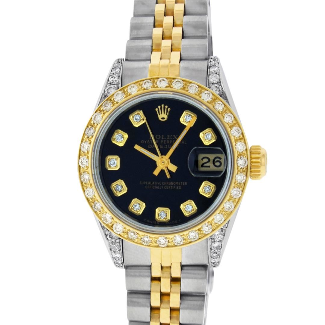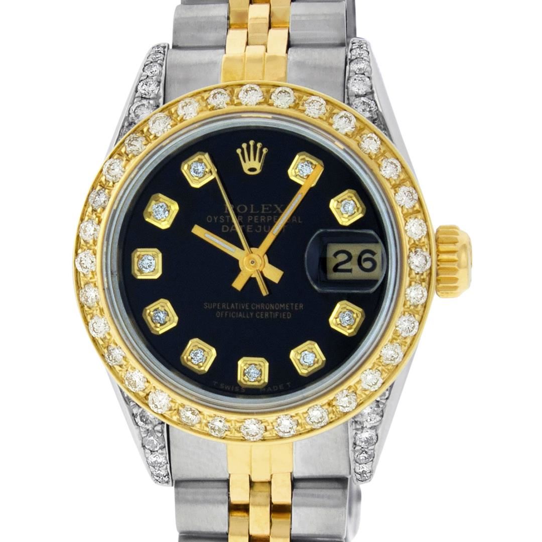 One Ladies Pre Owned Quickset 18K Yellow Gold And Stainless Steel Rolex Datejust Polished, Serviced And Electronically Tested, 18K Yellow Gold And Stainless Steel Case: 26mm, 18K Yellow Gold Crown, Custom Diamond Lugs: 24 Added Diamonds On Lugs. Custom Bezel: New 18K Yellow Gold Beadset Diamond Bezel, Diamond Count: 32 Diamonds On Bezel. Custom Crystal: New Sapphire With Date Window. Custom Hands: New Luminescent Hands. Rolex Movement: Automatic Winding Movement 2235. Custom Dial: Custom Black Dial With Added Diamond Hour Markers, Diamond Count: 10 Diamonds On Dial. Date Window: 3 O'Clock Position Date Display, Model: Quickset Datejust. Condition: G-6 Extra Fine. Rolex Bracelet: Two Tone 18K Yellow Gold And Stainless Steel Jubilee Band. Bright Polish. 6.0 Inch Length, Adjustable. Standard Clasp, With Rolex Logo. This Watch Has Been Serviced Time Tested And Is In Excellent Condition It Is Free Of All Scratches And Dents.