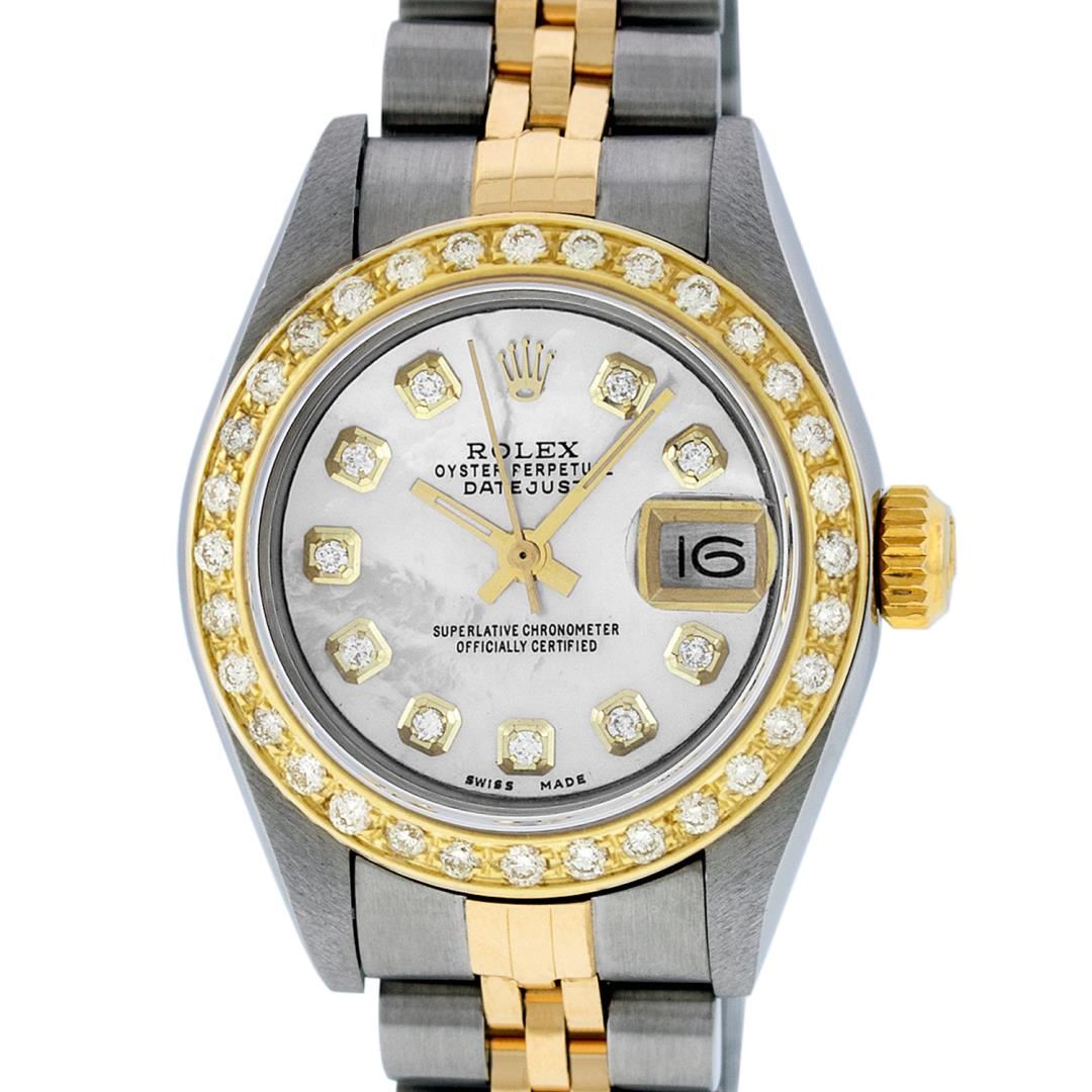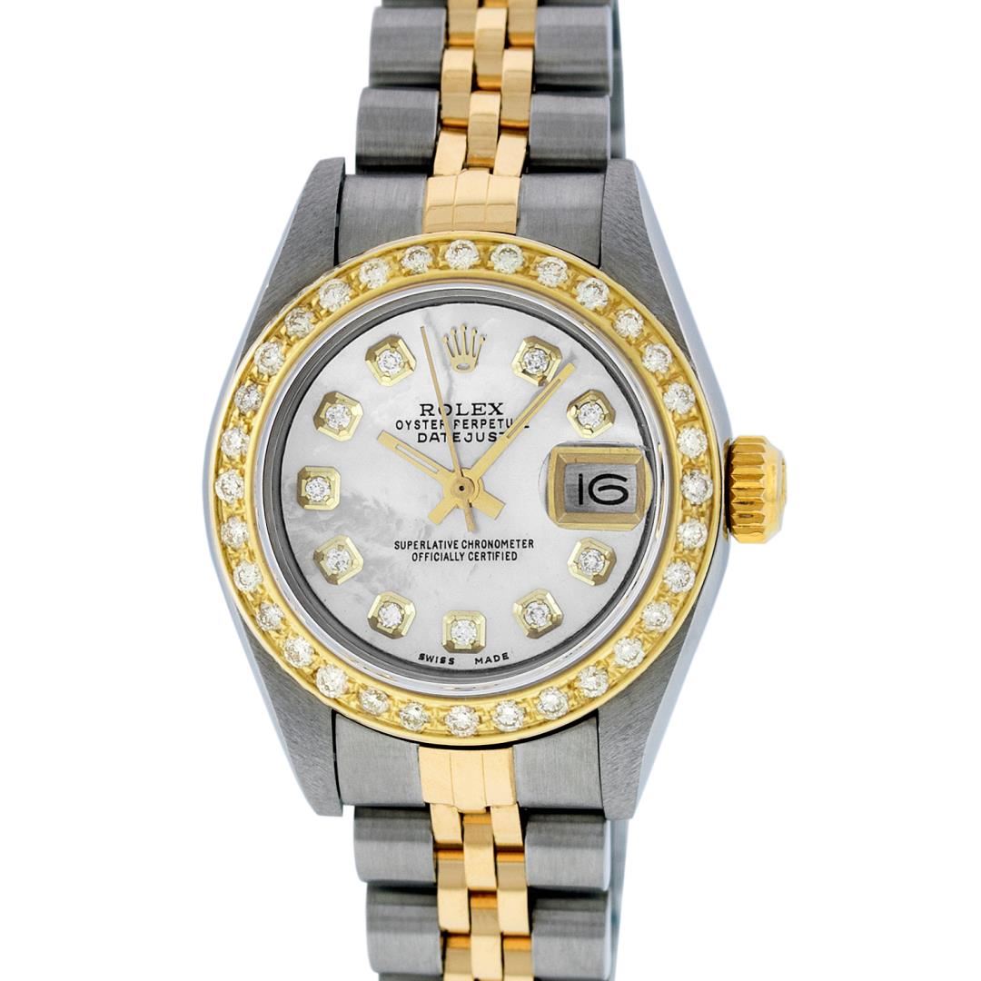One Ladies Pre Owned 18K Yellow Gold And Stainless Steel Rolex Datejust Polished, Serviced And Electronically Tested, 18K Yellow Gold And Stainless Steel Case: 26mm, 18K Yellow Gold Crown, Custom Bezel: New 18K Yellow Gold Beadset Diamond Bezel, Diamond Count: 32 Diamonds On Bezel. Custom Crystal: New Sapphire With Date Window. Custom Hands: New Luminescent Hands. Rolex Movement: Automatic Winding Movement 2235. Custom Dial: Custom White Dial With Added Diamonds, Stone Count: 10 Diamonds. Date Window: 3 O'Clock Position Date Display, Model: Datejust. Condition: G-6 Extra Fine. Rolex Bracelet: Two Tone 18K Yellow Gold And Stainless Steel Jubilee Band. Bright Polish. 6.0 Inch Length, Adjustable. Standard Clasp, With Rolex Logo. This Watch Has Been Serviced Time Tested And Is In Excellent Condition It Is Free Of All Scratches And Dents.