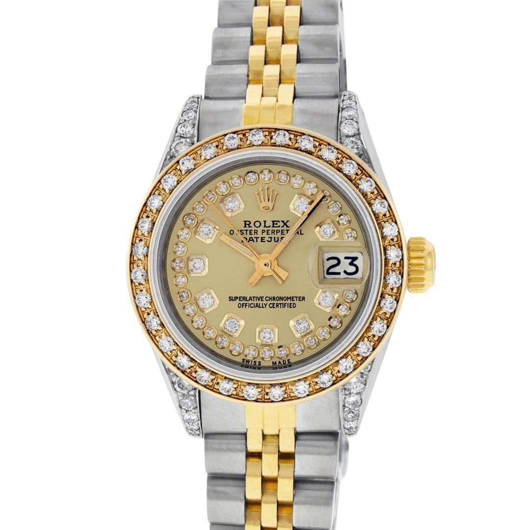One Ladies Pre Owned Two Tone Yellow Gold And Stainless Steel Rolex Datejust Polished, Serviced And Electronically Tested, Yellow Gold And Stainless Steel Case: 26mm, Yellow Gold Crown, Custom Diamond Lugs: 24 Added Diamonds On Lugs. Custom Bezel: New 18K Yellow Gold Beadset Diamond Bezel, Diamond Count: 32 Diamond. Custom Crystal: New Sapphire With Magnified Date Window. Custom Hands: New Luminescent Hands. Rolex Movement: Automatic Winding Movement 2135. Custom Dial: Custom Champagne Dial With Added Diamond Hour Markers, Diamond Count: 43 Diamonds On Dial. Date Window: 3 O'Clock Position Date Display, Model: Datejust. Condition: G-6 Extra Fine. Rolex Bracelet: Two Tone Yellow Gold And Stainless Steel Jubilee Band. Bright Polish. 6.0 Inch Length, Adjustable. Standard Clasp, With Rolex Logo. This Watch Has Been Serviced Time Tested And Is In Excellent Condition It Is Free Of All Scratches And Dents.
