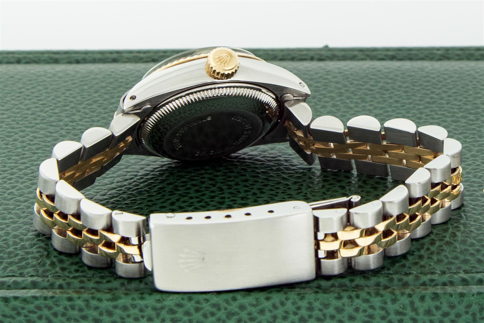 One Ladies Pre Owned Two Tone Rolex Datejust Polished, Serviced & Electronically Tested, Rolex Yellow Gold & Stainless Steel Case: 26mm, Rolex Yellow Gold Crown, Rolex Bezel: Rolex Yellow Gold Fluted Bezel. Custom Crystal: New Acrylic Cyclops Lens. Custom Hands: New Luminescent Hands. Rolex Movement: Automatic Winding Movement. Custom Dial: Refinished To Champagne With Custom Added Diamond Hour Markers, Diamond Count: 10 Diamonds In Dial, Color: G to H, Clarity: VS2-SI1. Date Window: 3 O'Clock Position Date Display, Model: Datejust. Condition: G-6 Extra Fine. Rolex Bracelet: Two Tone Yellow Gold & Stainless Steel Jubilee Band. Bright Polish. 6.0 Inch Length, Adjustable. Standard Clasp, With Rolex Logo. This Watch Has Been Serviced Time Tested And Is In Excellent Condition It Is Free Of All Scratches And Dents. This Watch Comes With A Rolex Box.
