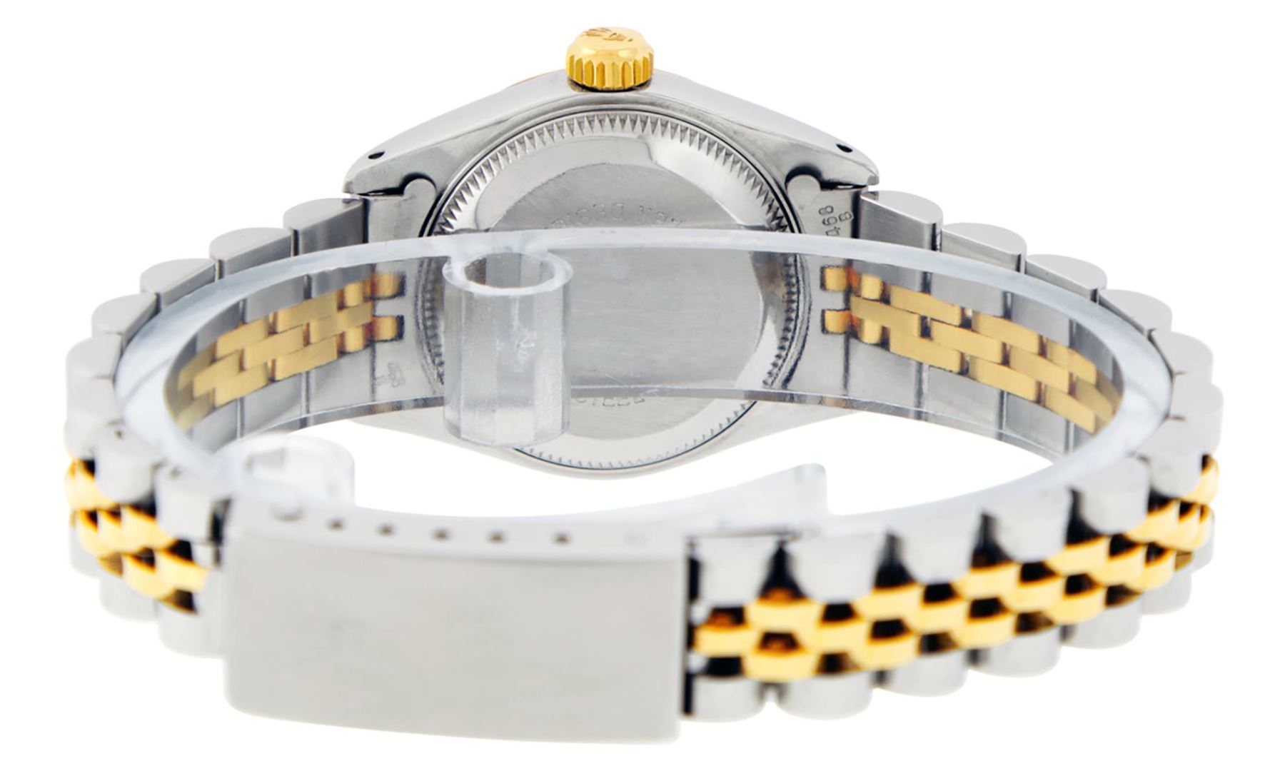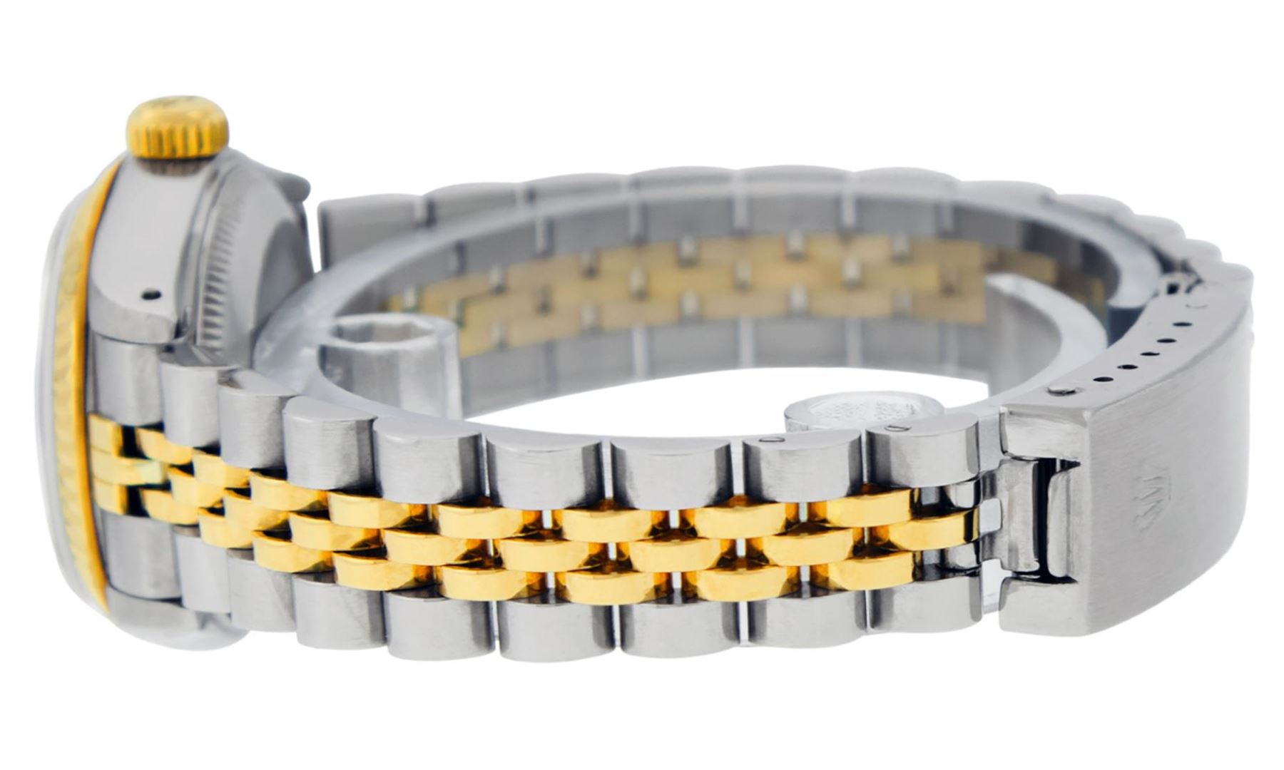 One Ladies Pre Owned Quickset Rolex Two Tone 18K Yellow Gold And Stainless Steel Datejust Polished, Serviced & Electronically Tested, Yellow Gold And Stainless Steel Case: 26mm, Yellow Gold Crown, Rolex Bezel: 18K Yellow Gold Fluted Bezel. Custom Crystal: New Acrylic Cyclops Lens. Custom Hands: New Luminescent Hands. Rolex Movement: Automatic Winding Movement 2135. Custom Dial: Custom Silver Dial With Custom Added Diamond Hour Markers, Diamond Count: 10 Diamonds, Color: G to H, Clarity: VS2-SI1. Date Window: 3 O'Clock Position Date Display, Model: Quickset Datejust. Condition: G-6 Extra Fine. Rolex Bracelet: Two Tone 18K Yellow Gold And Stainless Steel Jubilee Band. Bright Polish. 6.0 Inch Length, Adjustable. Standard Clasp, With Rolex Logo. This Watch Has Been Serviced Time Tested And Is In Excellent Condition It Is Free Of All Scratches And Dents.