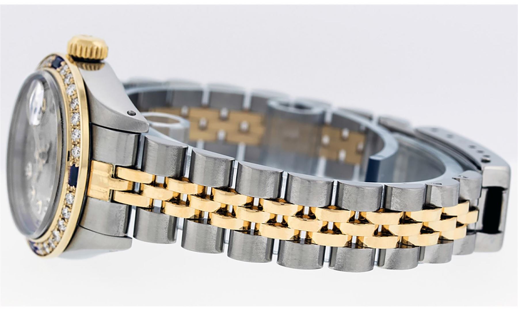 One Ladies Two Tone Rolex Datejust Polished, Serviced & Electronically Tested, Yellow Gold & Stainless Steel Case: 26mm, Yellow Gold Crown, Bezel: Yellow Gold Sapphire Beadset Diamond Bezel, Diamond Count: 28Diamonds + 4 Sapphires. Custom Crystal: New Acrylic Cyclops Lens. Custom Hands: New Luminescent Hands. Movement: Automatic Winding Movement. Custom Dial: Slate Grey With Diamond Hour Markers, Diamond Count: 10 Diamonds, Color: G to H, Clarity: VS2-SI1. Date Window: 3 O'clock Position Date Display, Model: Datejust. Condition: G-6 Extra Fine. Bracelet: Two Tone Yellow Gold & Stainless Steel Jubilee Band. Bright Polish. 6.0 Inch Length, Adjustable. Standard Clasp, With Rolex Logo. This Watch Has Been Serviced Time Tested And Is In Excellent Condition It Is Free Of All Scratches And Dents.