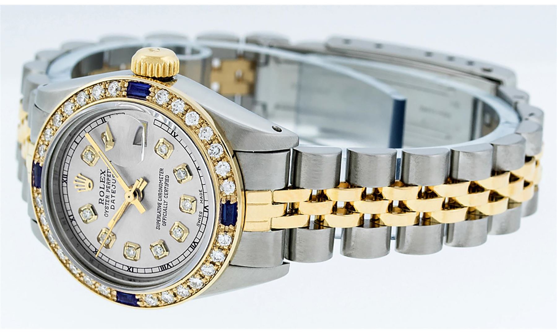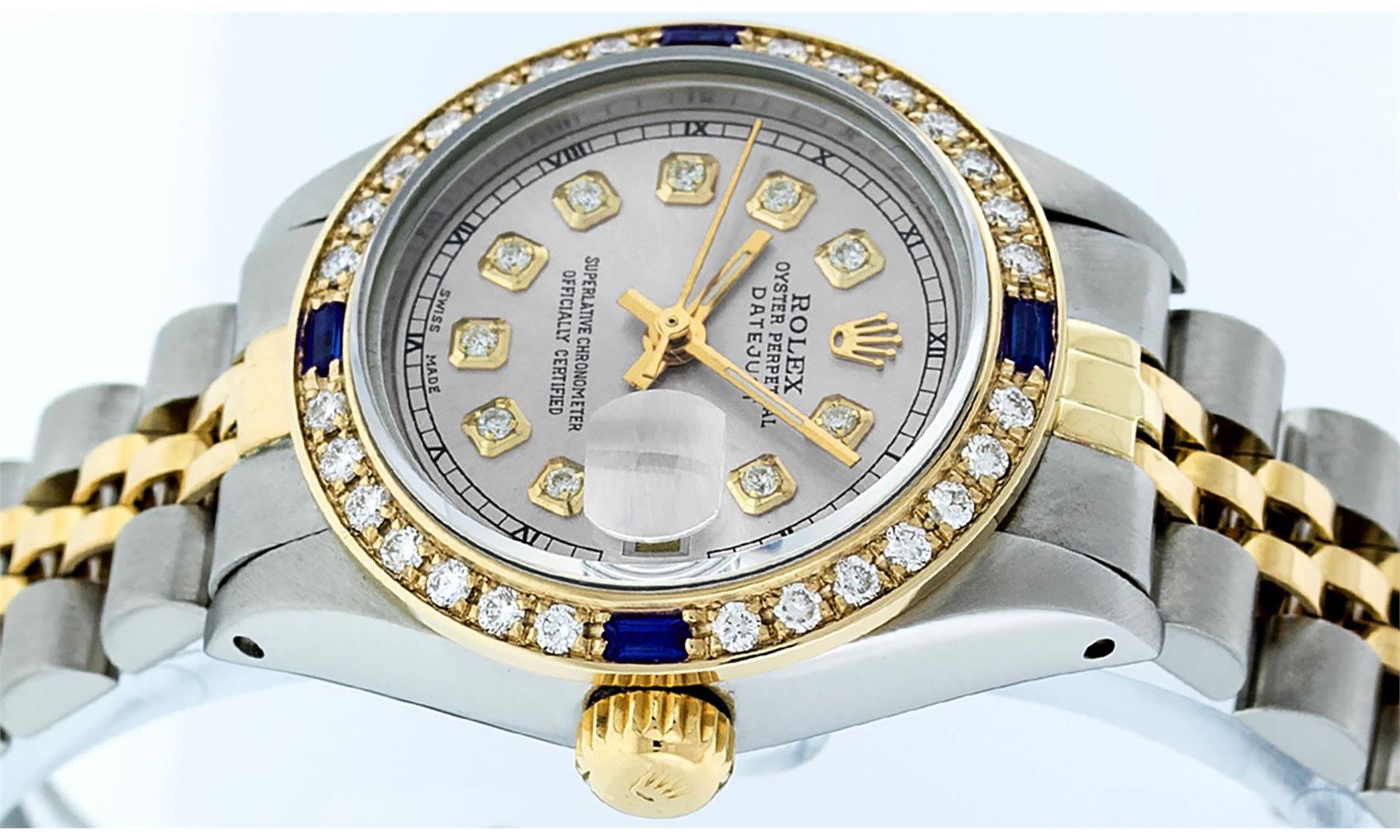 One Ladies Two Tone Rolex Datejust Polished, Serviced & Electronically Tested, Yellow Gold & Stainless Steel Case: 26mm, Yellow Gold Crown, Bezel: Yellow Gold Sapphire Beadset Diamond Bezel, Diamond Count: 28Diamonds + 4 Sapphires. Custom Crystal: New Acrylic Cyclops Lens. Custom Hands: New Luminescent Hands. Movement: Automatic Winding Movement. Custom Dial: Slate Grey With Diamond Hour Markers, Diamond Count: 10 Diamonds, Color: G to H, Clarity: VS2-SI1. Date Window: 3 O'clock Position Date Display, Model: Datejust. Condition: G-6 Extra Fine. Bracelet: Two Tone Yellow Gold & Stainless Steel Jubilee Band. Bright Polish. 6.0 Inch Length, Adjustable. Standard Clasp, With Rolex Logo. This Watch Has Been Serviced Time Tested And Is In Excellent Condition It Is Free Of All Scratches And Dents.