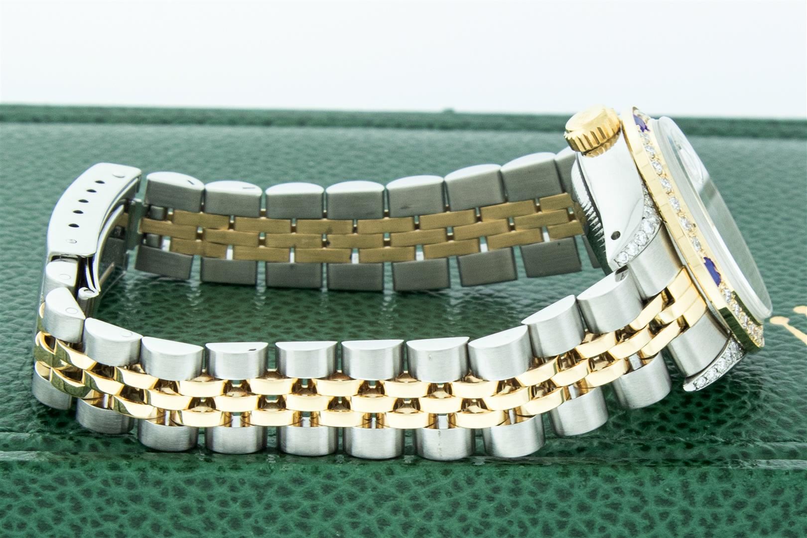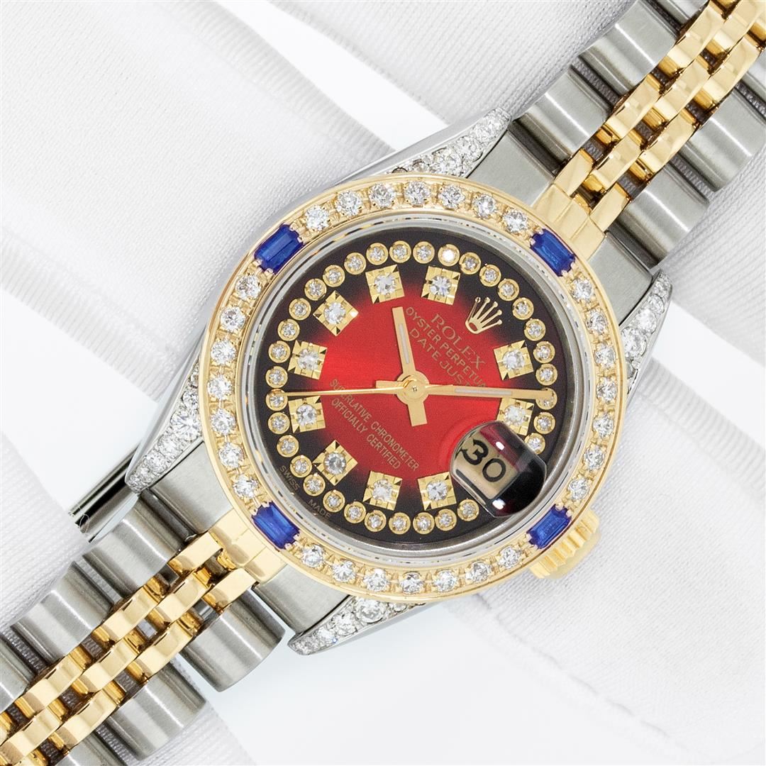 One Ladies Two Tone Rolex Datejust Polished Bright with Satin Finish, Serviced & Electronically Tested, Rolex Stainless Steel Case: 26mm, Rolex Stainless Gold Crown, Custom Diamond Lugs: 24 Diamonds On Lugs, Clarity: SI-VS, Color: G to H. Custom Bezel: New 18K Yellow Gold Sapphire Beadset Bezel, Diamond Count: 28 Diamonds + 4 Sapphires, Clarity: SI-VS, Color: G to H. Custom Crystal: New Sapphire with Magnified Date Window. Custom Hands: New Luminescent Hands. Rolex Movement: Automatic Winding Movement. Custom Dial: Refinished To Red Vignette with Custom Added Diamonds, 43 Diamonds in Dial G To H In Color, Clarity: VS. Date Window: 3 O'Clock Position Date Display, Model: Datejust Condition: G-6 Extra Fine. Rolex Bracelet: Stainless Steel Jubilee Band. Bright Polish & Satin Finish. 6.0 Inch Length, Adjustable. Standard Clasp, with Rolex Logo. This Pre Owned Watch Has Been Serviced Time Tested And Is In Excellent Condition It Is Free Of All Scratches And Dents. This Watch Comes with A Rolex Box.