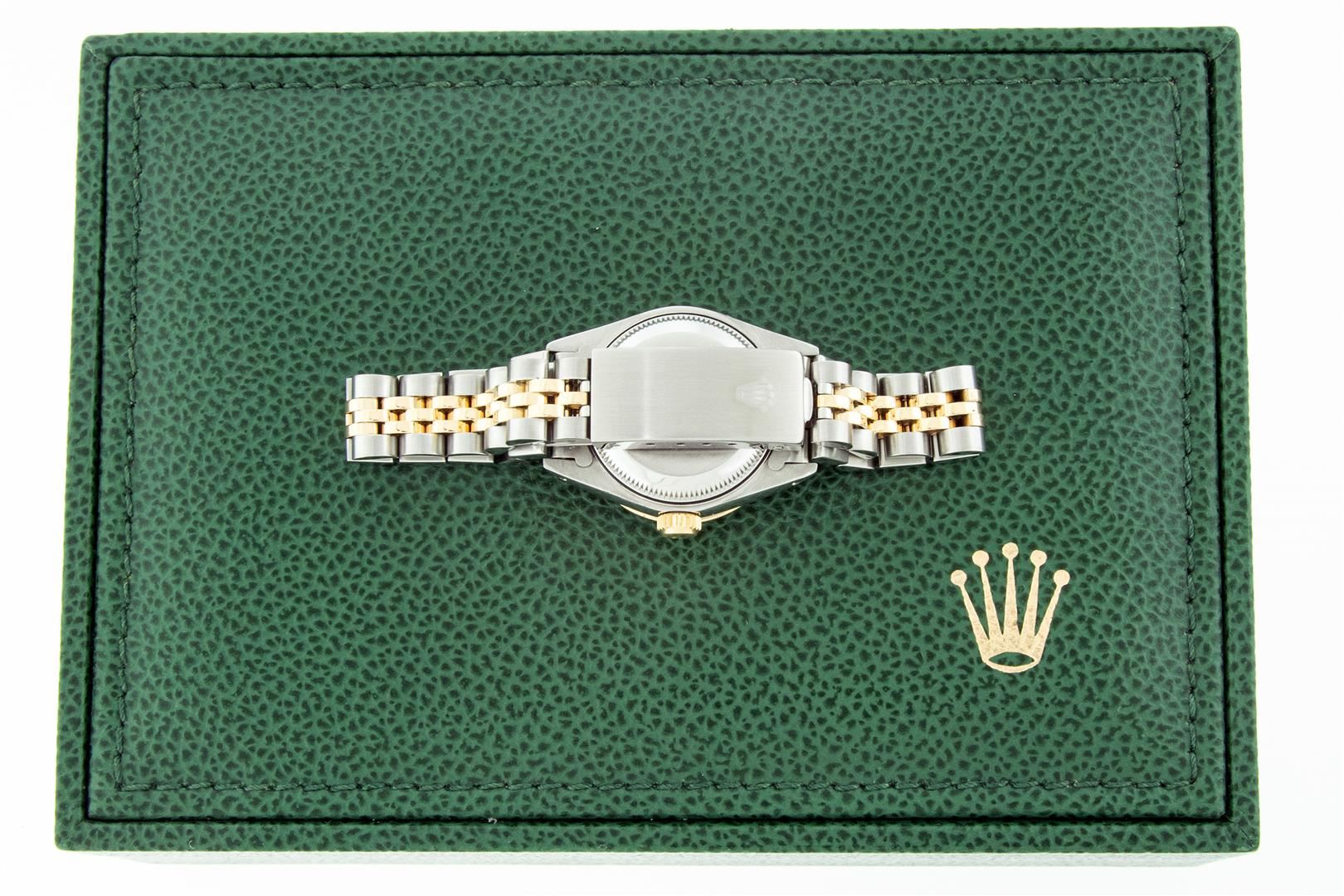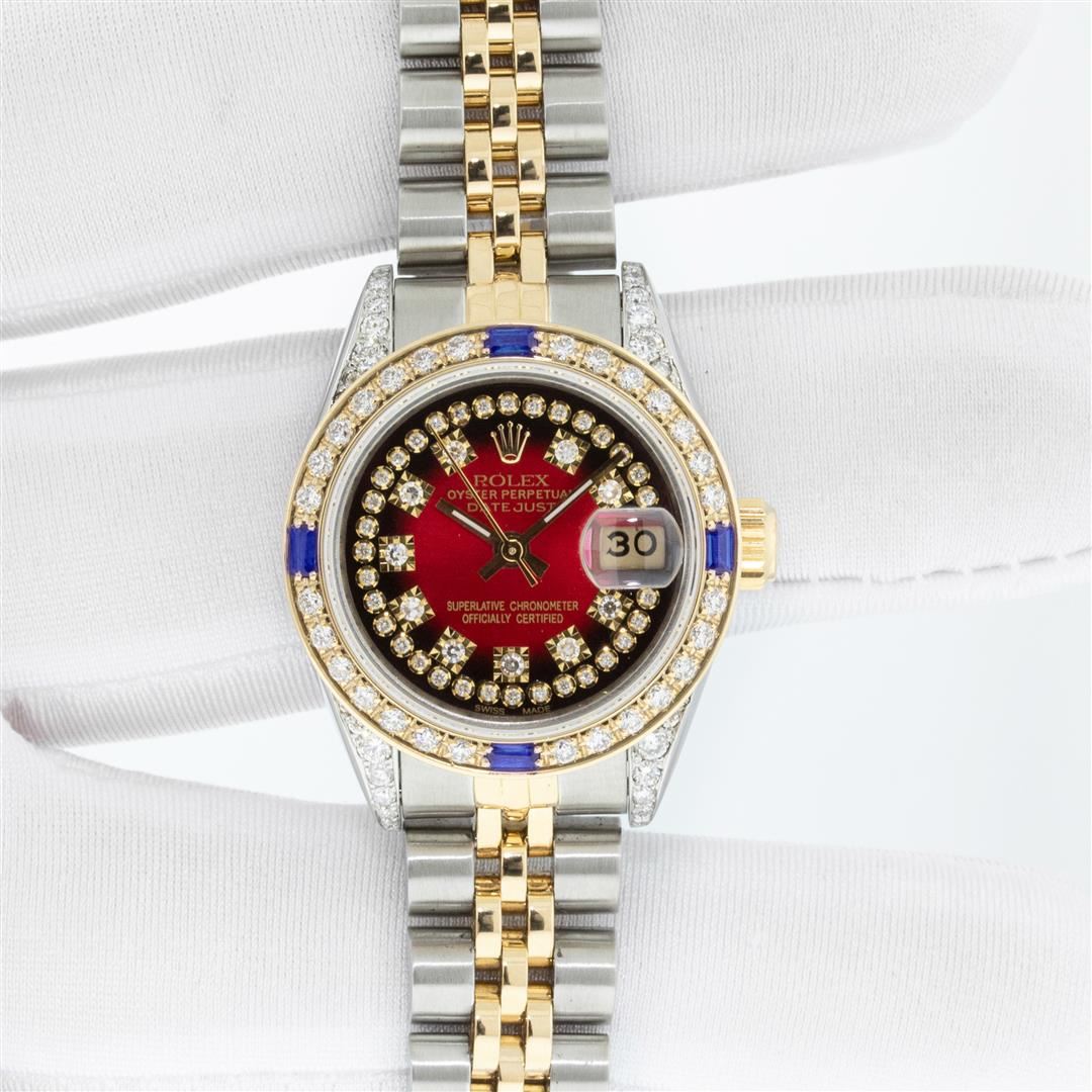 One Ladies Two Tone Rolex Datejust Polished Bright with Satin Finish, Serviced & Electronically Tested, Rolex Stainless Steel Case: 26mm, Rolex Stainless Gold Crown, Custom Diamond Lugs: 24 Diamonds On Lugs, Clarity: SI-VS, Color: G to H. Custom Bezel: New 18K Yellow Gold Sapphire Beadset Bezel, Diamond Count: 28 Diamonds + 4 Sapphires, Clarity: SI-VS, Color: G to H. Custom Crystal: New Sapphire with Magnified Date Window. Custom Hands: New Luminescent Hands. Rolex Movement: Automatic Winding Movement. Custom Dial: Refinished To Red Vignette with Custom Added Diamonds, 43 Diamonds in Dial G To H In Color, Clarity: VS. Date Window: 3 O'Clock Position Date Display, Model: Datejust Condition: G-6 Extra Fine. Rolex Bracelet: Stainless Steel Jubilee Band. Bright Polish & Satin Finish. 6.0 Inch Length, Adjustable. Standard Clasp, with Rolex Logo. This Pre Owned Watch Has Been Serviced Time Tested And Is In Excellent Condition It Is Free Of All Scratches And Dents. This Watch Comes with A Rolex Box.