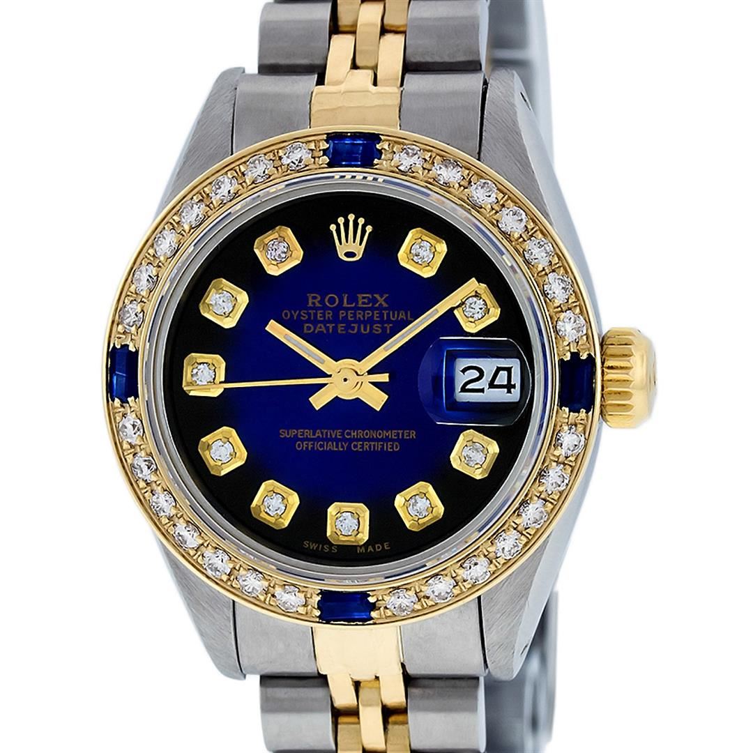 One Ladies Two Tone Rolex Datejust Polished, Serviced & Electronically Tested, Yellow Gold & Stainless Steel Case: 26mm, Yellow Gold Crown, Custom Bezel: New 18K Yellow Gold Sapphire Beadset Diamond Bezel, Diamond + Gem Count: 28 Diamonds + 4 Sapphires Total Weight .70 Carat, Clarity: Si-VS, Color: G to H. Custom Crystal: New Synthetic Sapphire Cyclops Lens. Custom Hands: New Luminescent Hands. Movement: Automatic Winding Movement. Custom Dial: Blue Vignette Dial Set With Diamond Hour Markers, Diamond Count: 10 Diamond in Dial, G To H In Color, SI-VS Clarity. Date Window: 3 O'clock Position Date Display, Model: Datejust, Condition: G-6 Extra Fine. Bracelet: Two Tone Yellow Gold & Stainless Steel Jubilee. Bright Polish. 6.0 Inch Length, Adjustable. Standard Clasp, With Rolex Logo. This Watch Has Been Serviced Time Tested And Is In Excellent Condition It Is Free Of All Scratches And Dents.