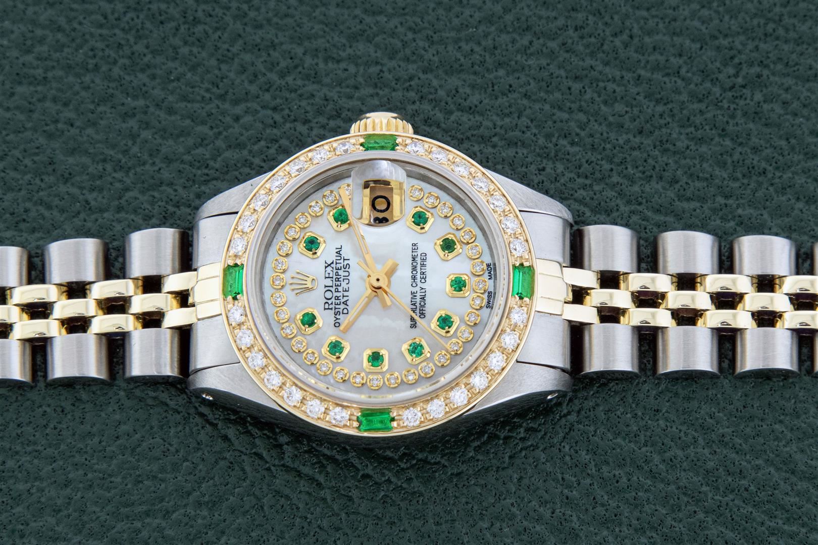 One Ladies Two Tone Rolex Datejust Polished, Serviced & Electronically Tested, Yellow Gold & Stainless Steel Case: 26mm, Yellow Gold Crown, Custom Bezel: New 18K Yellow Gold Emerald Beadset Diamond Bezel, Diamond Count: 28 Diamonds + 4 Emeralds, Clarity: SI-VS, Color: G to H. Custom Crystal: New Sapphire with Date Window. Custom Hands: New Luminescent Hands. Rolex Movement: Automatic Winding Movement. Custom Dial: Mother Of Pearl with Custom Added Green Emerald String Diamond Hour Markers. 10 Emeralds + 33 Diamonds In Dial, Clarity: SI-VS, Color: G to H. Date Window: 3 O'Clock Position Date Display, Model: Datejust. Condition: G-6 Extra Fine. Rolex Bracelet: Two Tone Yellow Gold & Stainless Steel Jubilee. Bright Polish. 6.0 Inch Length, Adjustable. Standard Clasp, with Rolex Logo. This Watch Has Been Serviced Time Tested And Is In Excellent Condition It Is Free Of All Scratches And Dents. This Watch Comes with A Rolex Box.