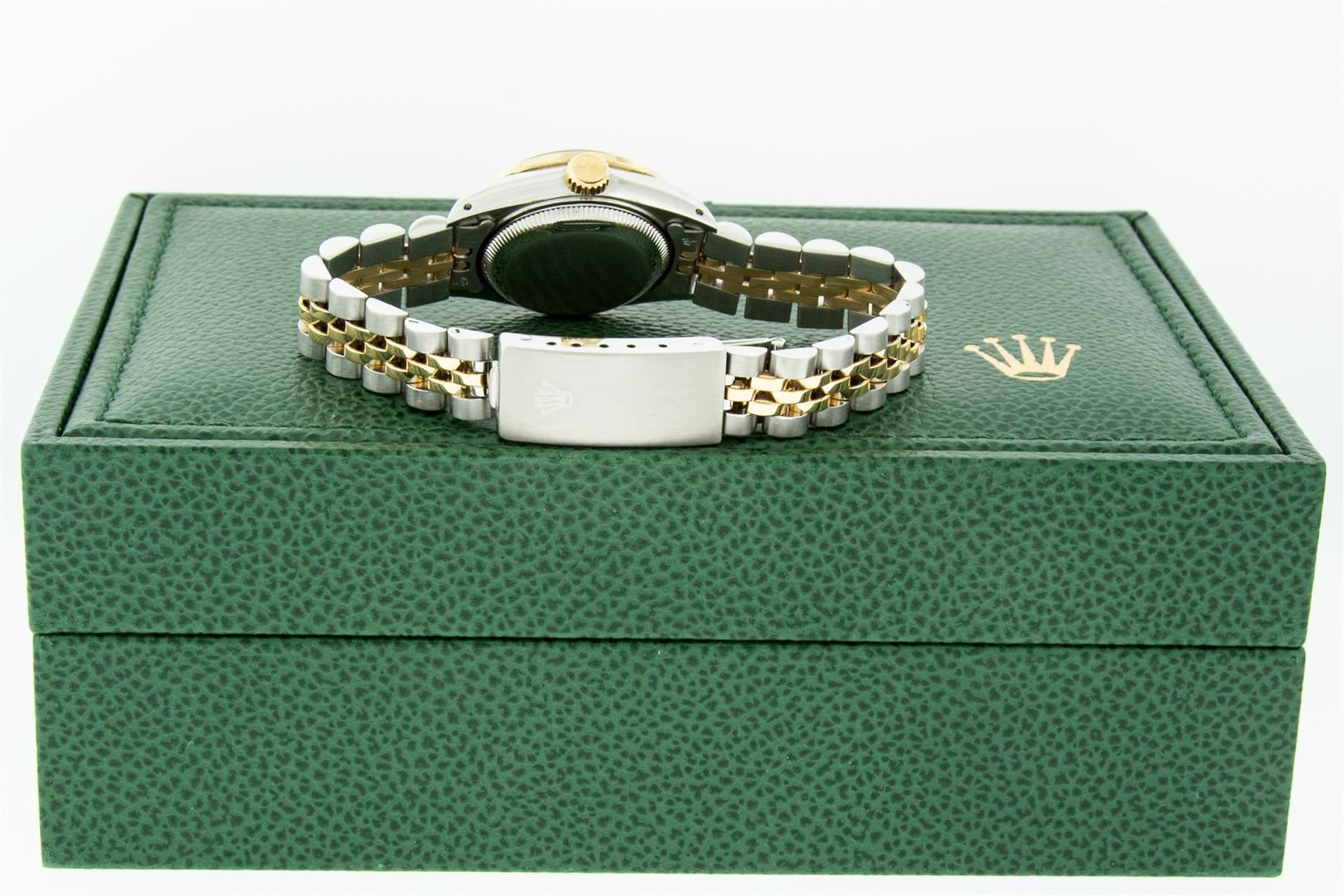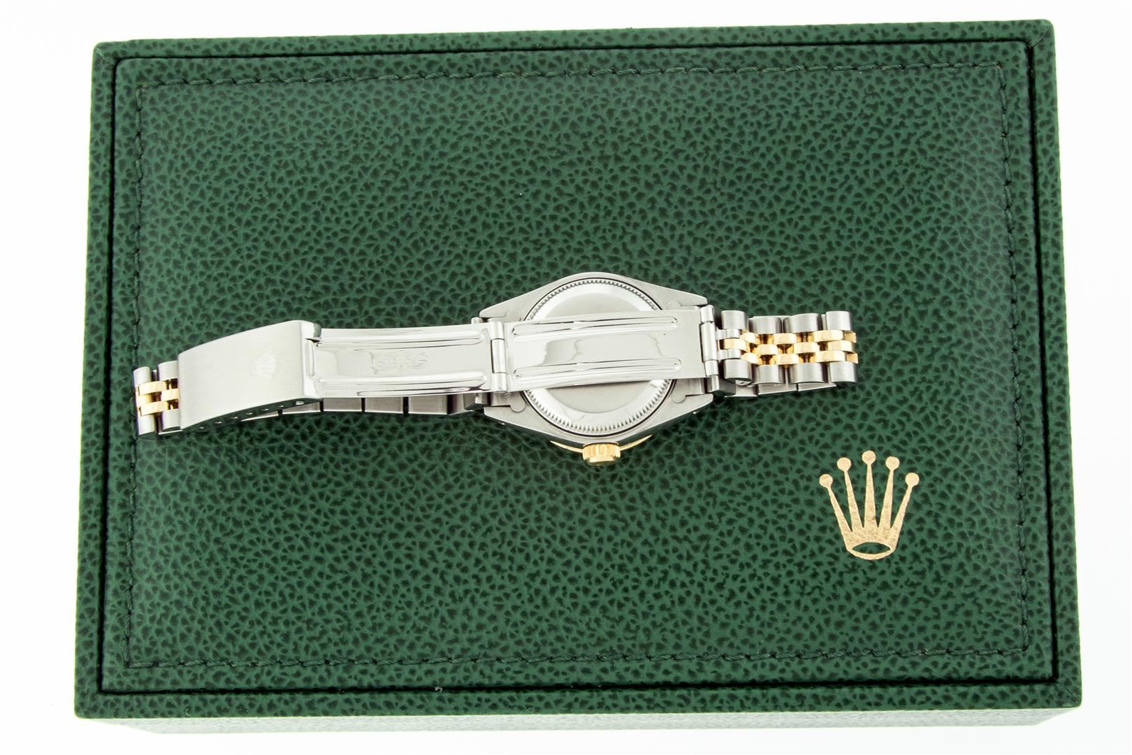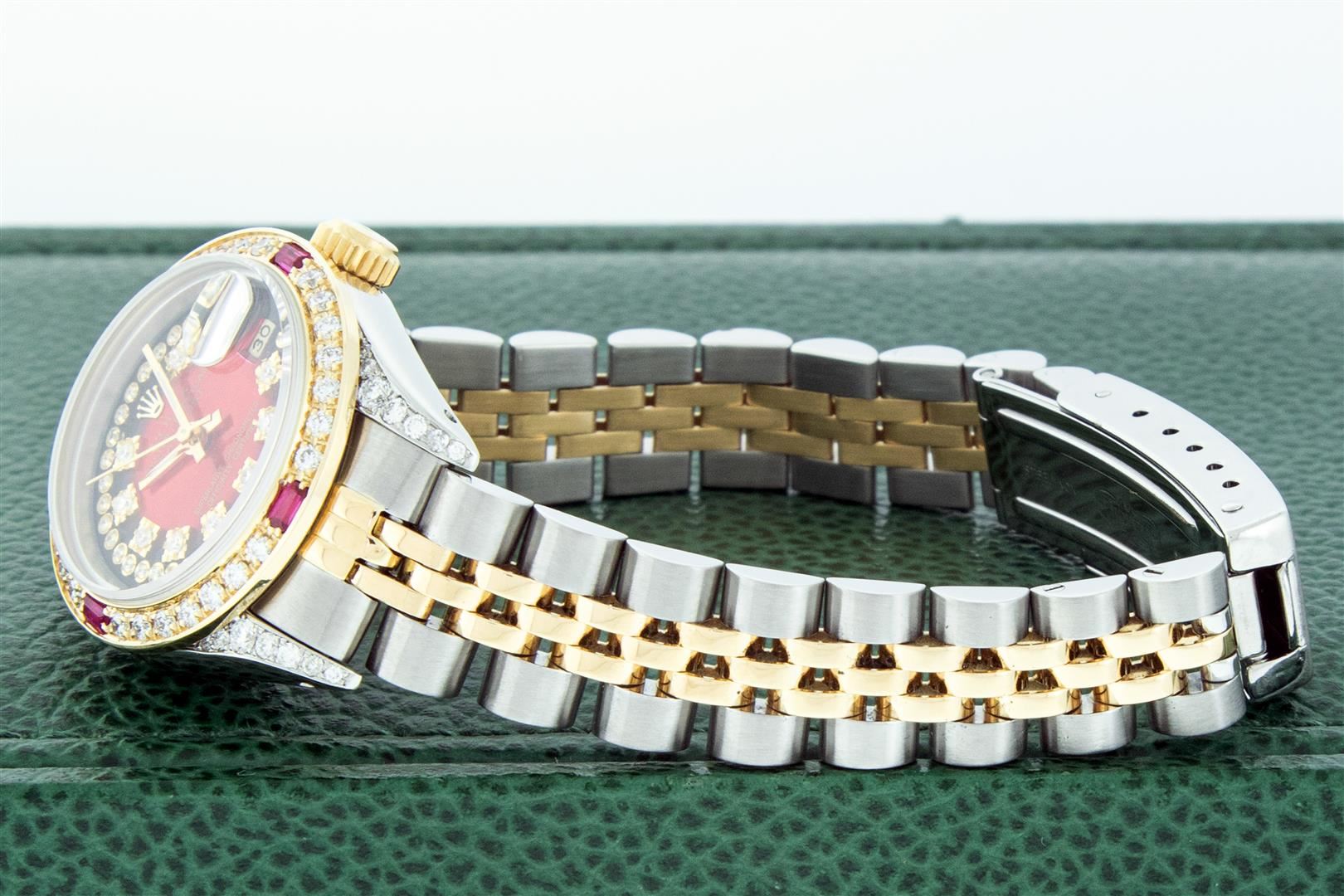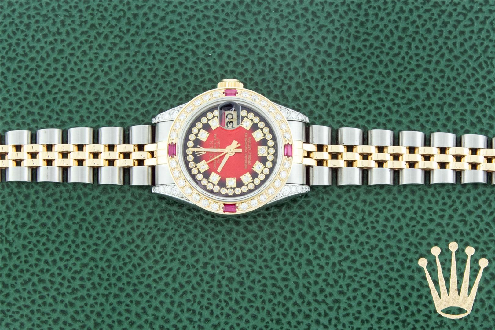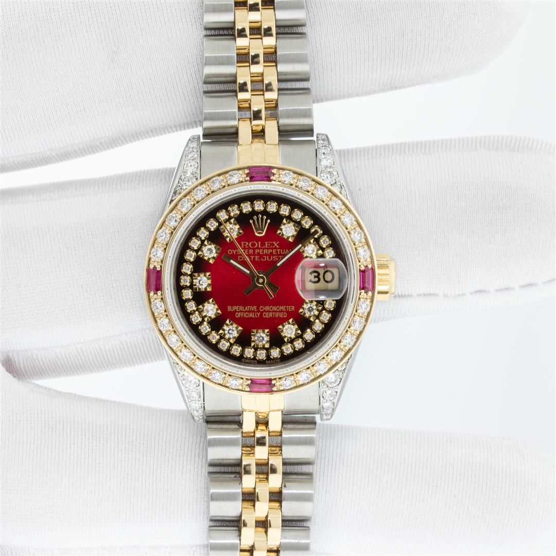 One Ladies Two Tone Rolex Datejust Polished Bright with Satin Finish, Serviced & Electronically Tested, Rolex Stainless Steel Case: 26mm, Rolex Gold Crown, Custom Diamond Lugs: 24 Diamonds On Lugs, Clarity: SI-VS, Color: G to H. Custom Bezel: New 18K Yellow Gold Ruby Beadset Bezel, Diamond Count: 28 Diamonds + 4 Rubies, Clarity: SI-VS, Color: G to H. Custom Crystal: New Sapphire with Magnified Date Window. Custom Hands: New Luminescent Hands. Rolex Movement: Automatic Winding Movement. Custom Dial: Refinished To Red Vignette with Custom Added Diamonds, 43 Diamonds in Dial G To H In Color, Clarity: VS. Date Window: 3 O'Clock Position Date Display, Model: Datejust Condition: G-6 Extra Fine. Rolex Bracelet: Stainless Steel Jubilee Band. Bright Polish & Satin Finish. 6.0 Inch Length, Adjustable. Standard Clasp, with Rolex Logo. This Pre Owned Watch Has Been Serviced Time Tested And Is In Excellent Condition It Is Free Of All Scratches And Dents.