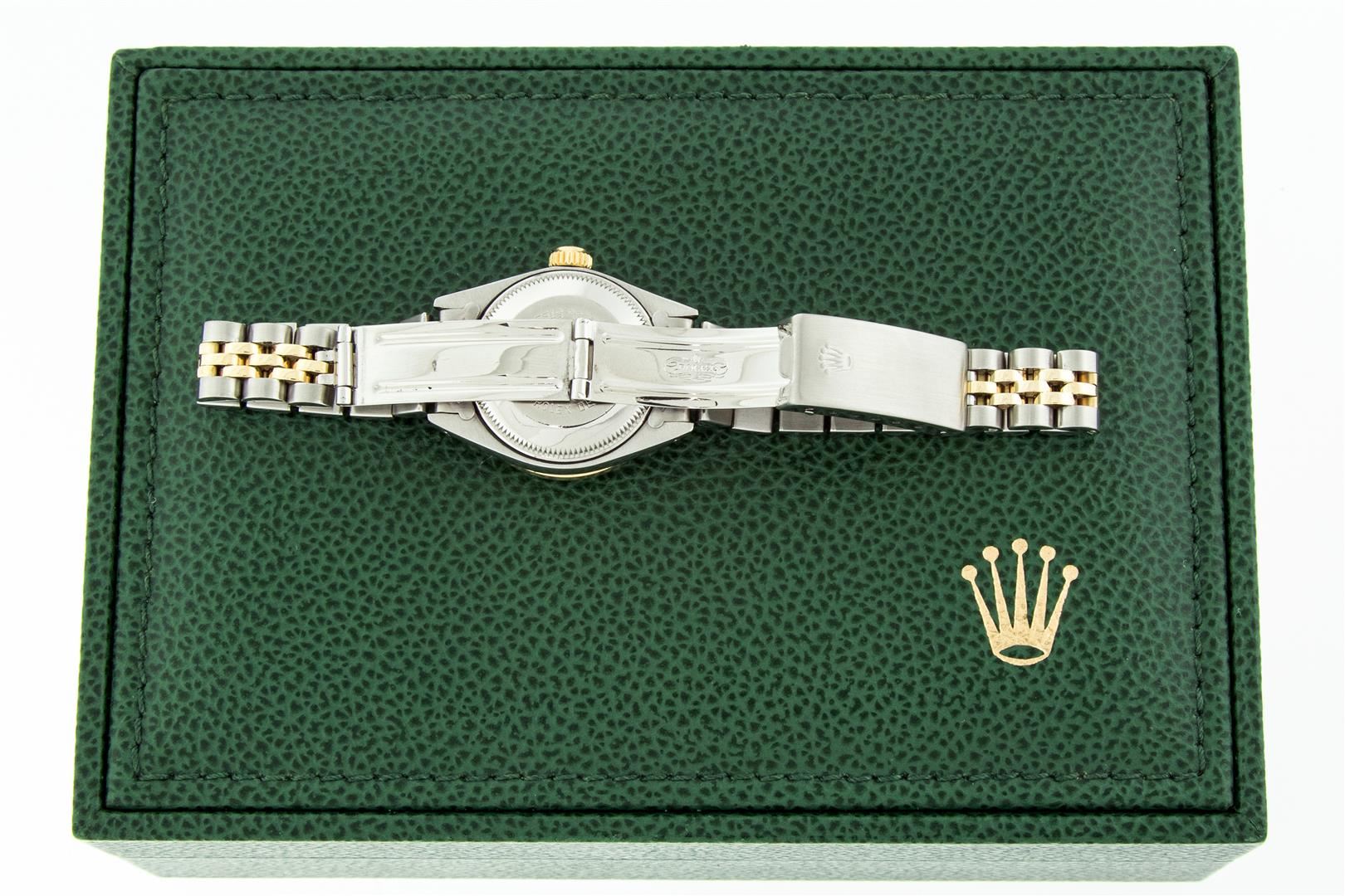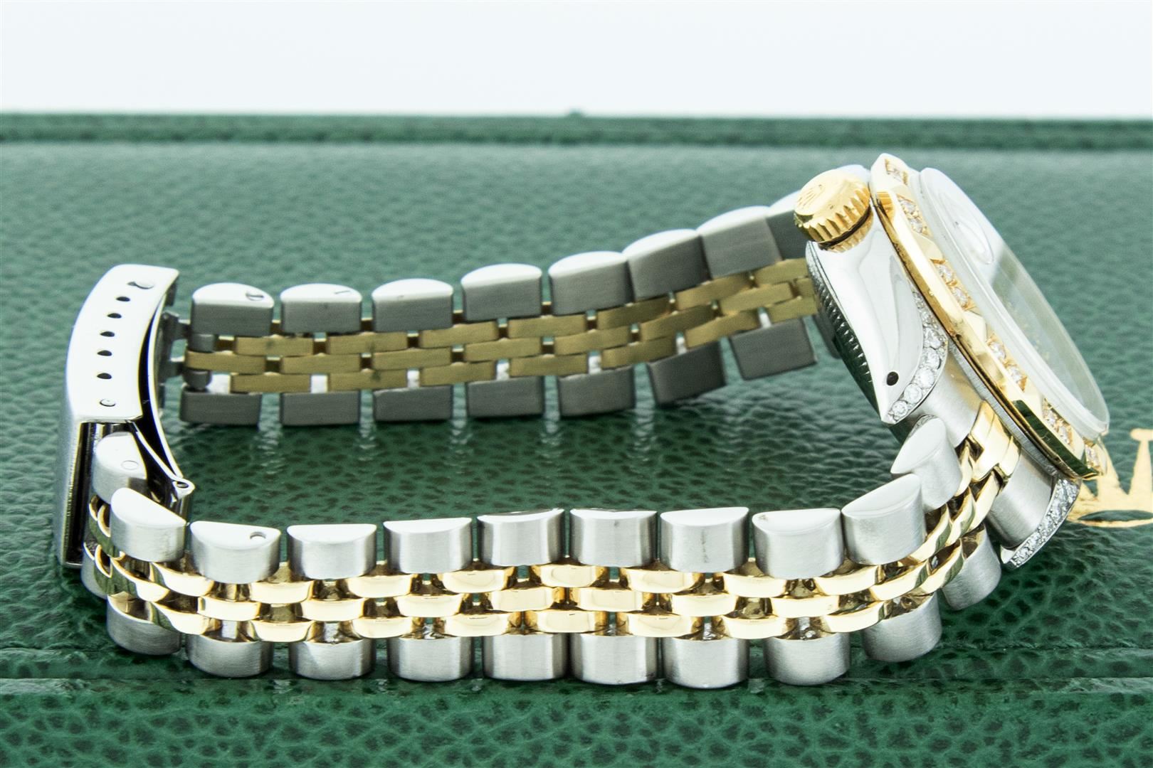 One Ladies Two Tone Rolex Datejust Polished, Serviced & Electronically Tested, Yellow Gold & Stainless Steel Case: 26mm, Yellow Gold Crown, Custom Diamond Lugs: 24 Diamonds On Lugs, Clarity: SI-VS, Color: G to H. Custom Bezel: New 18K Yellow Gold Pyramid Diamond Bezel, Diamond Count: 24 Diamonds, Clarity: SI-VS, Color: G to H. Custom Crystal: New Sapphire with Date Window. Custom Hands: New Luminescent Hands. Rolex Movement: Automatic Winding Movement. Custom Dial: Mother Of Pearl with Sapphire Hour Markers, Stone Count: 10 Sapphires + 33 Diamonds In Dial, Clarity: SI-VS, Color: G to H. Date Window: 3 O'Clock Position Date Display, Model: Datejust. Condition: G-6 Extra Fine. Rolex Bracelet: Two Tone Yellow Gold & Stainless Steel Jubilee Band. Bright Polish. 6.0 Inch Length, Adjustable. Standard Clasp, with Rolex Logo. This Watch Has Been Serviced Time Tested And Is In Excellent Condition It Is Free Of All Scratches And Dents. This Watch Comes with A Rolex Box.