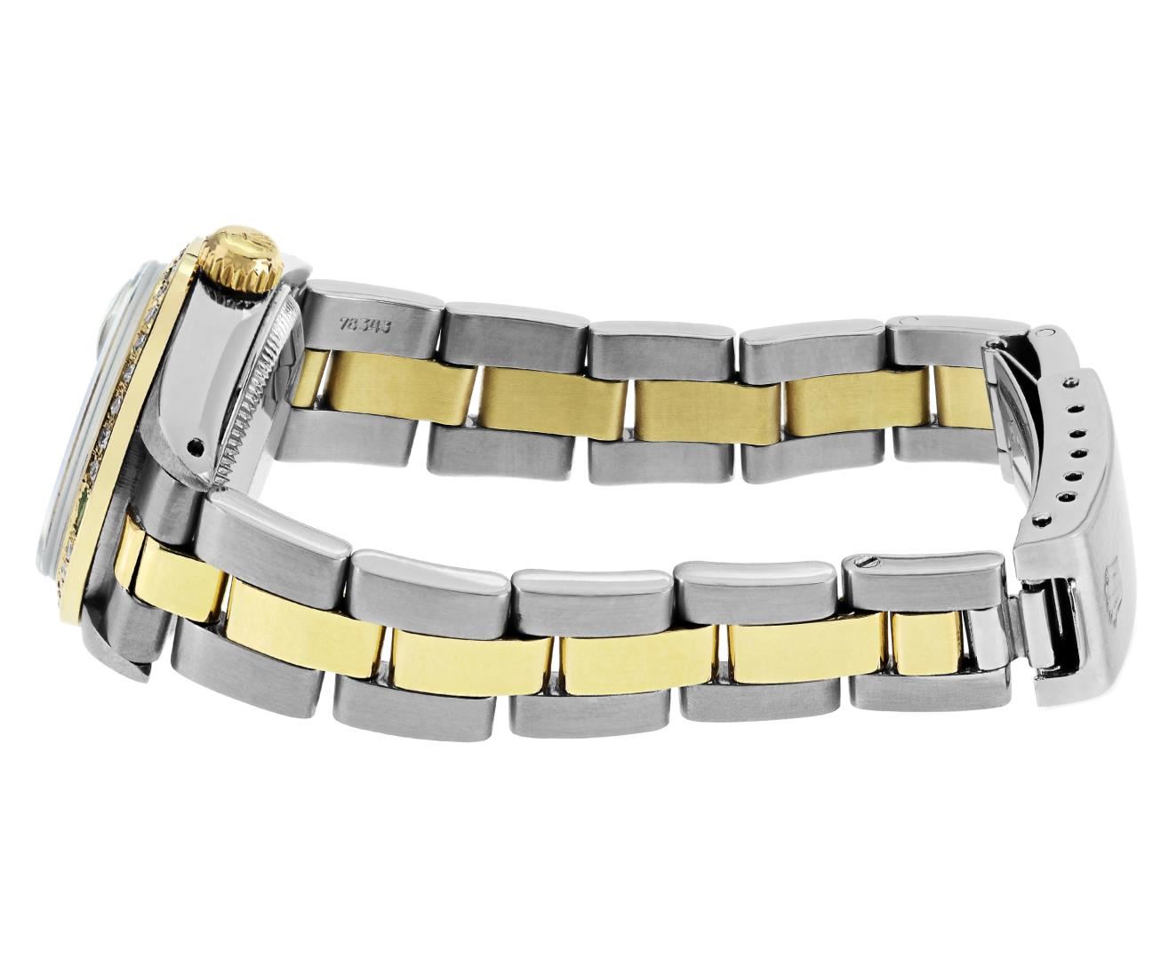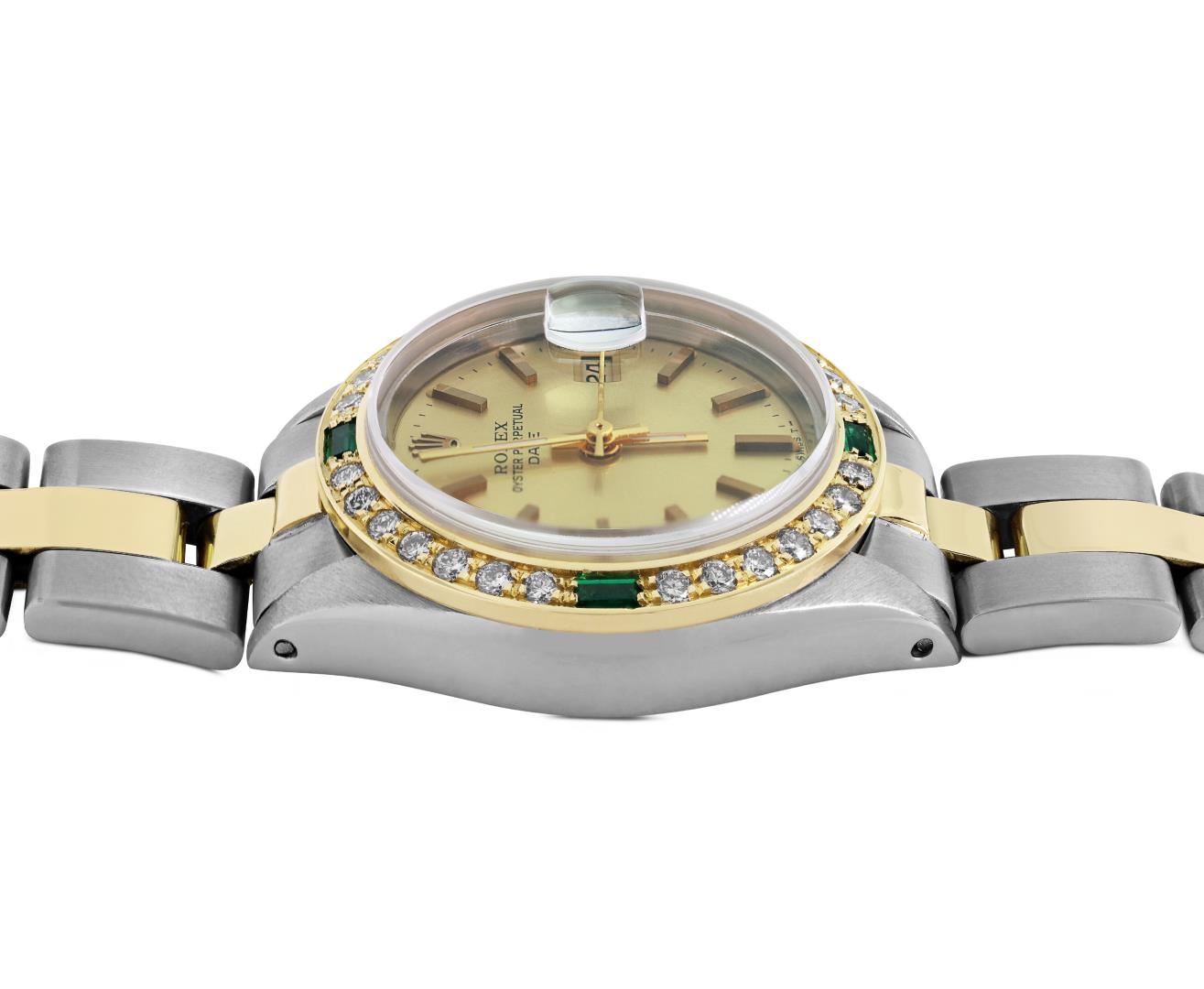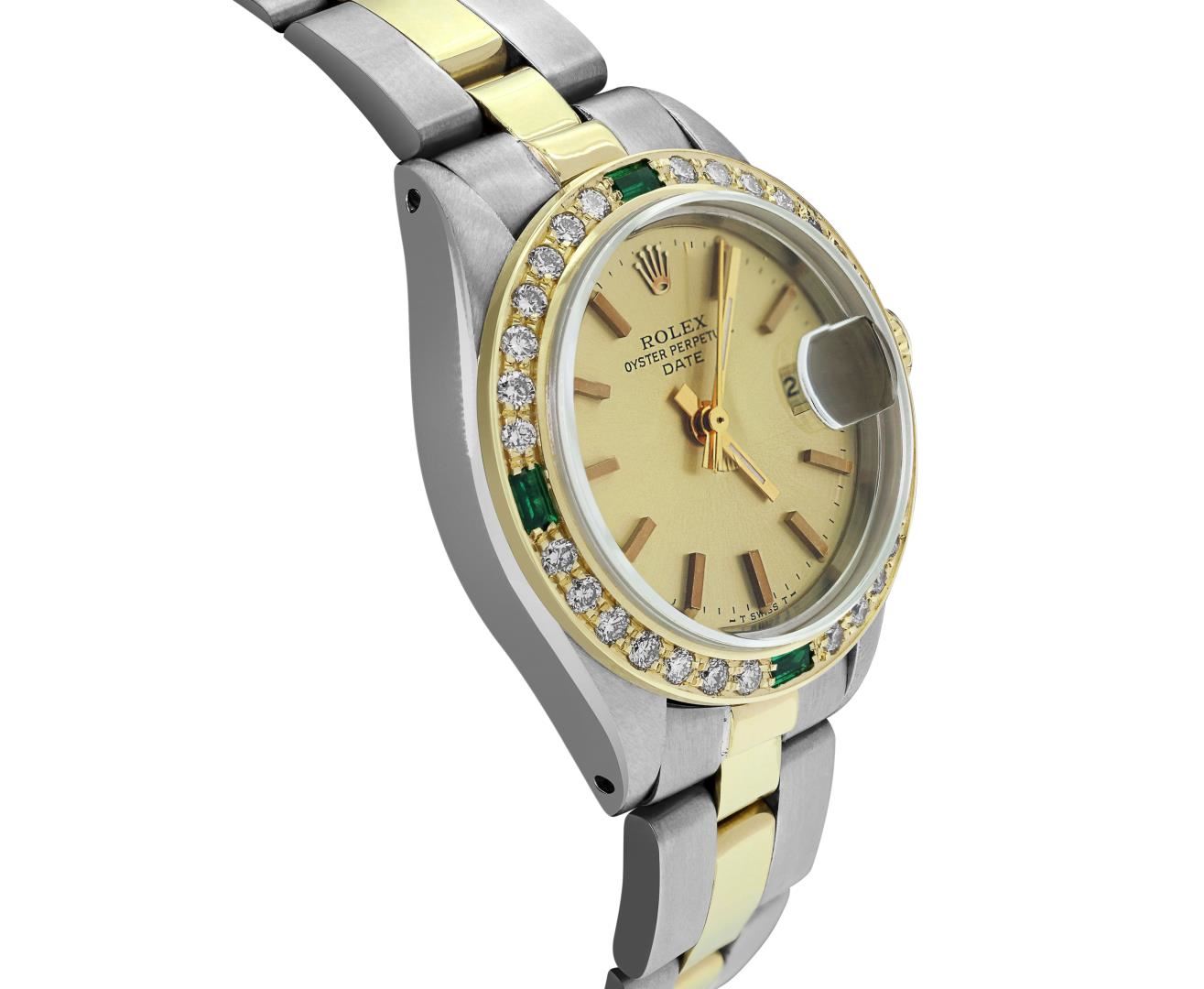 One Rolex Ladies Pre Owned Two Tone Yellow Gold & Stainless Steel Rolex Date Watch Polished, Serviced & Electronically Tested, Rolex Yellow Gold & Stainless Steel Case: 26mm, Rolex Yellow Gold Crown. Custom Bezel: New 18K Yellow Gold Emerald Beadset Diamond Bezel, Diamond + Gem Count: 36 Diamonds + 4 Emeralds, Clarity: SI-VS, Color: G to H. Custom Crystal: New Sapphire Crystal With Date Window. Custom Hands: New Luminescent Hands. Rolex Movement: Automatic Winding Movement 2030. Rolex Factory Dial: Champagne With Index Hour Markers And Dash Track. Date Window: 3 O'Clock Position Date Display, Condition: G-6 Extra Fine. Rolex Bracelet: Two Tone 14K Yellow Gold & Stainless Steel Oyster Band. Bright Polish. 6.0 Inch Length, Adjustable. Standard Clasp, With Rolex Logo. This Watch Has Been Serviced Time Tested And Is In Excellent Condition It Is Free Of All Scratches And Dents. This Watch Comes With A Rolex Box.