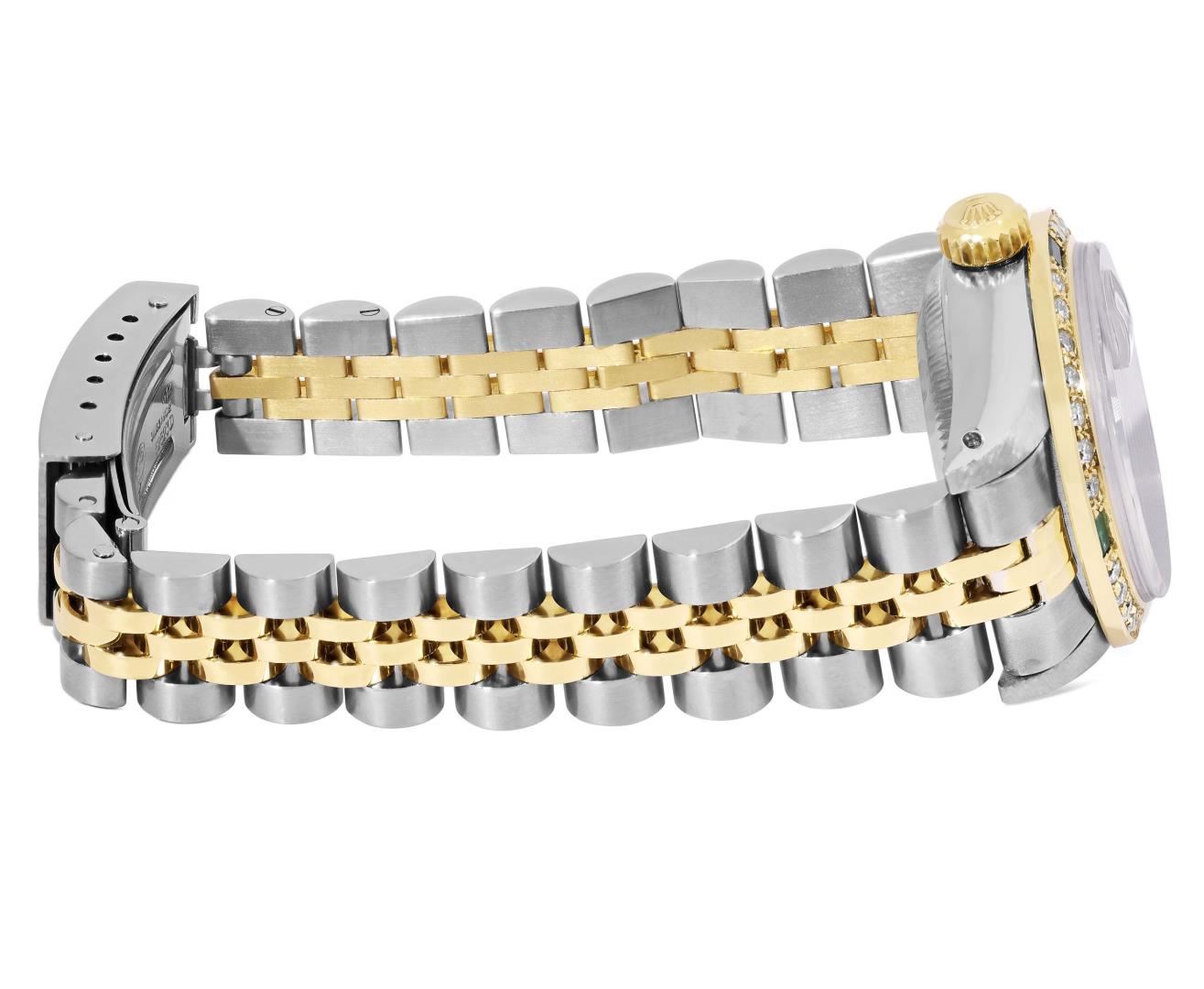 One Rolex Ladies Pre Owned Two Tone Yellow Gold & Stainless Steel Rolex Date Watch Polished, Serviced & Electronically Tested, Rolex Yellow Gold & Stainless Steel Case: 26mm, Rolex Yellow Gold Crown. Custom Bezel: New 18K Yellow Gold Emerald Beadset Diamond Bezel, Diamond + Gem Count: 36 Diamonds + 4 Emeralds, Clarity: SI-VS, Color: G to H. Custom Crystal: New Sapphire Crystal With Date Window. Custom Hands: New Luminescent Hands. Rolex Movement: Automatic Winding Movement 2030. Rolex Factory Dial: Champagne Dial With Baton Index Markers And Dash Track. Date Window: 3 O'Clock Position Date Display, Condition: G-6 Extra Fine. Rolex Bracelet: Two Tone 14K Yellow Gold & Stainless Steel Jubilee Band. Bright Polish & Satin Finish. 6.0 Inch Length, Adjustable. Standard Clasp, With Rolex Logo. This Watch Has Been Serviced Time Tested And Is In Excellent Condition It Is Free Of All Scratches And Dents. This Watch Comes With A Rolex Box.