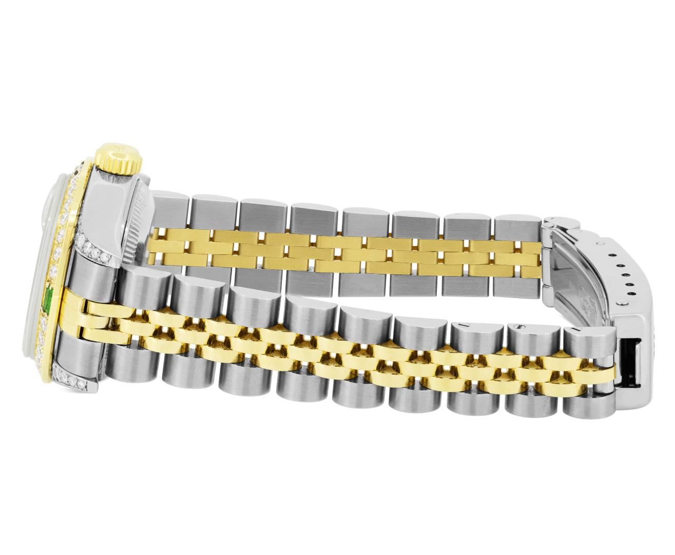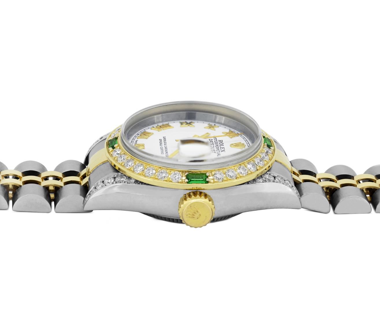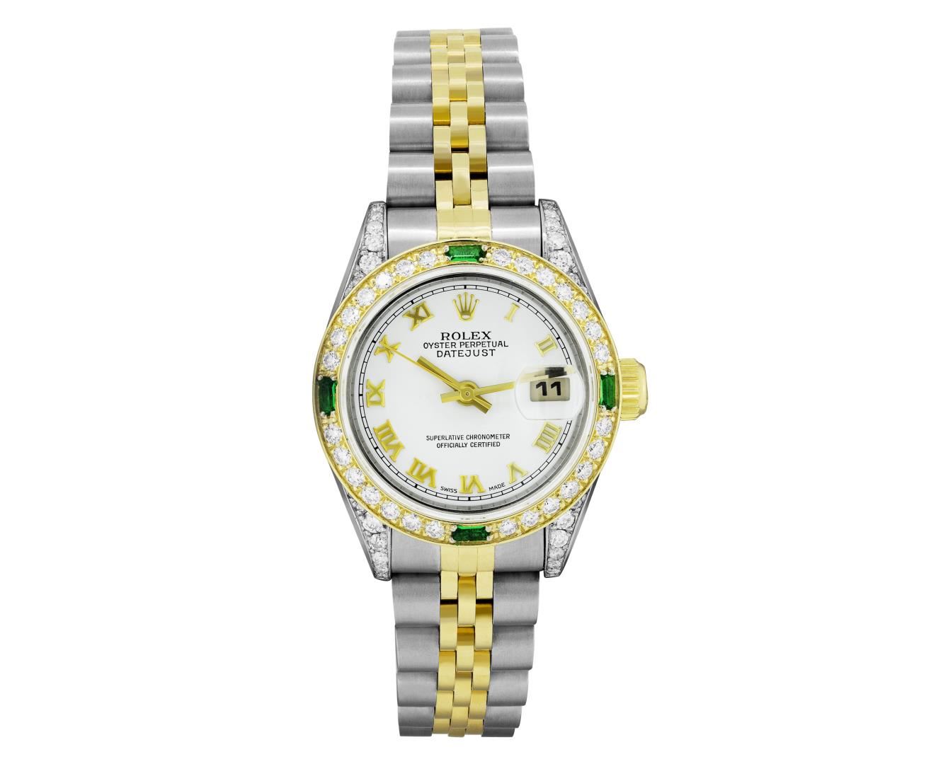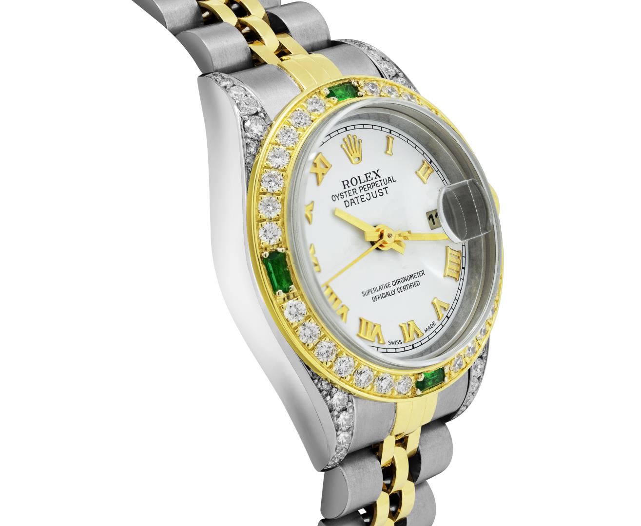 One Rolex Ladies Pre Owned Two Tone 18K Yellow Gold & Stainless Steel Rolex Datejust Polished, Serviced & Electronically Tested, Rolex Yellow Gold & Stainless Steel Case: 26mm, Custom Diamond Lugs: 24 Added Diamonds On Lugs. Rolex Yellow Gold Crown. Custom Bezel: New 18K Yellow Gold Emerald Beadset Diamond Bezel, Diamond + Gem Count: 36 Diamonds + 4 Emeralds, Clarity: SI-VS, Color: G to H. Crystal: Sapphire Crystal With Date Window. Hands: Custom Hands: New Luminescent Hands. Rolex Movement: Automatic Winding Movement 2235. Rolex Factory Dial: White With Roman Markers And Square Track. Date Window: 3 O'Clock Position Date Display, Condition: G-6 Extra Fine. Rolex Bracelet: Two Tone 18K Yellow Gold & Stainless Steel Jubilee Band. Bright Polish & Satin Finish. 6.0 Inch Length, Adjustable. Standard Clasp, With Rolex Logo. This Watch Has Been Serviced And Time Tested. It Is In Excellent Condition, Free Of All Scratches And Dents. The Watch Comes With A Rolex Box.