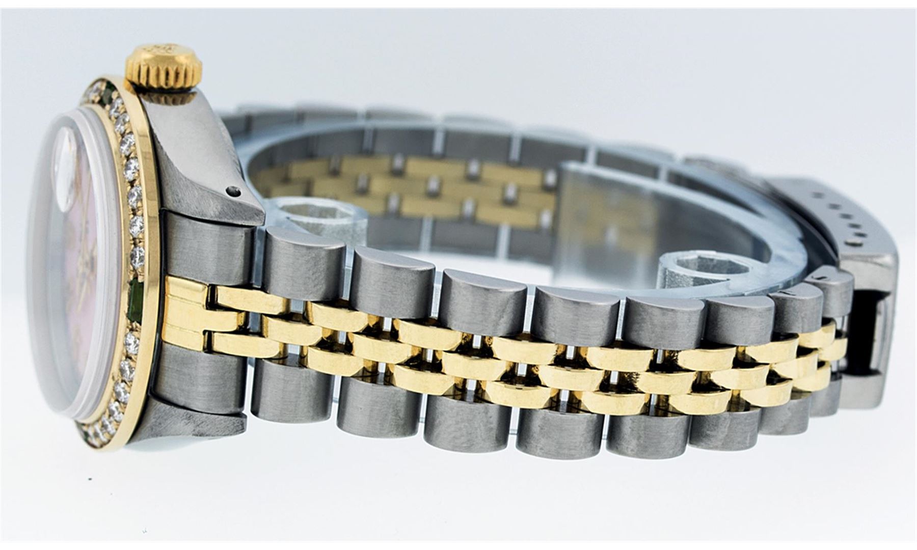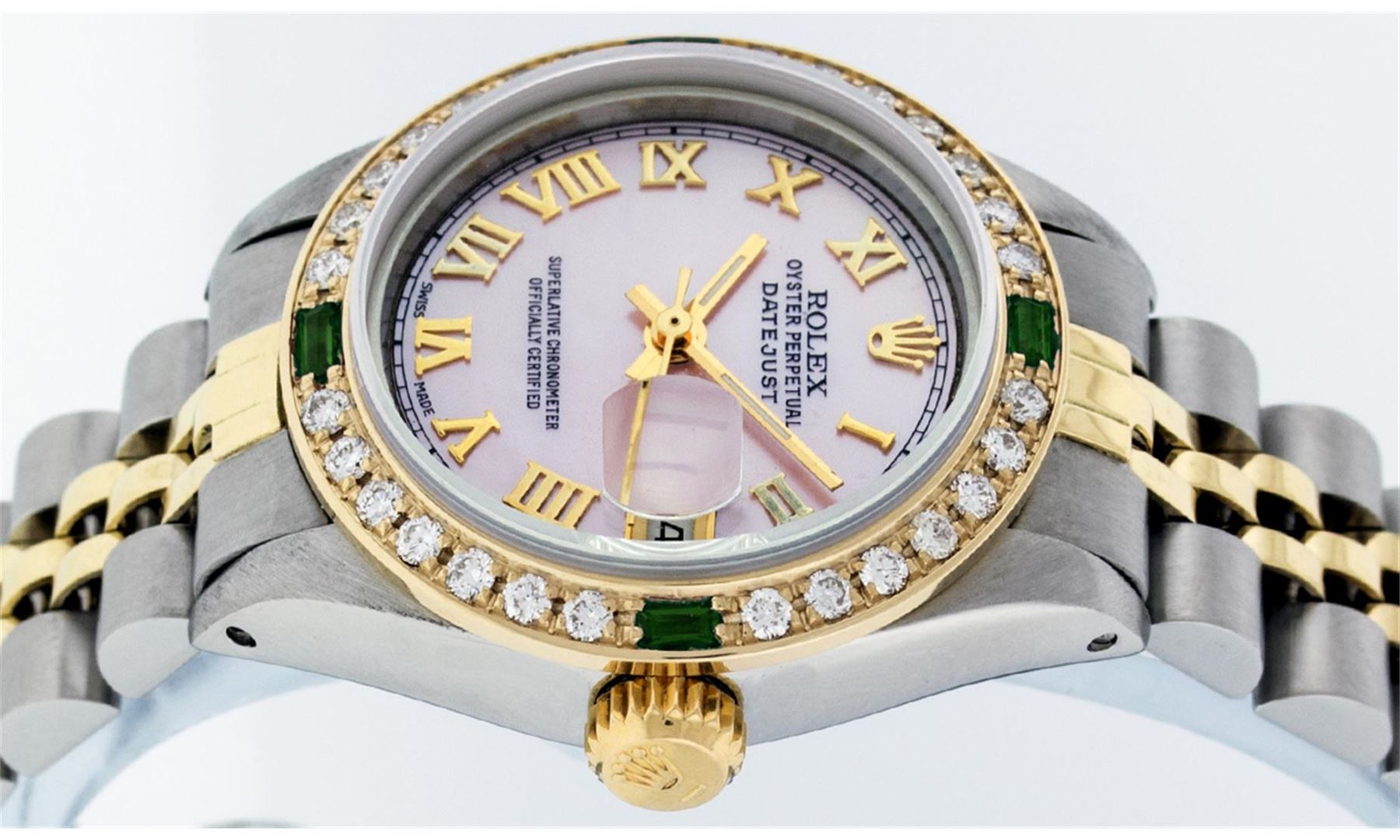 One Ladies Two Tone Rolex Datejust Polished, Serviced & Electronically Tested, 14K Yellow Gold & Stainless Steel Case:26mm, 14K Yellow Gold Crown, Custom Bezel: 18K Yellow Gold Emerald Beadset Diamond Bezel, Diamond Count: 28 Diamonds + 4 Emeralds Total Weight .70 Carat, Clarity: Si-VS, Color: G to H. Custom Crystal: Synthetic Sapphire Cyclops Lens. Movement: Automatic Winding Movement Caliber 2030. Custom Dial: Light Pink Mother Of Pearl Roman Dial With Square Track. Date Window: 3 O'Clock Position Date Display, Model: Datejust. Condition: G-6 Extra Fine. Bracelet: Two Tone 14K Yellow Gold & Stainless Steel Jubilee Band. Bright Polish. 5.5 Inch Length, Adjustable. Standard Clasp, With Rolex Logo.