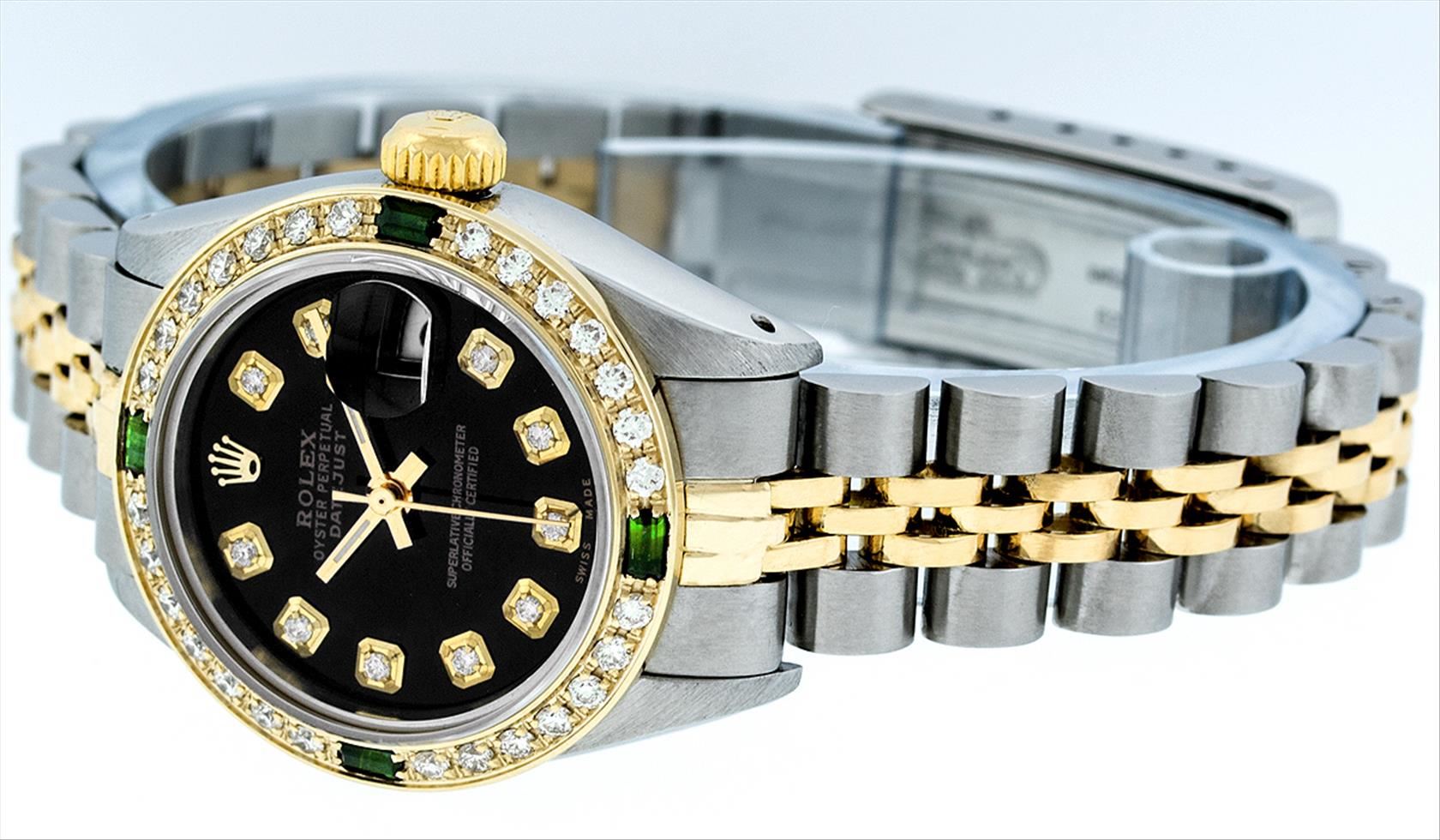 One Ladies Two Tone Rolex Datejust Polished, Serviced & Electronically Tested, 14K Yellow Gold & Stainless Steel Case:26mm, 14K Yellow Gold Crown, Custom Bezel: 18K Yellow Gold Emerald Beadset Diamond Bezel, Diamond Count: 28 Diamonds + 4 Emeralds Total Weight .70 Carat, Clarity: Si-VS, Color: G to H. Custom Crystal: Synthetic Sapphire Cyclops Lens. Movement: Automatic Winding Movement Caliber 2030. Custom Dial: Black With Diamond Hour Markers, Diamond Count: 10 Diamonds In Dial. Diamond Color: G To H, Clarity: SI-VS. Date Window: 3 O'Clock Position Date Display, Model: Datejust. Condition: G-6 Extra Fine. Bracelet: Two Tone 14K Yellow Gold & Stainless Steel Jubilee Band. Bright Polish. 5.5 Inch Length, Adjustable. Standard Clasp, With Rolex Logo.