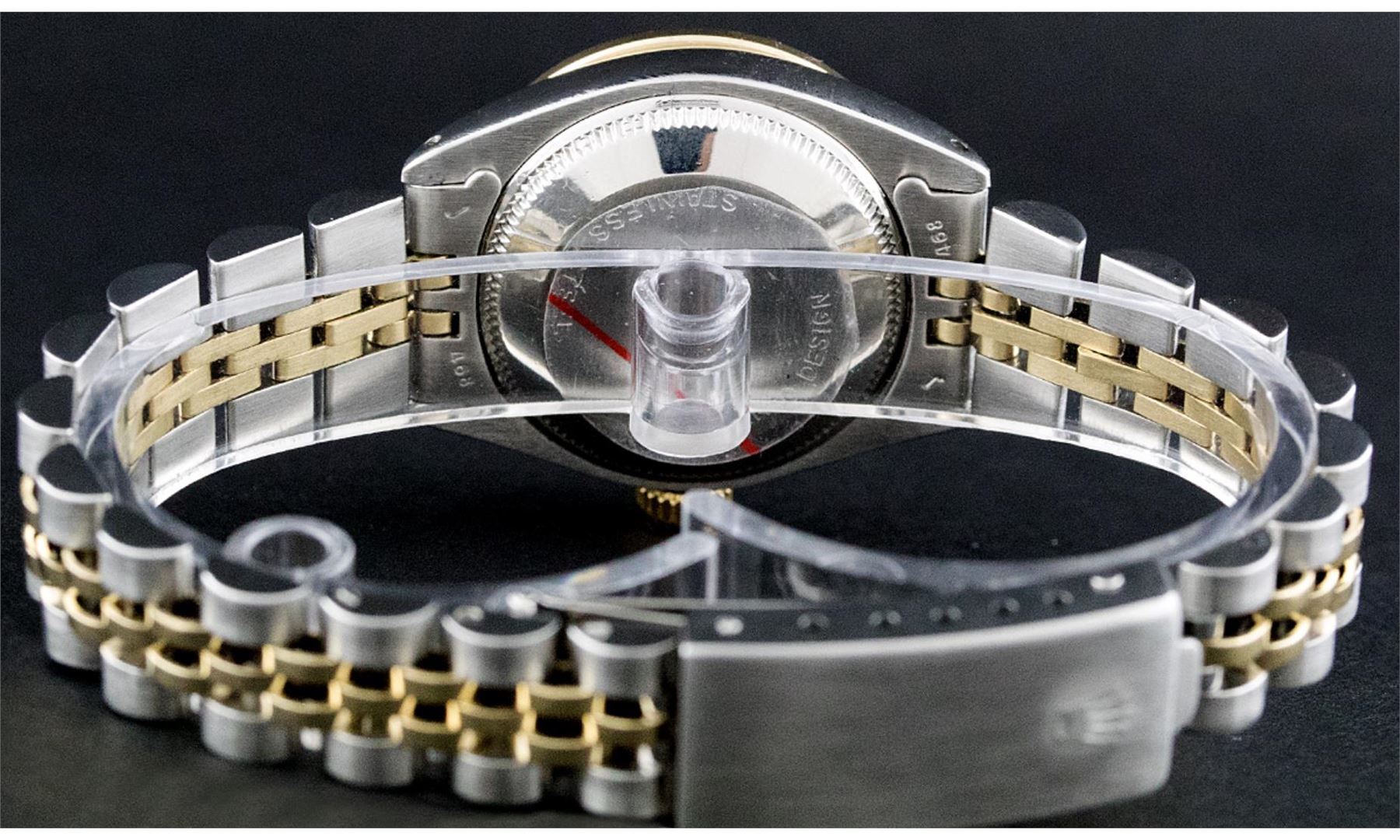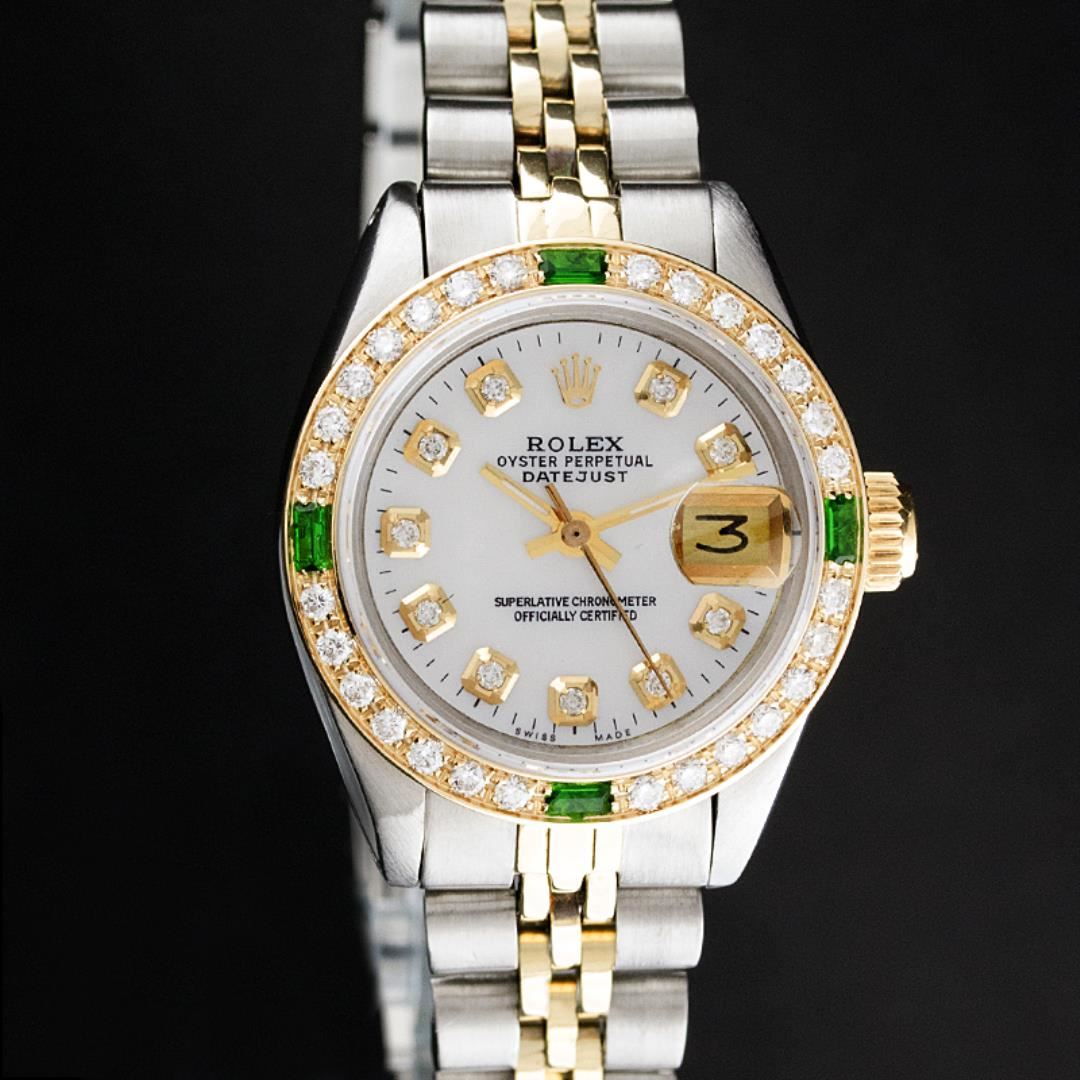 One Ladies Pre Owned Quickset Two Tone Yellow Gold And Stainless Steel Rolex Datejust Polished, Serviced And Electronically Tested, Yellow Gold And Stainless Steel Case: 26mm, Yellow Gold Crown, Custom Bezel: New 18K Yellow Gold Emerald Beadset Diamond Bezel, Diamond + Gem Count: 28 Diamonds + 4 Emeralds. Custom Crystal: New Sapphire With Date Window. Custom Hands: New Luminescent Hands. Rolex Movement: Automatic Winding Movement 2135. Custom Dial: Custom White Dial With Added Diamond Hour Markers, Diamond Count: 10 Diamond On Dial. Date Window: 3 O'Clock Position Date Display, Model: Datejust, Condition: G-6 Extra Fine. Rolex Bracelet: Two Tone Yellow Gold And Stainless Steel Jubilee Band. Bright Polish. 6.0 Inch Length, Adjustable. Standard Clasp, With Rolex Logo. This Watch Has Been Serviced Time Tested And Is In Excellent Condition It Is Free Of All Scratches And Dents.