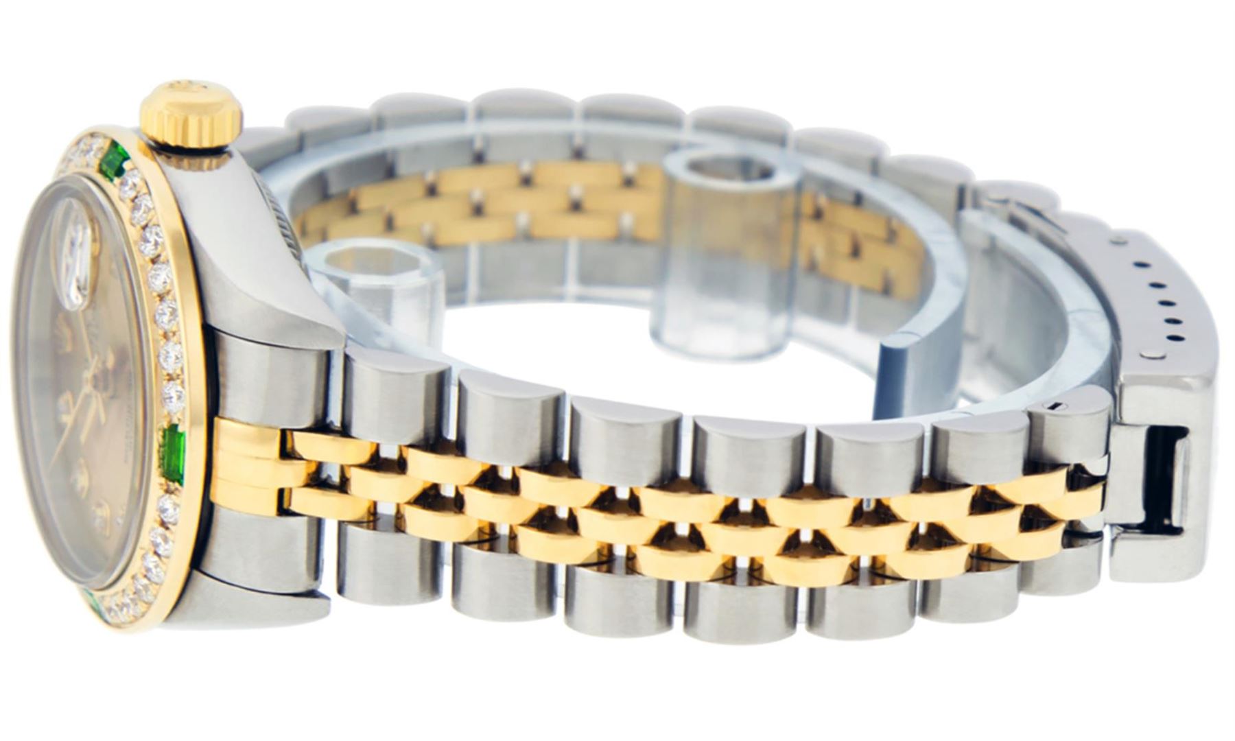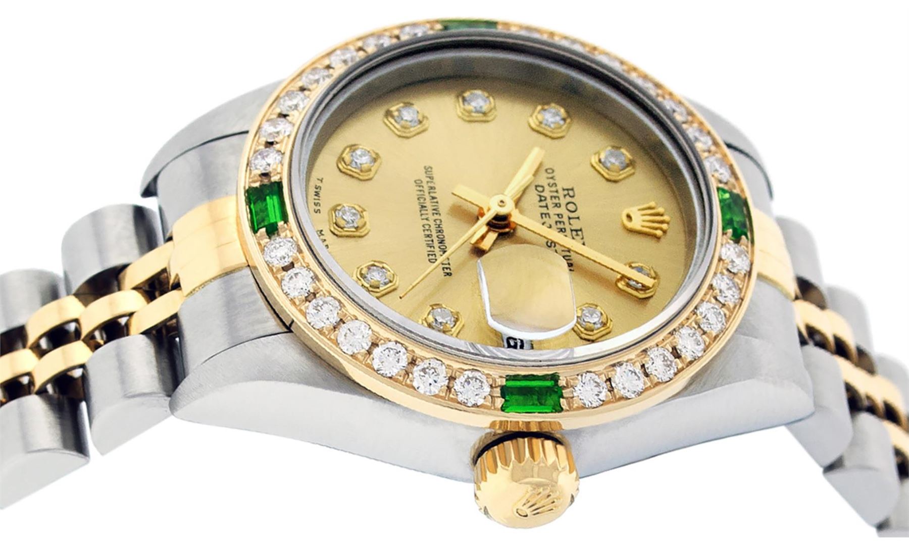 One Ladies Pre Owned 18K Two Tone Yellow Gold And Stainless Steel Rolex Datejust Polished, Serviced And Electronically Tested, 18K Yellow Gold And Stainless Steel Case: 26mm, 18K Yellow Gold Crown, Custom Bezel: New 18K Yellow Gold Emerald Beadset Diamond Bezel, Diamond + Gem Count: 28 Diamonds + 4 Emeralds. Custom Crystal: New Sapphire With Date Window. Custom Hands: New Luminescent Hands. Rolex Movement: Quickset Automatic Winding Movement 2235. Custom Dial: Custom Champagne Dial With Added Diamonds, Diamond Count: 10 On Dial. Date Window: 3 O'Clock Position Date Display, Model: Datejust, Condition: G-6 Extra Fine. Rolex Bracelet: Two Tone 18K Yellow Gold And Stainless Steel Jubilee Band. Bright Polish. 6.0 Inch Length, Adjustable. Standard Clasp, With Rolex Logo. This Watch Has Been Serviced Time Tested And Is In Excellent Condition It Is Free Of All Scratches And Dents.