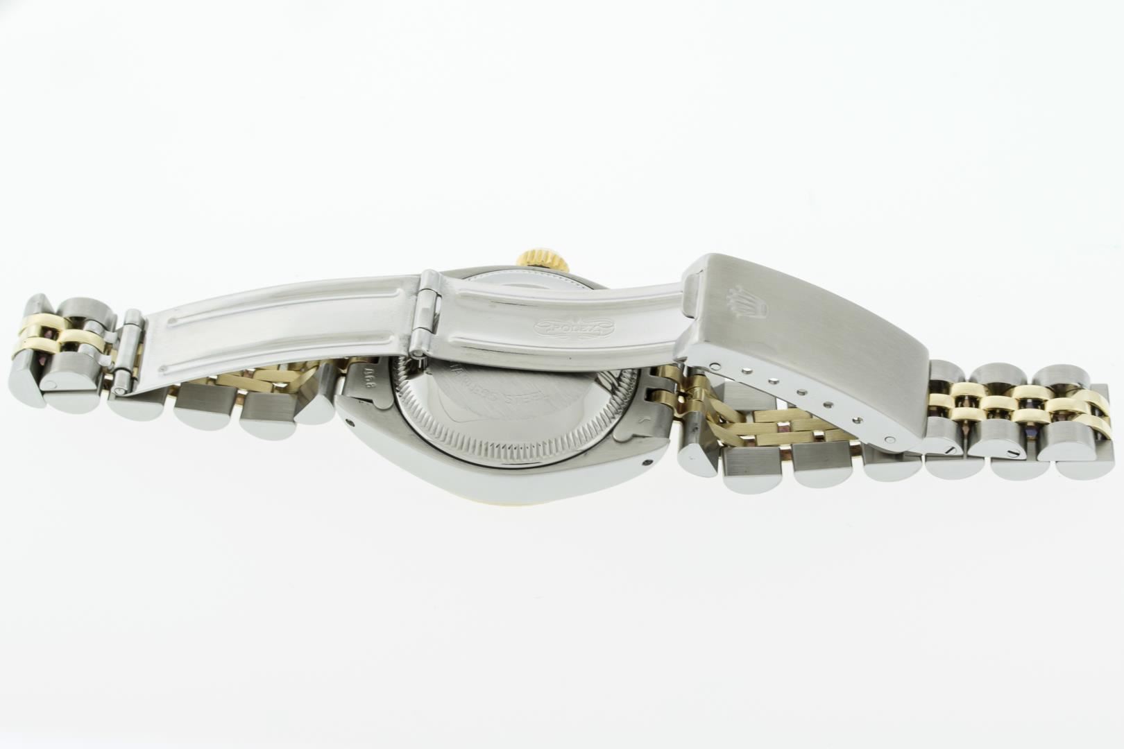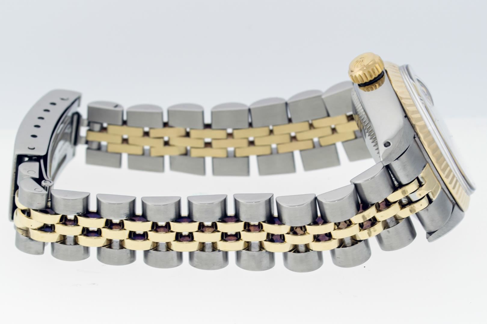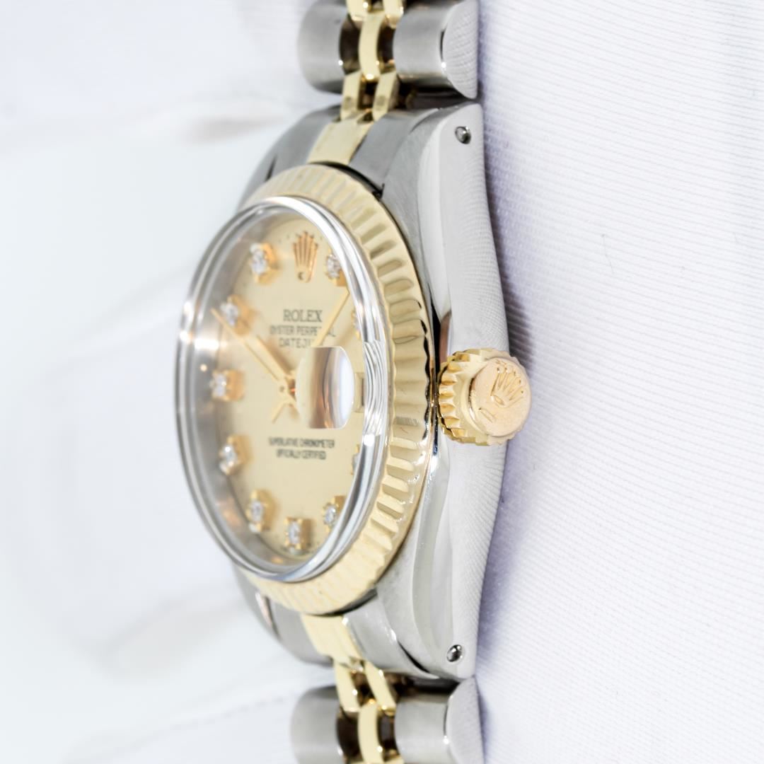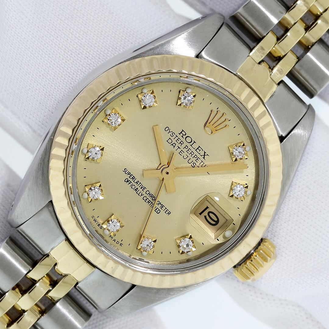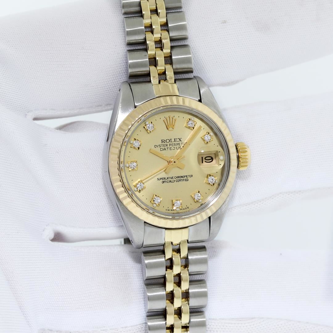 One Ladies Quickset Pre Owned Two Tone 18K Yellow Gold & Stainless Steel Rolex Datejust Polished, Serviced & Electronically Tested, Rolex Yellow Gold & Stainless Steel Case: 26mm, Rolex Yellow Gold Crown, Rolex Bezel: Rolex 18K Yellow Gold Fluted Bezel. Crystal: Sapphire Crystal With Date Window. Hands: Solid Hands. Rolex Movement: Quickset Automatic Winding Movement. Rolex Factory Dial: Champagne With Diamond Hour Markers And Dash Track, Diamond Count: 10 Diamonds In Dial. Date Window: 3 O'Clock Position Date Display, Model: Quickset Datejust. Condition: G-6 Extra Fine. Rolex Bracelet: Two Tone 18K Yellow Gold & Stainless Steel Jubilee Band. Bright Polish. 6.0 Inch Length, Adjustable. Standard Clasp, With Rolex Logo. This Watch Has Been Serviced Time Tested And Is In Excellent Condition It Is Free Of All Scratches And Dents.