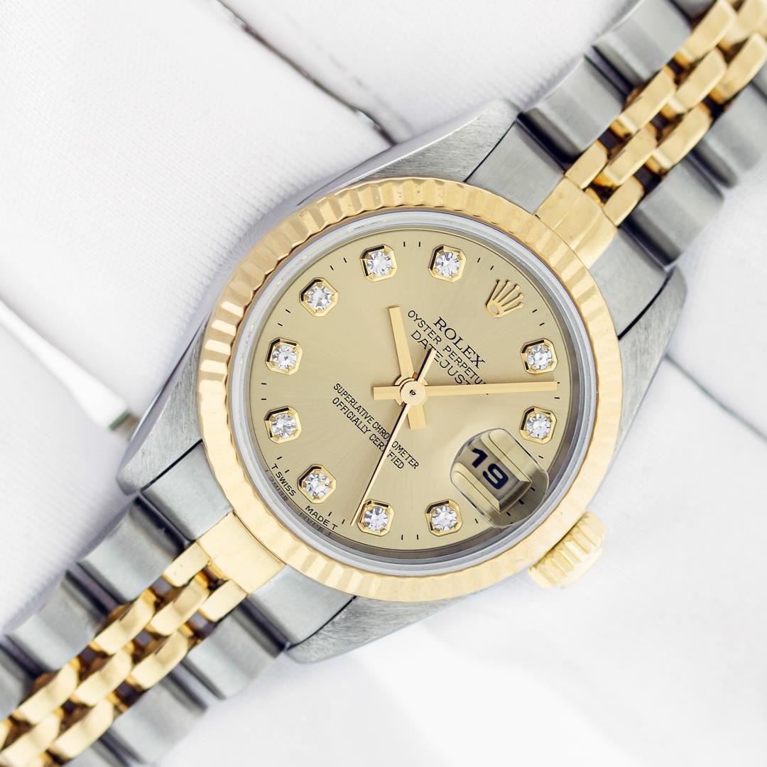 One Ladies Quickset Pre Owned Two Tone 18K Yellow Gold & Stainless Steel Rolex Datejust Polished, Serviced & Electronically Tested, Rolex Yellow Gold & Stainless Steel Case: 26mm, Rolex Yellow Gold Crown, Rolex Bezel: Rolex Yellow Gold Fluted Bezel. Crystal: Sapphire Crystal With Date Window. Hands: Solid Hands. Rolex Movement: Quickset Automatic Winding Movement. Rolex Factory Dial: Champagne With Diamond Hour Markers And Dash Track, Diamond Count: 10 Diamonds In Dial. Date Window: 3 O'Clock Position Date Display, Model: Quickset Datejust. Condition: G-6 Extra Fine. Rolex Bracelet: Two Tone 18K Yellow Gold & Stainless Steel Jubilee Band. Bright Polish. 6.0 Inch Length, Adjustable. Standard Clasp, With Rolex Logo. This Pre Owned Watch Has Been Serviced Time Tested And Is In Excellent Condition It Is Free Of All Scratches And Dents. This Watch Comes With A Rolex Box, Booklets, And Wallet.