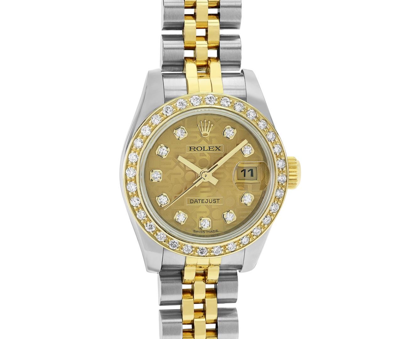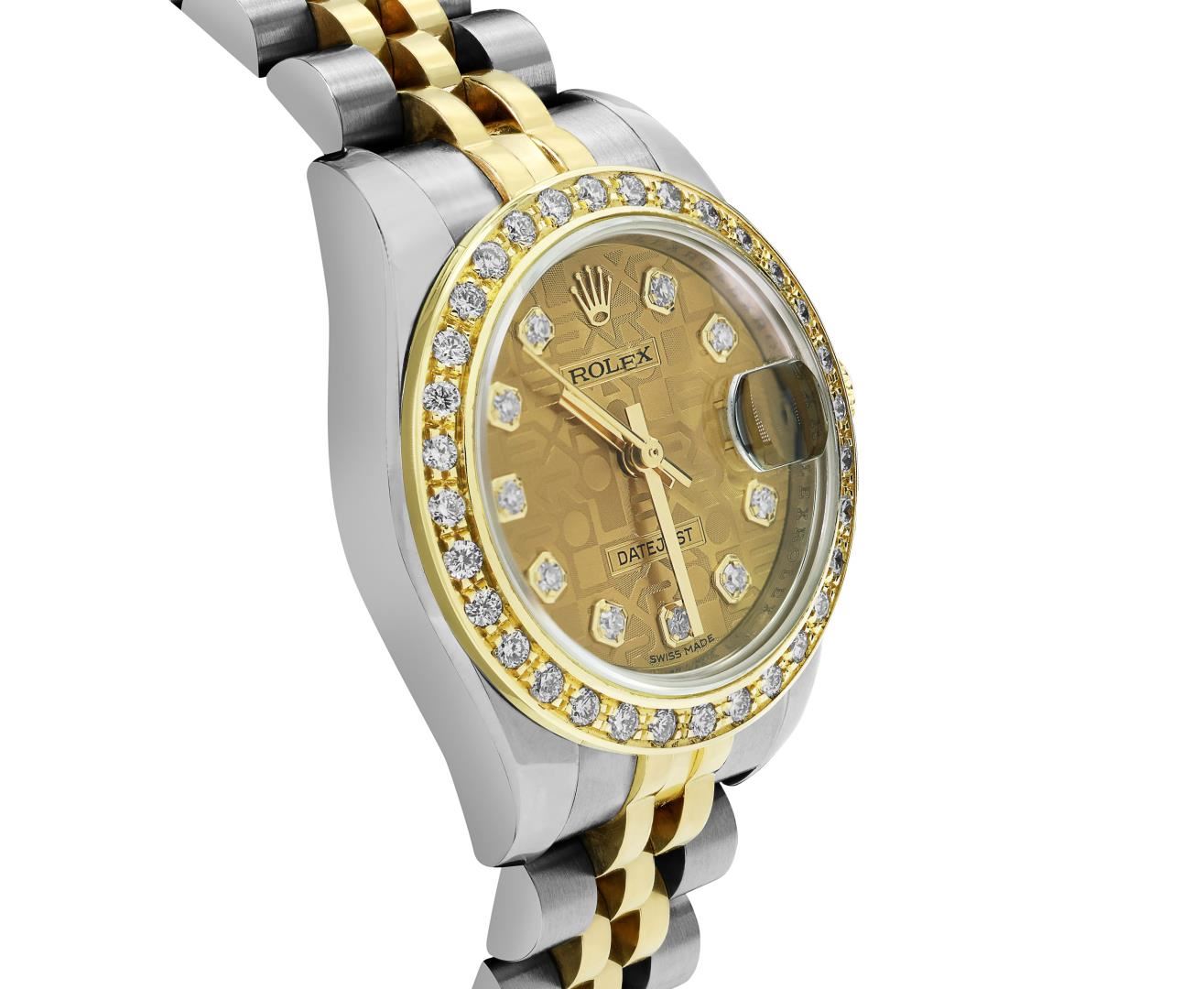 One Rolex Ladies Pre Owned Two Tone 18K Yellow Gold & Stainless Steel Rolex Datejust Polished, Serviced & Electronically Tested, Rolex Yellow Gold & Stainless Steel Case: 26mm, Rolex Yellow Gold Crown. Custom Bezel: New 18K Yellow Gold Beadset Diamond Bezel, Diamond Count: 32 Diamonds On Bezel. Crystal: Sapphire Crystal With Date Window. Hands: Solid Hands. Rolex Movement: 2235 Automatic Winding Movement. Rolex Factory Dial: Factory Champagne Jubilee Diamond Dial. Date Window: 3 O'Clock Position Date Display, Condition: G-6 Extra Fine. Rolex Bracelet: Two Tone 18K Yellow Gold & Stainless Steel Jubilee Band With Hidden Clasp. Bright Polish & Satin Finish. 6.0 Inch Length, Adjustable. Hidden Clasp, With Rolex Logo. This Watch Has Been Serviced Time Tested And Is In Excellent Condition It Is Free Of All Scratches And Dents. This Watch Comes With A Rolex Box.