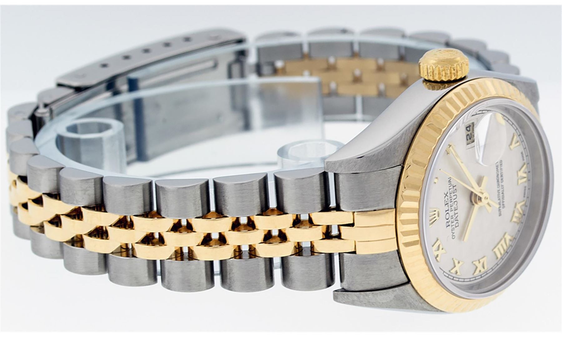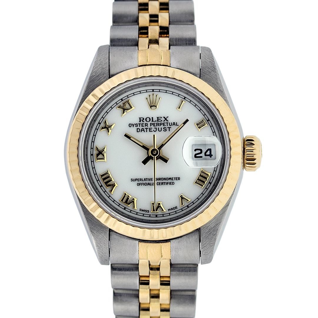 One Ladies Pre Owned 18K Two Tone Rolex Datejust Polished, Serviced & Electronically Tested, Rolex 18K Yellow Gold & Stainless Steel, Rolex Case: 26mm, Rolex 18K Yellow Gold Crown, Bezel: 18K Yellow Gold Fluted Bezel. Custom Crystal: New Scratch Resistant Sapphire Crystal With Cyclops Lens. Rolex Hands: Luminescent Hands. Rolex Movement: Automatic Winding Movement. Rolex Dial: White Roman Dial With Square Track. Date Window: 3 O'Clock Position Date Display, Model: Datejust Caliber 2230. Condition: G-6 Extra Fine. Rolex Bracelet: Two Tone 18K Yellow Gold & Stainless Steel Jubilee Band. Bright Polish. 6.0 Inch Length, Adjustable. Standard Clasp, With Rolex Logo. This Watch Has Been Serviced Time Tested And Is In Excellent Condition It Is Free Of All Scratches And Dents.