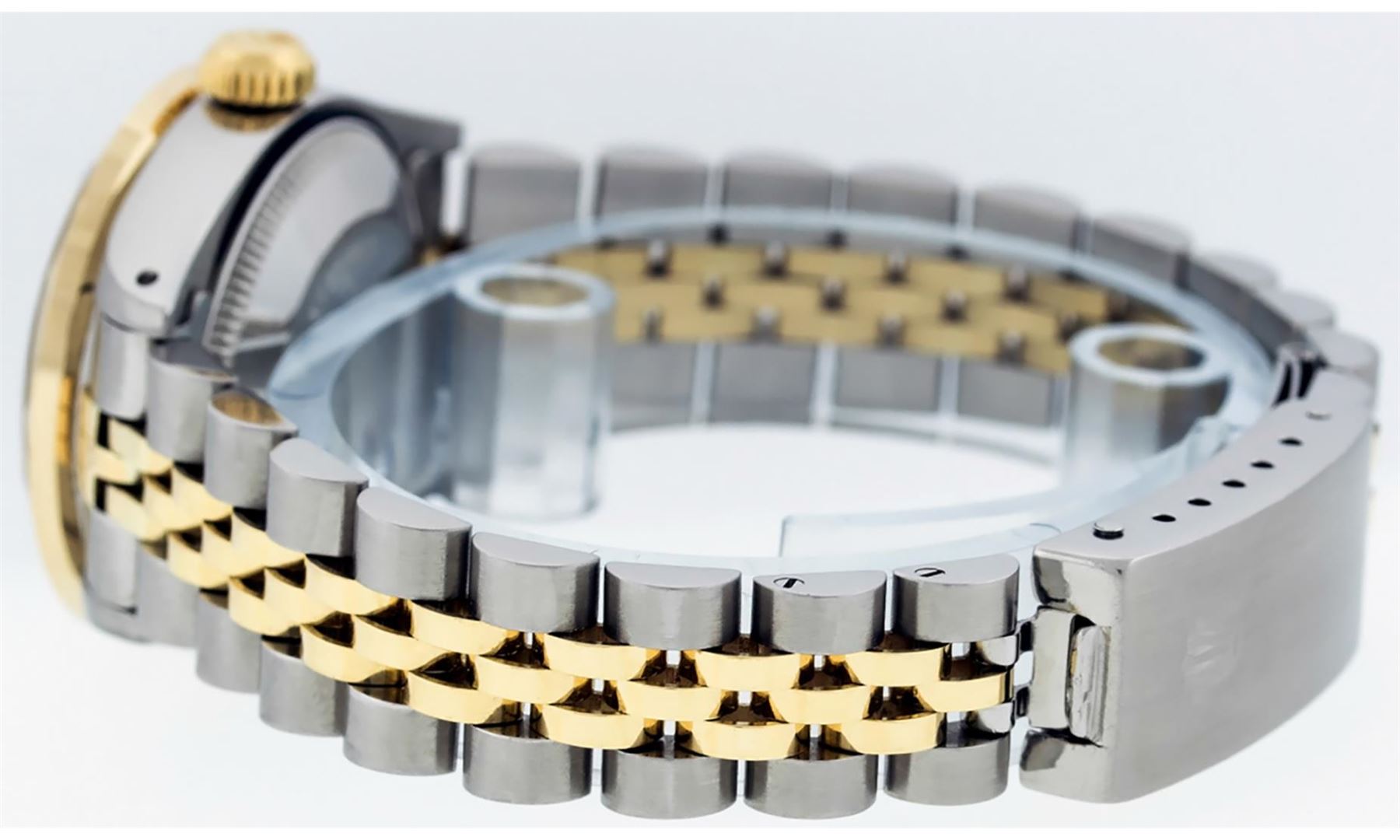 One Ladies Pre Owned 14K Two Tone Yellow Gold & Stainless Steel Rolex Polished, Serviced & Electronically Tested, 14K Yellow Gold & Stainless Steel Case: 26mm, Yellow Gold Crown, Custom Bezel: New 18K Yellow Gold Pyramid Diamond Bezel, Diamond Count: 24 Diamonds In Bezel. Total Weight .50 Carat, Clarity: SI-VS, Color: G to H. Custom Crystal: New Sapphire With Magnified Date Window. Custom Hands: New Luminescent Hands. Rolex Movement: Automatic Winding Movement 2030. Custom Dial: Slate Grey With Roman Hour Markers. Date Window: 3 O'Clock Position Date Display, Model: Datejust. Condition: G-6 Extra Fine The Watch Is In Very Good Condition Free Of All Scratches And Dents. Bracelet: Two Tone 14K Yellow Gold & Stainless Steel Jubilee. Bright Polish. 6.0 Inch Length, Adjustable. Standard Clasp, With Rolex Logo. This Watch Has Been Serviced Time Tested And Is In Excellent Condition It Is Free Of All Scratches And Dents.