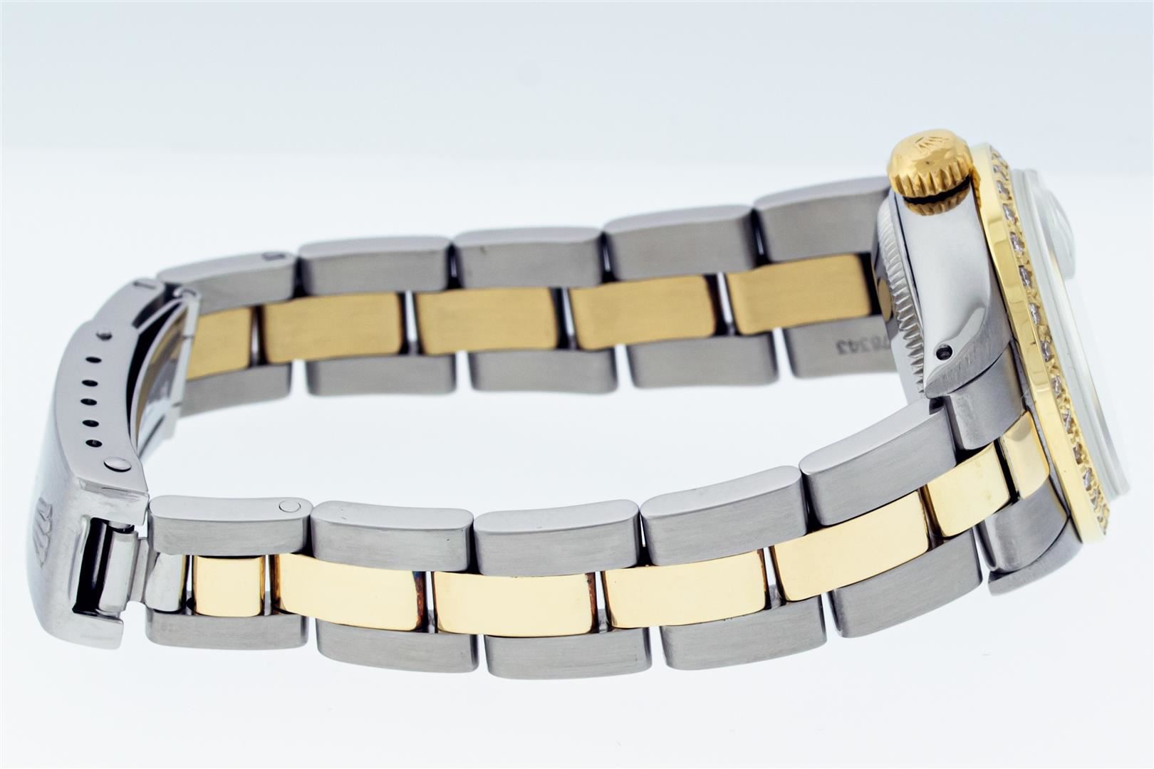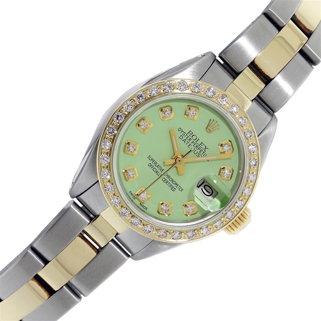 One Ladies Two Tone Rolex Datejust Polished, Serviced & Electronically Tested, Rolex Yellow Gold & Stainless Steel Case: 26mm, Rolex Yellow Gold Crown, Custom Bezel: New 18K Yellow Gold Diamond Bezel, Diamond Count: 32 Diamonds, Clarity: SI-VS, Color: G to H. Custom Crystal: New Sapphire With Magnified Date Window. Custom Hands: New Gold Hands. Rolex Movement: Automatic Winding Movement. Custom Dial: Refinished Green With Added Diamonds On Dial, Diamond Count: 10 Diamonds On Dial, G To H In Color, VS Clarity. Date Window: 3 O'clock Position Date Display, Model: Datejust, Condition: G-6 Extra Fine. Rolex Bracelet: Two Tone Yellow Gold & Stainless Steel Oyster Band. Bright Polish. 6.0 Inch Length, Adjustable. Standard Clasp, With Rolex Logo. This Pre Owned Watch Has Been Serviced Time Tested And Is In Excellent Condition It Is Free Of All Scratches And Dents.