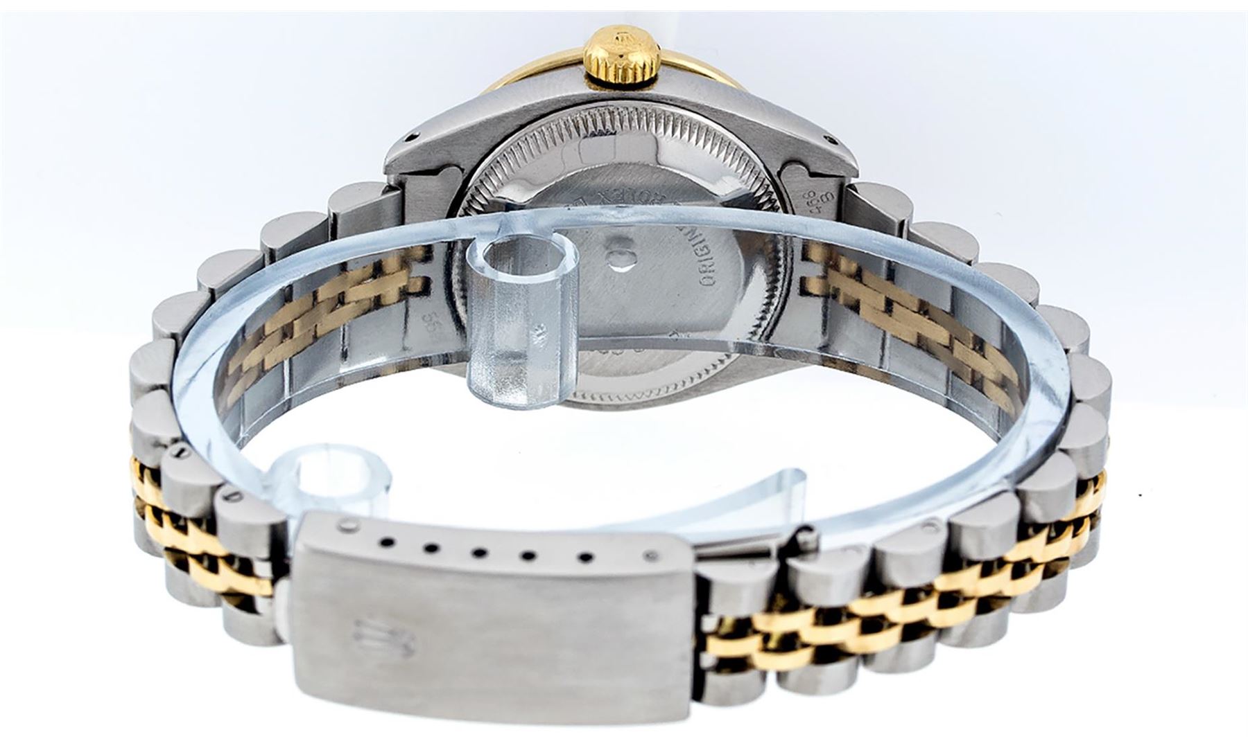 One Ladies 14K Two Tone Rolex Datejust Polished, Serviced & Electronically Tested, 14K Yellow Gold & Stainless Steel Case: 26mm, 14K Yellow Gold Crown, Custom Bezel: New 18K Yellow Gold Emerald Beadset Diamond Bezel, Diamond + Gem Count: 28 Diamonds + 4 Emeralds, Total Weight .70 Carat, Clarity: SI-VS, Color: G to H. Custom Crystal: New Synthetic Sapphire Cyclops Lens. Custom Hands: New Luminescent Hands. Movement: Automatic Winding Movement Caliber 2030. Custom Dial: Green Vignette Dial Set With Diamond Hour Markers, Diamond Count: 10 Diamond in Dial, G To H In Color, SI-VS Clarity. Date Window: 3 O'clock Position Date Display, Model: Datejust, Condition: G-6 Extra Fine. Bracelet: Two Tone 14K Yellow Gold & Stainless Steel Jubilee. Bright Polish. 6.0 Inch Length, Adjustable. Standard Clasp, With Rolex Logo. This Watch Has Been Serviced Time Tested And Is In Excellent Condition It Is Free Of All Scratches And Dents.