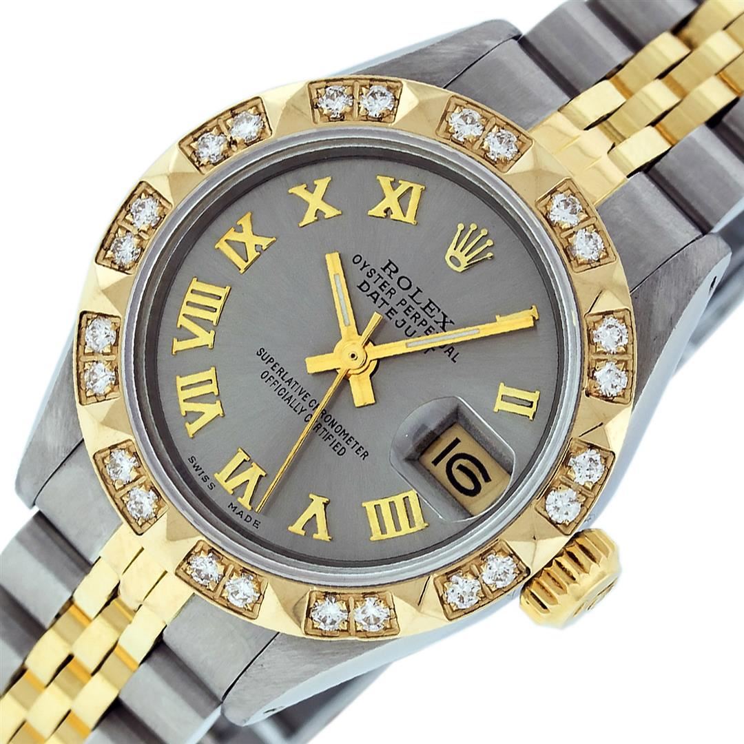 One Ladies Two Tone Rolex Datejust Polished, Serviced & Electronically Tested, Yellow Gold & Stainless Steel Case: 26mm, Yellow Gold Crown, Custom Bezel: New 18K Yellow Gold Pyramid Diamond Bezel, Diamond Count: 24 Diamonds In Bezel. Total Weight .50 Carat, Clarity: SI-VS, Color: G to H. Custom Crystal: New Scratch Resistant Synthetic Sapphire Cyclops Lens. Custom Hands: New Luminescent Hands. Movement: Automatic Winding Movement. Custom Dial: Slate Grey With Roman Hour Markers. Date Window: 3 O'clock Position Date Display, Model: Datejust. Condition: G-6 Extra Fine The Watch Is In Very Good Condition Free Of All Scratches And Dents. Bracelet: Two Tone Yellow Gold & Stainless Steel Jubilee. Bright Polish. 6.0 Inch Length, Adjustable. Standard Clasp, With Rolex Logo. This Watch Has Been Serviced Time Tested And Is In Excellent Condition It Is Free Of All Scratches And Dents.