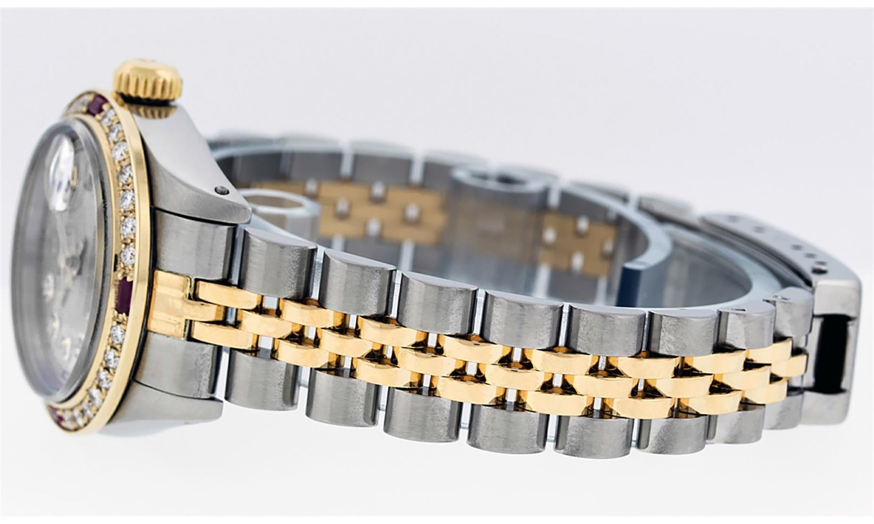 One Ladies 14K Two Tone Rolex Datejust Polished, Serviced & Electronically Tested, 14K Yellow Gold & Stainless Steel Case: 26mm, 14K Yellow Gold Crown, Custom Bezel: New 18K Yellow Gold Ruby Beadset Diamond Bezel, Diamond + Gem Count: 28 Diamonds + 4 Rubies, Total Weight .70 Carat, Clarity: SI-VS, Color: G to H. Custom Crystal: New Scratch Resistant Synthetic Sapphire Cyclops Lens. Custom Hands: New Luminescent Hands. Movement: Automatic Winding Movement Caliber 2030. Custom Dial: Grey With Diamond Hour Markers And Roman Track, Diamond Count: 10 Diamond On Dial, G To H In Color, SI-VS Clarity. Date Window: 3 O'Clock Position Date Display, Model: Datejust, Condition: G-6 Extra Fine. Bracelet: Two Tone 14K Yellow Gold & Stainless Steel Jubilee Band. Bright Polish. 6.0 Inch Length, Adjustable. Standard Clasp, With Rolex Logo. This Watch Has Been Serviced Time Tested And Is In Excellent Condition It Is Free Of All Scratches And Dents.