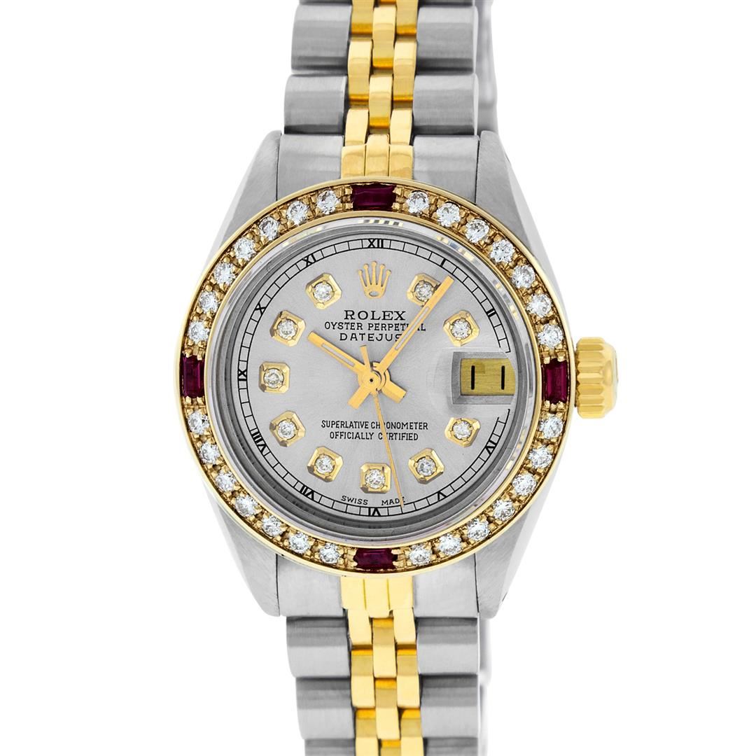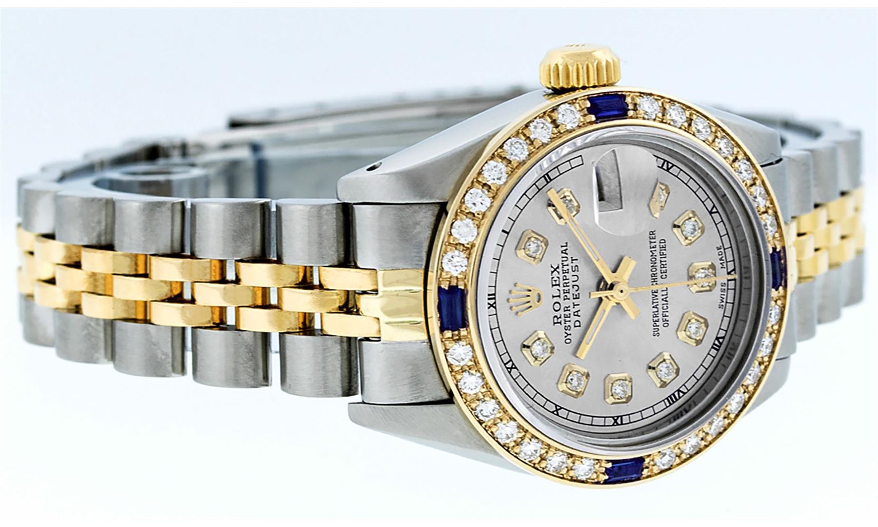 One Ladies 14K Two Tone Rolex Datejust Polished, Serviced & Electronically Tested, 14K Yellow Gold & Stainless Steel Case: 26mm, 14K Yellow Gold Crown, Custom Bezel: New 18K Yellow Gold Sapphire Beadset Diamond Bezel, Diamond + Gem Count: 28 Diamonds + 4 Sapphires, Total Weight .70 Carat, Clarity: SI-VS, Color: G to H. Custom Crystal: New Scratch Resistant Synthetic Sapphire Cyclops Lens. Custom Hands: New Luminescent Hands. Movement: Automatic Winding Movement Caliber 2030. Custom Dial: Grey With Diamond Hour Markers And Roman Track, Diamond Count: 10 Diamond On Dial, G To H In Color, SI-VS Clarity. Date Window: 3 O'Clock Position Date Display, Model: Datejust, Condition: G-6 Extra Fine. Bracelet: Two Tone 14K Yellow Gold & Stainless Steel Jubilee Band. Bright Polish. 6.0 Inch Length, Adjustable. Standard Clasp, With Rolex Logo. This Watch Has Been Serviced Time Tested And Is In Excellent Condition It Is Free Of All Scratches And Dents.