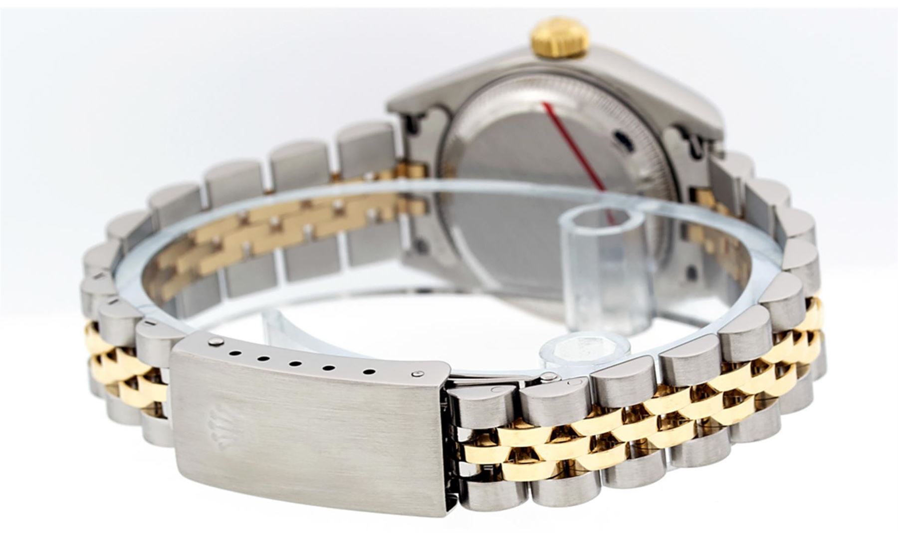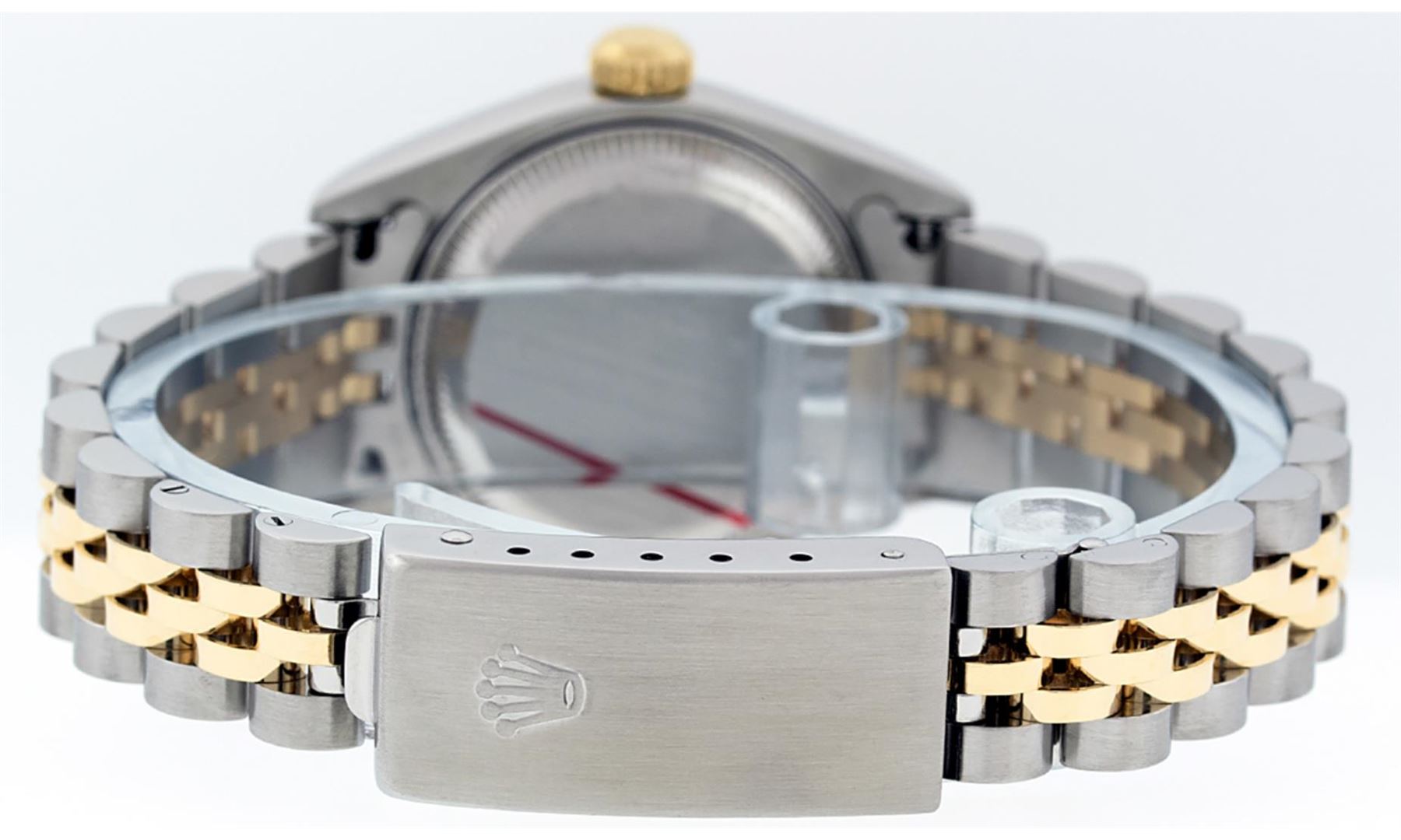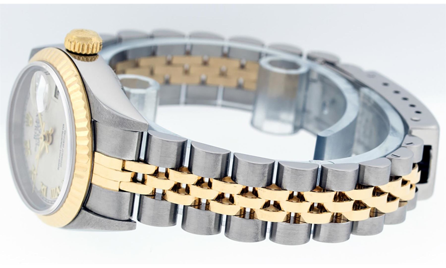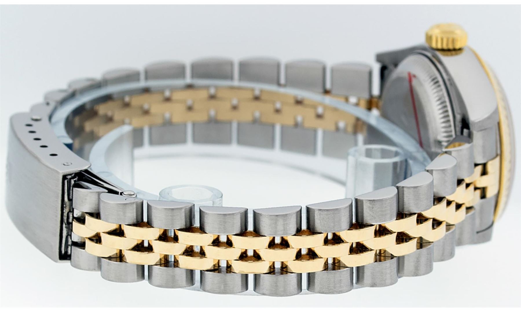 One Ladies Quickset Pre Owned 18K Two Tone Rolex Datejust Polished, Serviced & Electronically Tested, Rolex 18K Yellow Gold & Stainless Steel, Rolex Case Size: 26mm, Rolex 18K Yellow Gold Crown, Rolex Bezel: 18K Yellow Gold Fluted Bezel. Crystal: Sapphire With Magnified Date Window. Hands: Solid Hands. Rolex Movement: Automatic Winding Movement Caliber 2235. Rolex Dial: Ivory Pyramid Roman Dial With Square Track. Date Window: 3 O'Clock Position Date Display, Model: Quickset Datejust. Condition: G-6 Extra Fine. Rolex Bracelet: Two Tone 18K Yellow Gold & Stainless Steel Jubilee Band. Bright Polish. 6.0 Inch Length, Adjustable. Standard Clasp, With Rolex Logo. This Watch Has Been Serviced Time Tested And Is In Excellent Condition It Is Free Of All Scratches And Dents.