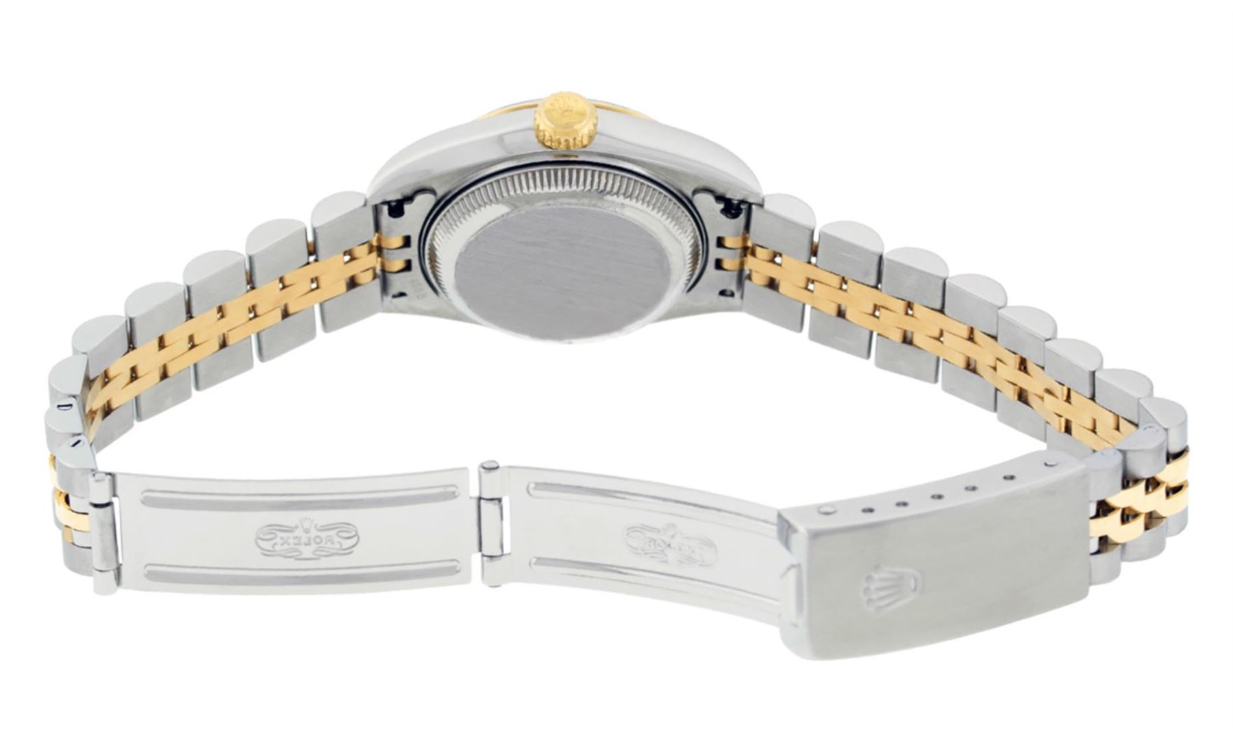 One Ladies Quickset Pre Owned 18K Two Tone Rolex Datejust Polished, Serviced & Electronically Tested, Rolex 18K Yellow Gold & Stainless Steel, Rolex Case Size: 26mm, Rolex 18K Yellow Gold Crown, Rolex Bezel: 18K Yellow Gold Fluted Bezel. Crystal: Sapphire With Magnified Date Window. Hands: Solid Hands. Rolex Movement: Automatic Winding Movement Caliber 2235. Rolex Dial: Ivory Pyramid Roman Dial With Square Track. Date Window: 3 O'Clock Position Date Display, Model: Quickset Datejust. Condition: G-6 Extra Fine. Rolex Bracelet: Two Tone 18K Yellow Gold & Stainless Steel Jubilee Band. Bright Polish. 6.0 Inch Length, Adjustable. Standard Clasp, With Rolex Logo. This Watch Has Been Serviced Time Tested And Is In Excellent Condition It Is Free Of All Scratches And Dents.