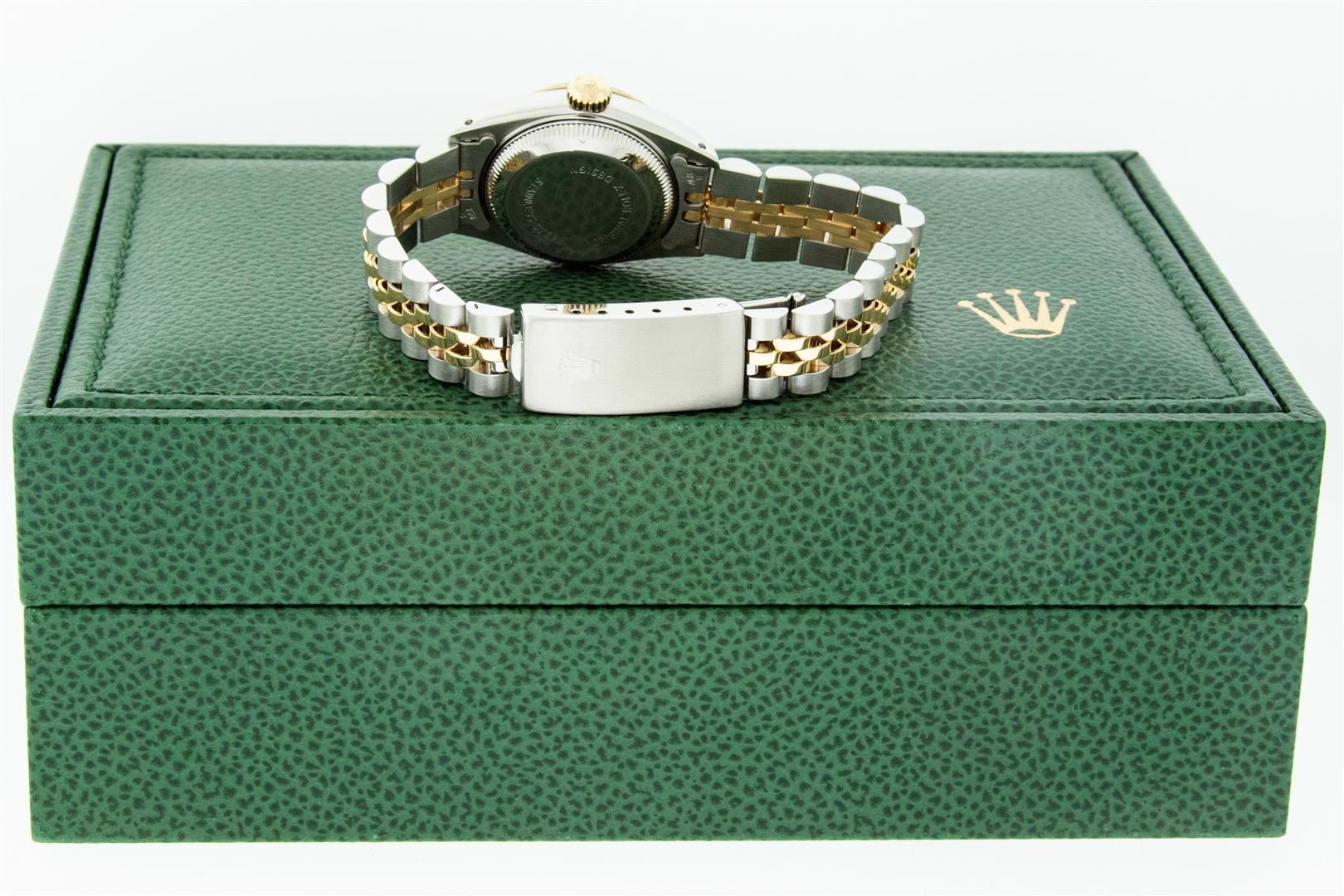 One Ladies Pre Owned Two Tone Rolex Datejust Polished, Serviced & Electronically Tested, Rolex Yellow Gold & Stainless Steel Case: 26mm, Rolex Yellow Gold Crown, Rolex Bezel: Yellow Gold Fluted Bezel. Custom Crystal: New Acrylic With Magnified Date Window. Custom Hands: New Luminescent Hands. Rolex Movement: Automatic Winding Movement. Custom Dial: Mother Of Pearl With Custom Added Genuine Diamond Hour Markers, Diamond Count: 10 Diamonds In Dial, Color: G to H, Clarity: VS2-SI1. Date Window: 3 O'clock Position Date Display, Model: Datejust. Condition: G-6 Extra Fine. Rolex Bracelet: Two Tone Yellow Gold & Stainless Steel Jubilee Band. Bright Polish. 6.0 Inch Length, Adjustable. Standard Clasp, With Rolex Logo. This Pre Owned Watch Has Been Serviced Time Tested And Is In Excellent Condition It Is Free Of All Scratches And Dents. This Watch Comes With A Rolex Box.