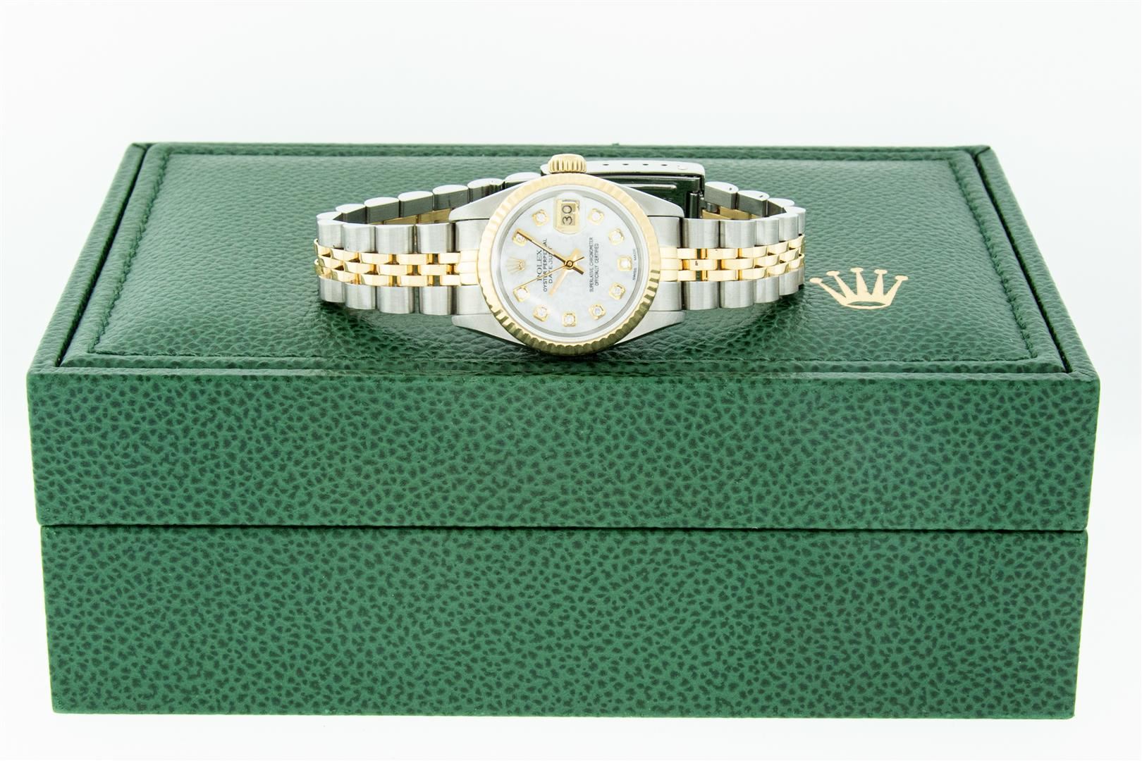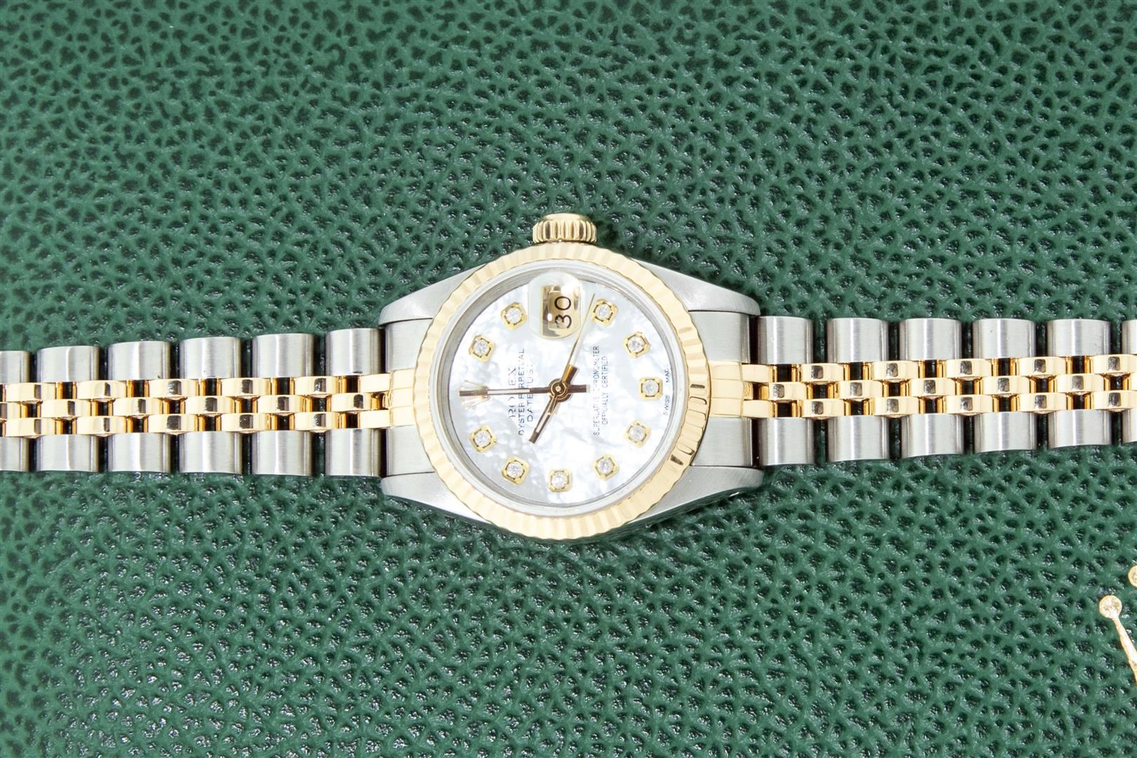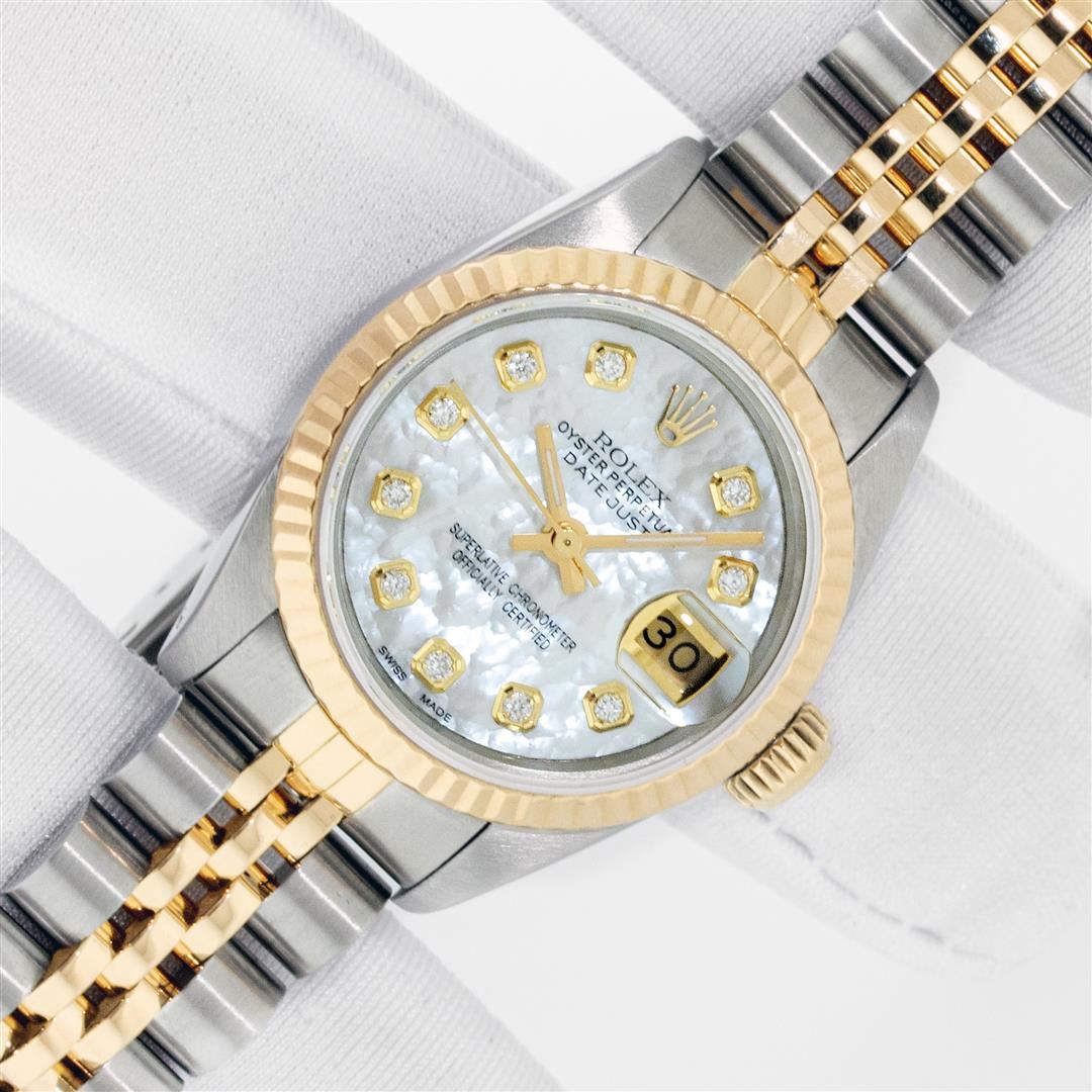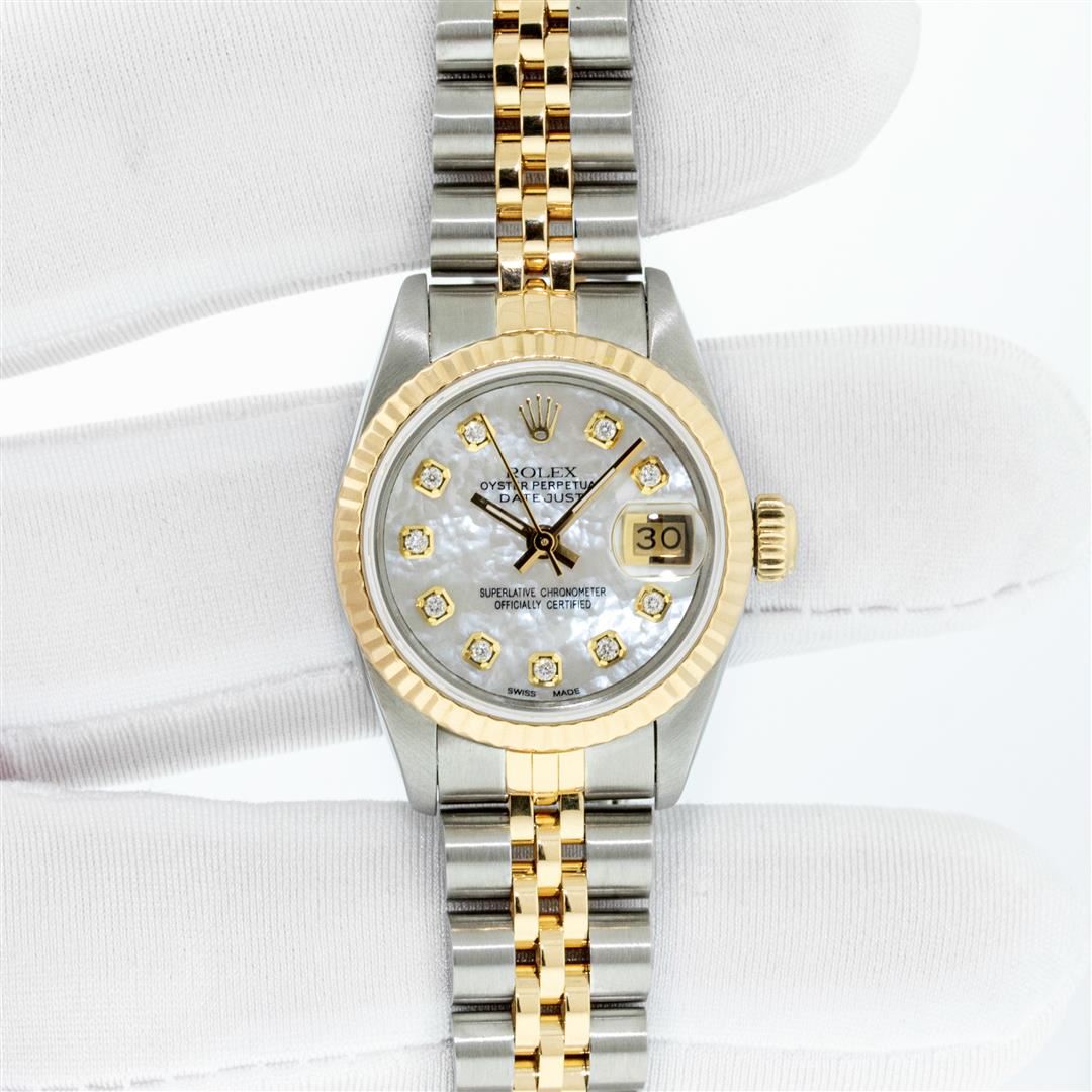One Ladies Pre Owned Two Tone Rolex Datejust Polished, Serviced & Electronically Tested, Rolex Yellow Gold & Stainless Steel Case: 26mm, Rolex Yellow Gold Crown, Rolex Bezel: Yellow Gold Fluted Bezel. Custom Crystal: New Acrylic Cyclops Lens. Custom Hands: New Luminescent Hands. Rolex Movement: Automatic Winding Movement. Custom Dial: Refinished To Mother Of Pearl With Custom Added Diamond Hour Markers, Diamond Count: 10 Diamonds In Dial, Color: G to H, Clarity: VS2-SI1. Date Window: 3 O'Clock Position Date Display, Model: Datejust. Condition: G-6 Extra Fine. Rolex Bracelet: Two Tone Yellow Gold & Stainless Steel Jubilee Band. Bright Polish. 6.0 Inch Length, Adjustable. Standard Clasp, With Rolex Logo. This Watch Has Been Serviced Time Tested And Is In Excellent Condition It Is Free Of All Scratches And Dents. This Watch Comes With A Rolex Box.