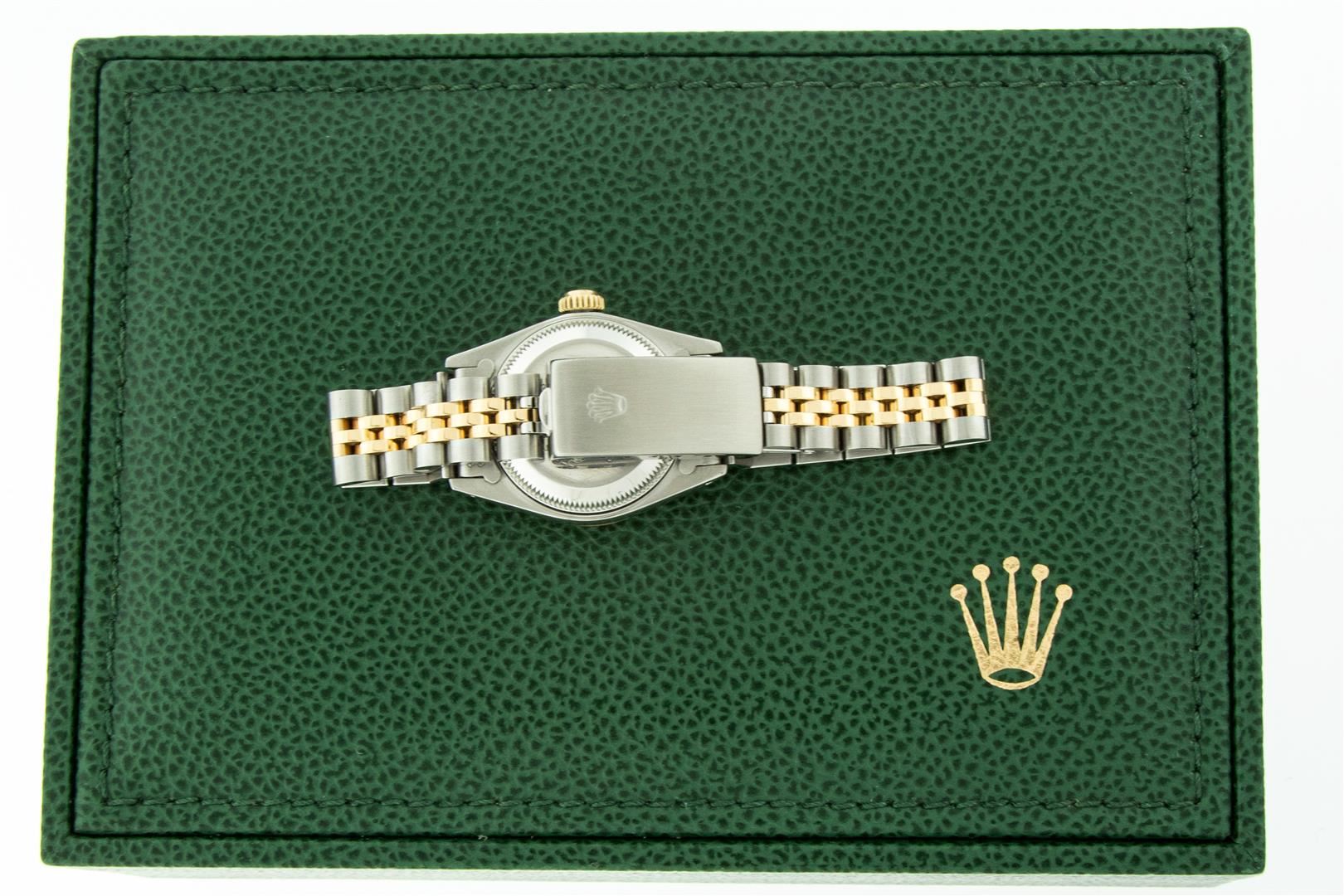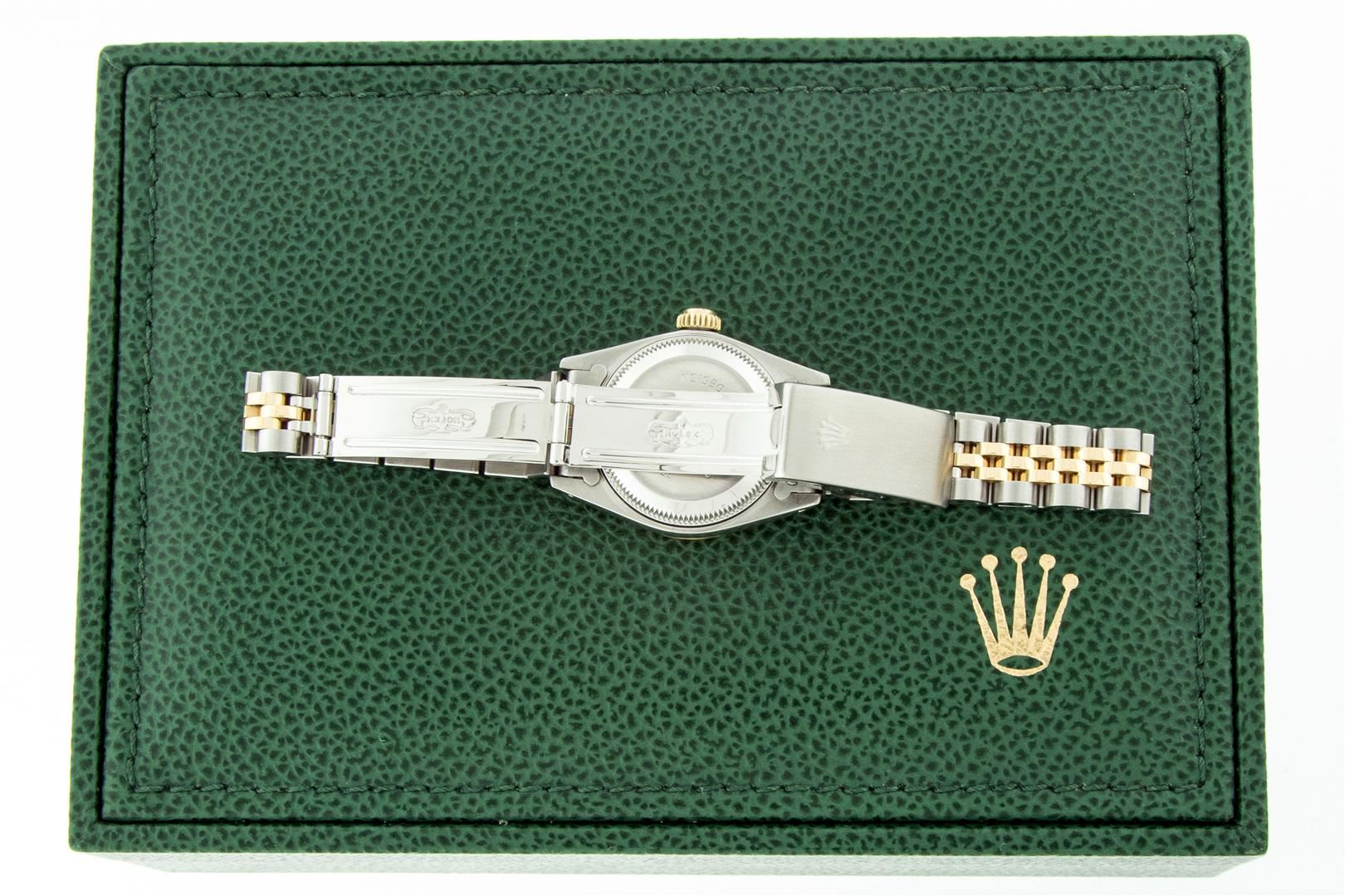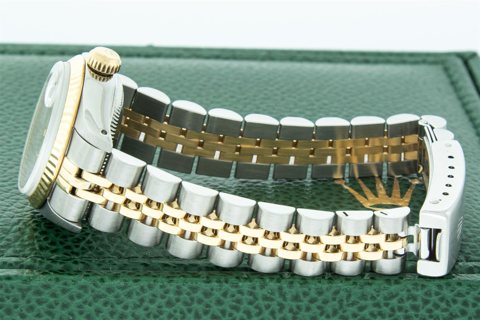 One Ladies Pre Owned Two Tone Rolex Datejust Polished, Serviced & Electronically Tested, Rolex Yellow Gold & Stainless Steel Case: 26mm, Rolex Yellow Gold Crown, Rolex Bezel: Yellow Gold Fluted Bezel. Custom Crystal: New Acrylic Cyclops Lens. Custom Hands: New Luminescent Hands. Rolex Movement: Automatic Winding Movement. Custom Dial: Refinished To Mother Of Pearl With Custom Added Diamond Hour Markers, Diamond Count: 10 Diamonds In Dial, Color: G to H, Clarity: VS2-SI1. Date Window: 3 O'Clock Position Date Display, Model: Datejust. Condition: G-6 Extra Fine. Rolex Bracelet: Two Tone Yellow Gold & Stainless Steel Jubilee Band. Bright Polish. 6.0 Inch Length, Adjustable. Standard Clasp, With Rolex Logo. This Watch Has Been Serviced Time Tested And Is In Excellent Condition It Is Free Of All Scratches And Dents. This Watch Comes With A Rolex Box.
