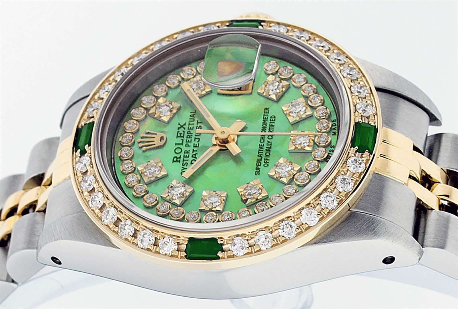 One Ladies Two Tone Rolex Datejust Polished, Serviced & Electronically Tested, Yellow Gold & Stainless Steel Case: 26mm, Yellow Gold Crown, Custom Bezel: New 18K Yellow Gold Emerald Beadset Diamond Bezel, Diamond + Gem Count: 28 Diamonds + 4 Emeralds, Total Weight .70 Carat, Clarity: SI-VS, Color: G to H. Custom Crystal: New Synthetic Sapphire Cyclops Lens. Custom Hands: New Luminescent Hands. Movement: Automatic Winding Movement. Custom Dial: Green Mother Of Pearl String Diamond Dial, Diamond Count: 43 Diamond in Dial, G To H In Color, VS Clarity. Date Window: 3 O'clock Position Date Display, Model: Datejust, Condition: G-6 Extra Fine. Bracelet: Two Tone Yellow Gold & Stainless Steel Jubilee. Bright Polish. 6.0 Inch Length, Adjustable. Standard Clasp, With Rolex Logo. This Watch Has Been Serviced Time Tested And Is In Excellent Condition It Is Free Of All Scratches And Dents.