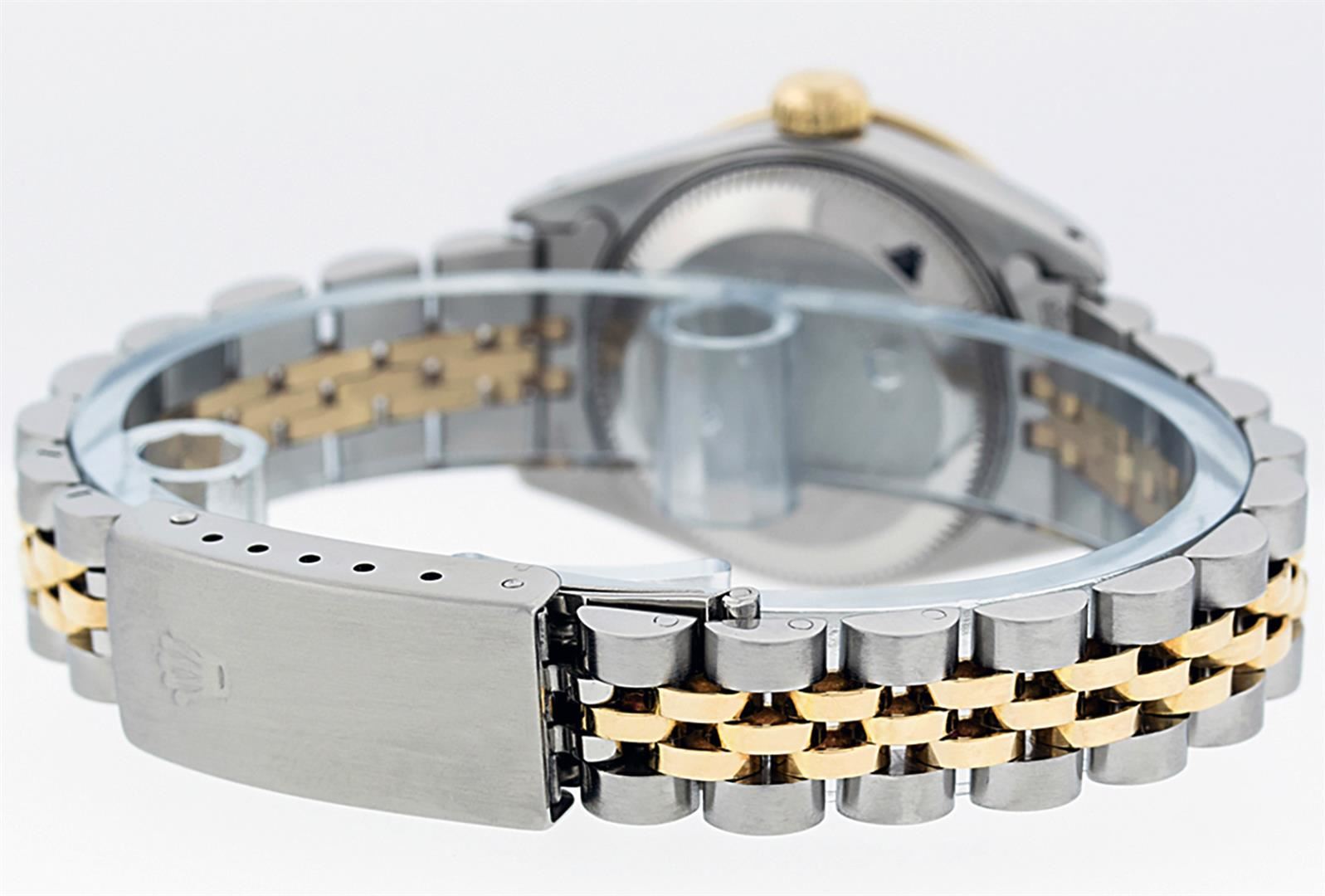 One Ladies Two Tone Rolex Datejust Polished, Serviced & Electronically Tested, Yellow Gold & Stainless Steel Case: 26mm, Yellow Gold Crown, Custom Bezel: New 18K Yellow Gold Emerald Beadset Diamond Bezel, Diamond + Gem Count: 28 Diamonds + 4 Emeralds, Total Weight .70 Carat, Clarity: SI-VS, Color: G to H. Custom Crystal: New Synthetic Sapphire Cyclops Lens. Custom Hands: New Luminescent Hands. Movement: Automatic Winding Movement. Custom Dial: Green Mother Of Pearl String Diamond Dial, Diamond Count: 43 Diamond in Dial, G To H In Color, VS Clarity. Date Window: 3 O'clock Position Date Display, Model: Datejust, Condition: G-6 Extra Fine. Bracelet: Two Tone Yellow Gold & Stainless Steel Jubilee. Bright Polish. 6.0 Inch Length, Adjustable. Standard Clasp, With Rolex Logo. This Watch Has Been Serviced Time Tested And Is In Excellent Condition It Is Free Of All Scratches And Dents.