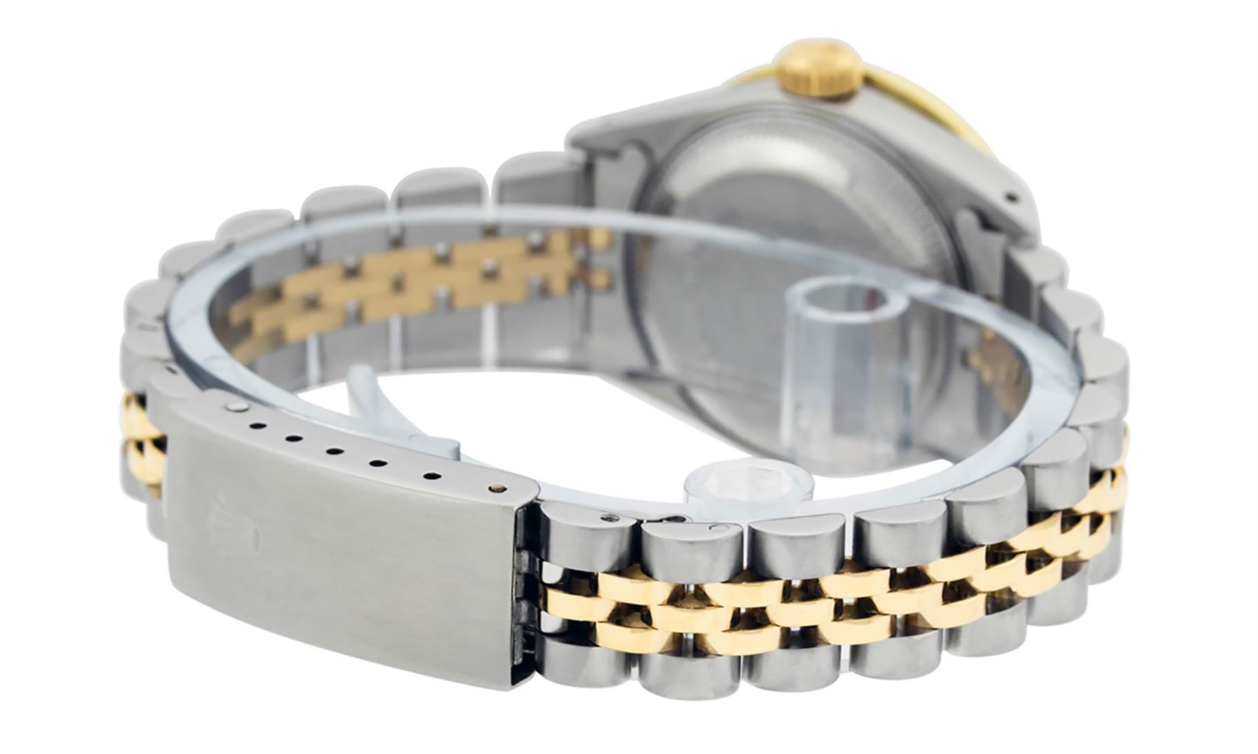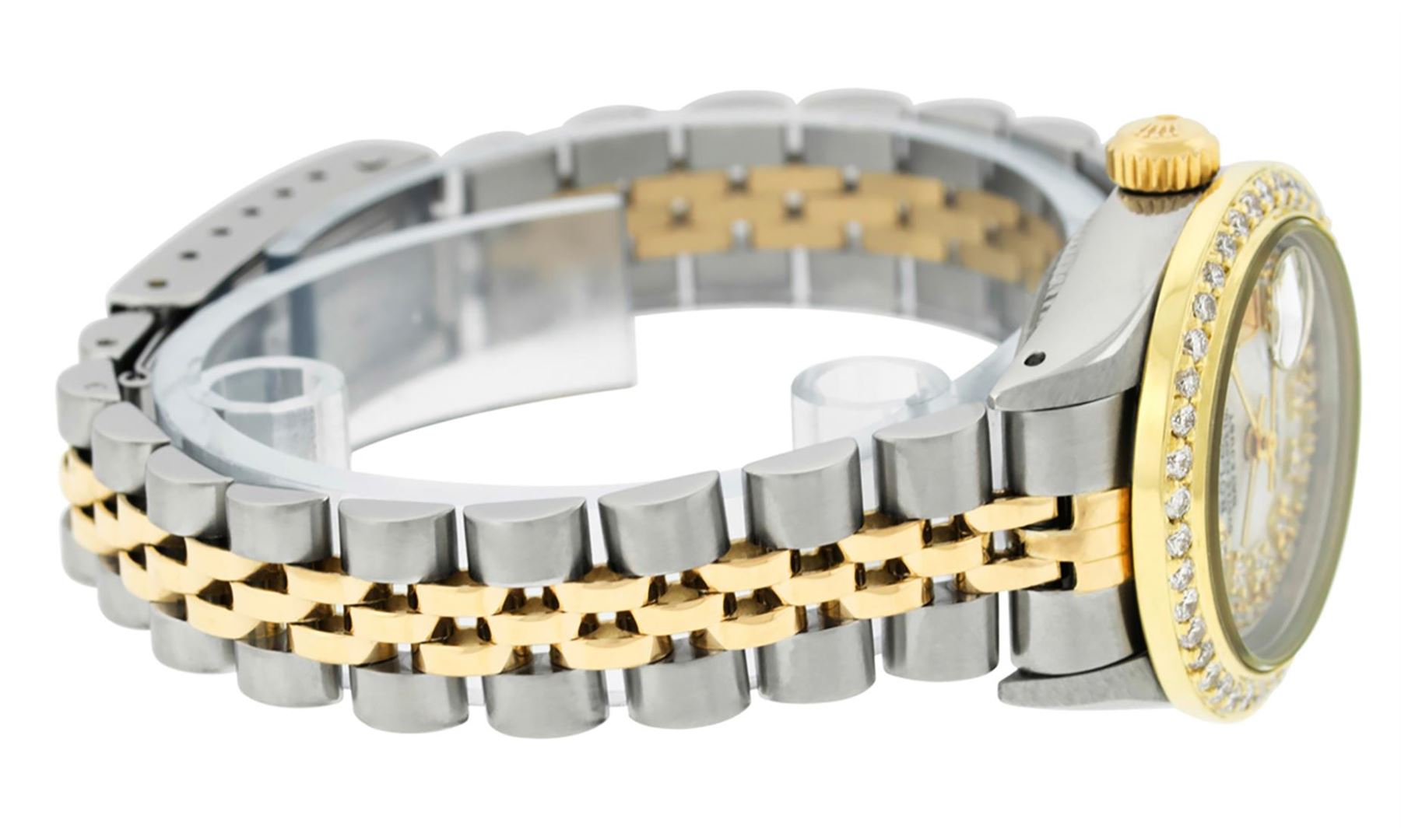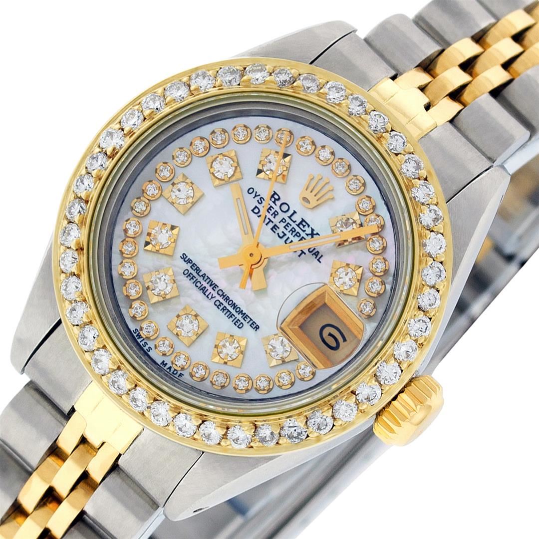One Ladies Two Tone Rolex Datejust Polished, Serviced & Electronically Tested, Yellow Gold & Stainless Steel Case: 26mm, Yellow Gold Crown, Custom Bezel: New 18K 1ctw Yellow Gold Beadset Diamond Bezel, Diamond Count: 44 Diamonds, Total Weight 1.00 Carat, Clarity: Si-VS, Color: G to H. Custom Crystal: New Scratch Resistant Synthetic Sapphire Cyclops Lens. Custom Hands: New Luminescent Hands. Movement: Automatic Winding Movement. Custom Dial: Mother Of Pearl String Diamond Dial, Diamond Count: 43 Single Cut Diamonds in Dial, G To H In Color, VS Clarity. Date Window: 3 O'clock Position Date Display, Model: Datejust, Condition: G-6 Extra Fine. Bracelet: Two Tone Yellow Gold & Stainless Steel Jubilee. Bright Polish. 6.0 Inch Length, Adjustable. Standard Clasp, With Rolex Logo. This Watch Has Been Serviced Time Tested And Is In Excellent Condition It Is Free Of All Scratches And Dents.
