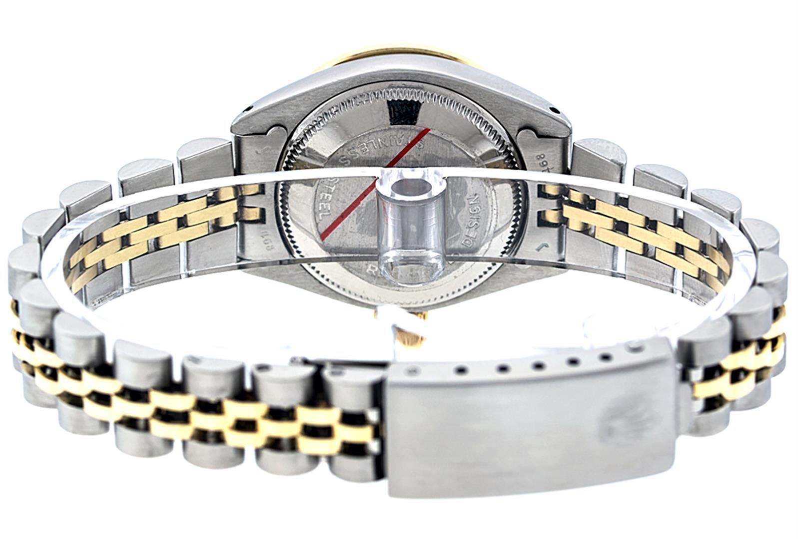 One Ladies 14K Two Tone Rolex Datejust Polished, Serviced & Electronically Tested, 14K Yellow Gold & Stainless Steel Case: 26mm, 14K Yellow Gold Crown, Custom Bezel: New 18K Yellow Gold Ruby Beadset Diamond Bezel, Diamond + Gem Count: 28 Diamonds + 4 Rubies Total Weight .70 Carat, Clarity: Si-VS, Color: G to H. Custom Crystal: New Scratch Resistant Synthetic Sapphire Cyclops Lens. Custom Hands: New Luminescent Hands. Movement: Automatic Winding Movement Caliber 2030. Custom Dial: Mother Of Pearl Set With Diamond Hour Markers & Dash Track, Diamond Count: 10 Diamond in Dial, G To H In Color, SI-VS Clarity. Date Window: 3 O'Clock Position Date Display, Model: Datejust, Condition: G-6 Extra Fine. Bracelet: Two Tone 14K Yellow Gold & Stainless Steel Jubilee Band. Bright Polish. 6.0 Inch Length, Adjustable. Standard Clasp, With Rolex Logo. This Watch Has Been Serviced Time Tested And Is In Excellent Condition It Is Free Of All Scratches And Dents.