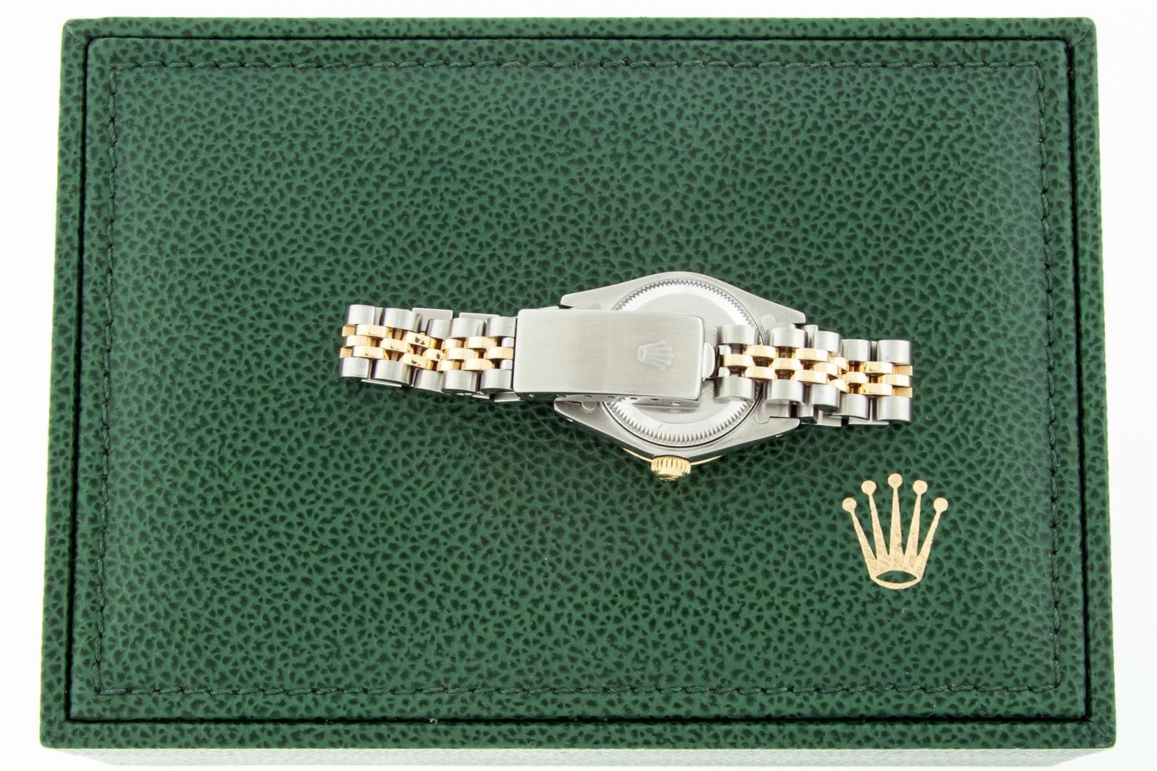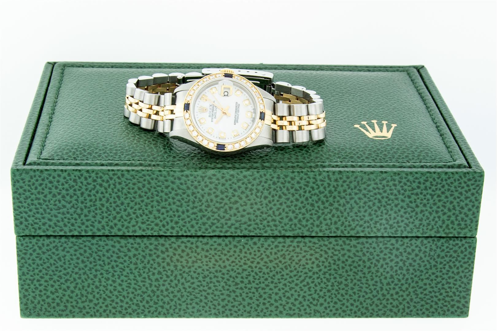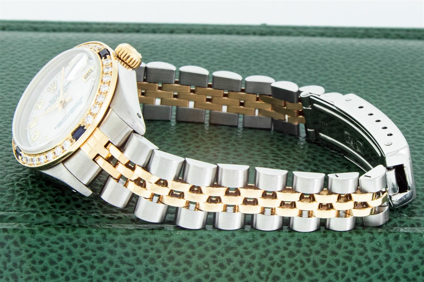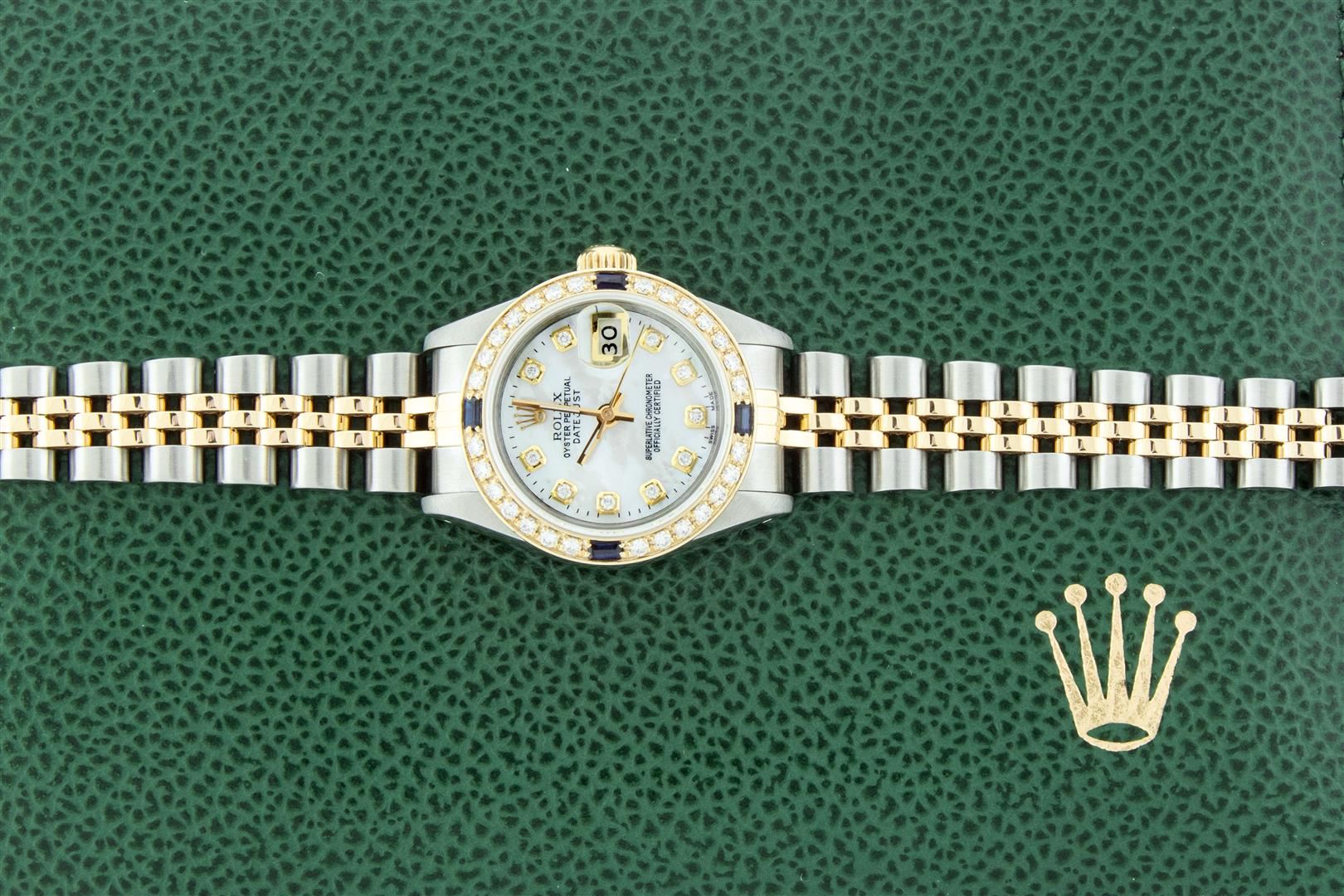 One Ladies Two Tone Yellow Gold And Stainless Steel Rolex Datejust Polished, Serviced & Electronically Tested, Yellow Gold & Stainless Steel Case: 26mm, Rolex Yellow Gold Crown, Custom Bezel: New 18K Yellow Gold Sapphire Beadset Diamond Bezel, Diamond + Gem Count: 28 Diamonds + 4 Sapphires, Clarity: SI-VS, Color: G to H. Custom Crystal: New Sapphire With Magnified Date Window. Custom Hands: New Luminescent Hands. Rolex Movement: Automatic Winding Movement. Custom Dial: Mother Of Pearl Set With Diamond Hour Markers & Dash Track, Diamond Count: 10 Diamond in Dial, G To H In Color, SI-VS Clarity. Date Window: 3 O'clock Position Date Display, Model: Datejust, Condition: G-6 Extra Fine. Rolex Bracelet: Two Tone Yellow Gold & Stainless Steel Jubilee Band. Bright Polish. 6.0 Inch Length, Adjustable. Standard Clasp, With Rolex Logo. This Pre Owned Watch Has Been Serviced Time Tested And Is In Excellent Condition It Is Free Of All Scratches And Dents. This Watch Comes With A Rolex Box.