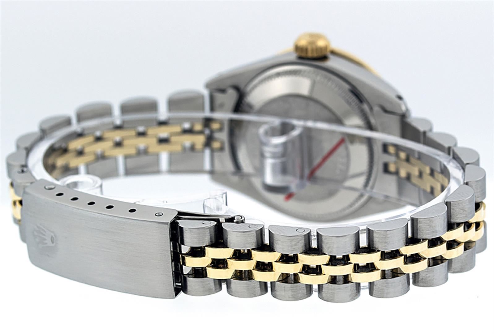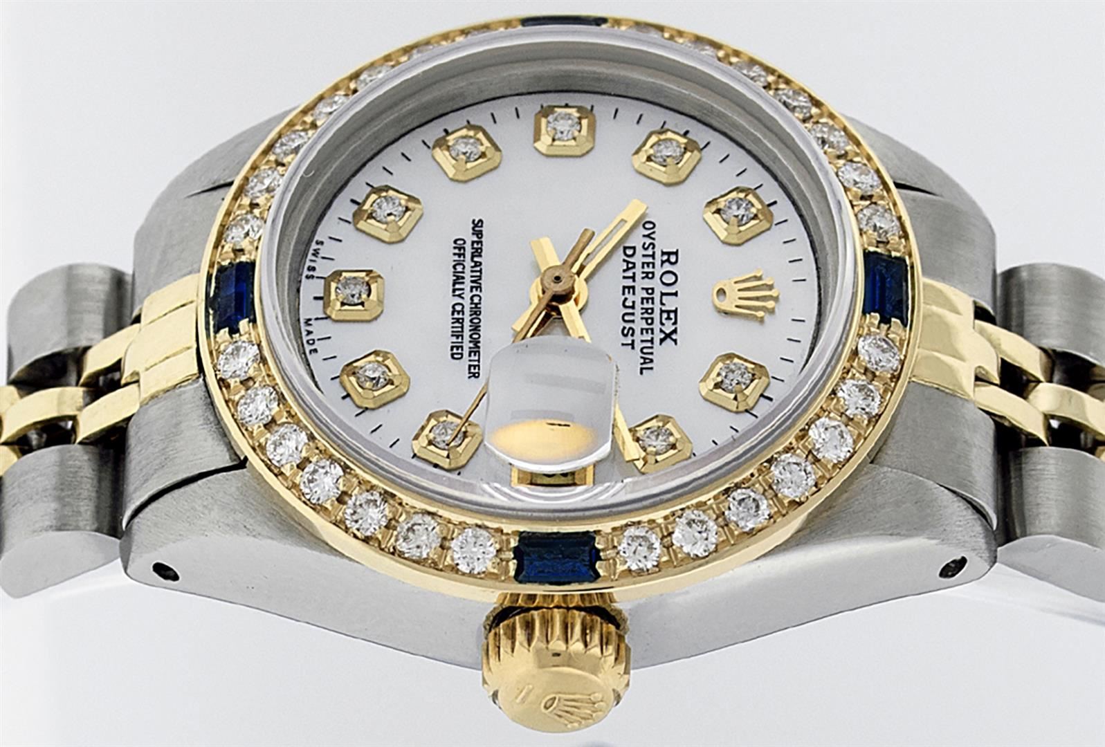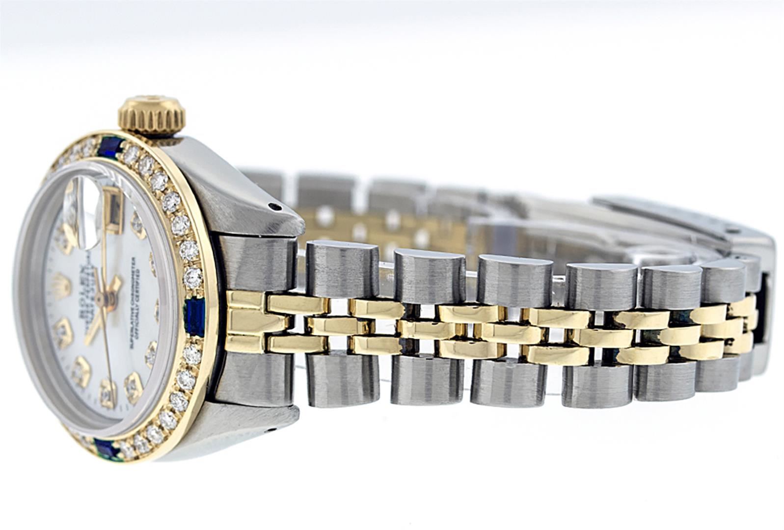 One Ladies 14K Two Tone Rolex Datejust Polished, Serviced & Electronically Tested, 14K Yellow Gold & Stainless Steel Case: 26mm, 14K Yellow Gold Crown, Custom Bezel: New 18K Yellow Gold Sapphire Beadset Diamond Bezel, Diamond + Gem Count: 28 Diamonds + 4 Sapphires Total Weight .70 Carat, Clarity: SI-VS, Color: G to H. Custom Crystal: New Synthetic Sapphire Cyclops Lens. Custom Hands: New Luminescent Hands. Movement: Automatic Winding Movement Caliber 2030. Custom Dial: Mother Of Pearl Set With Diamond Hour Markers & Dash Track, Diamond Count: 10 Diamond in Dial, G To H In Color, SI-VS Clarity. Date Window: 3 O'Clock Position Date Display, Model: Datejust, Condition: G-6 Extra Fine. Bracelet: Two Tone 14K Yellow Gold & Stainless Steel Jubilee Band. Bright Polish. 6.0 Inch Length, Adjustable. Standard Clasp, With Rolex Logo. This Watch Has Been Serviced Time Tested And Is In Excellent Condition It Is Free Of All Scratches And Dents.