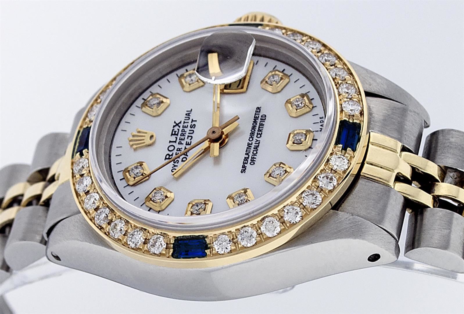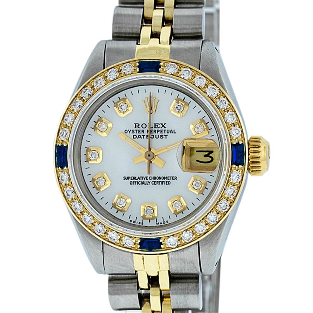 One Ladies 14K Two Tone Rolex Datejust Polished, Serviced & Electronically Tested, 14K Yellow Gold & Stainless Steel Case: 26mm, 14K Yellow Gold Crown, Custom Bezel: New 18K Yellow Gold Sapphire Beadset Diamond Bezel, Diamond + Gem Count: 28 Diamonds + 4 Sapphires Total Weight .70 Carat, Clarity: SI-VS, Color: G to H. Custom Crystal: New Synthetic Sapphire Cyclops Lens. Custom Hands: New Luminescent Hands. Movement: Automatic Winding Movement Caliber 2030. Custom Dial: Mother Of Pearl Set With Diamond Hour Markers & Dash Track, Diamond Count: 10 Diamond in Dial, G To H In Color, SI-VS Clarity. Date Window: 3 O'Clock Position Date Display, Model: Datejust, Condition: G-6 Extra Fine. Bracelet: Two Tone 14K Yellow Gold & Stainless Steel Jubilee Band. Bright Polish. 6.0 Inch Length, Adjustable. Standard Clasp, With Rolex Logo. This Watch Has Been Serviced Time Tested And Is In Excellent Condition It Is Free Of All Scratches And Dents.