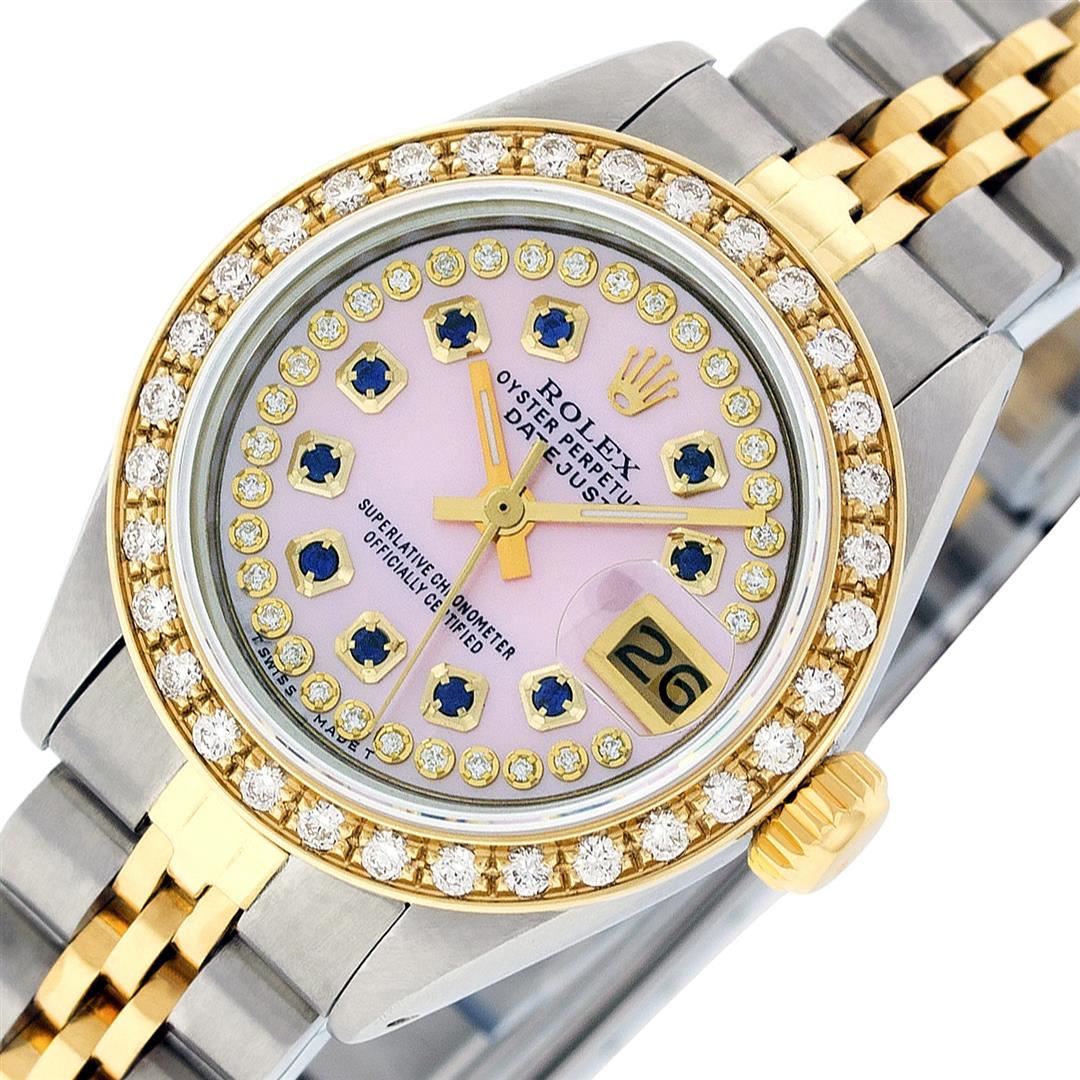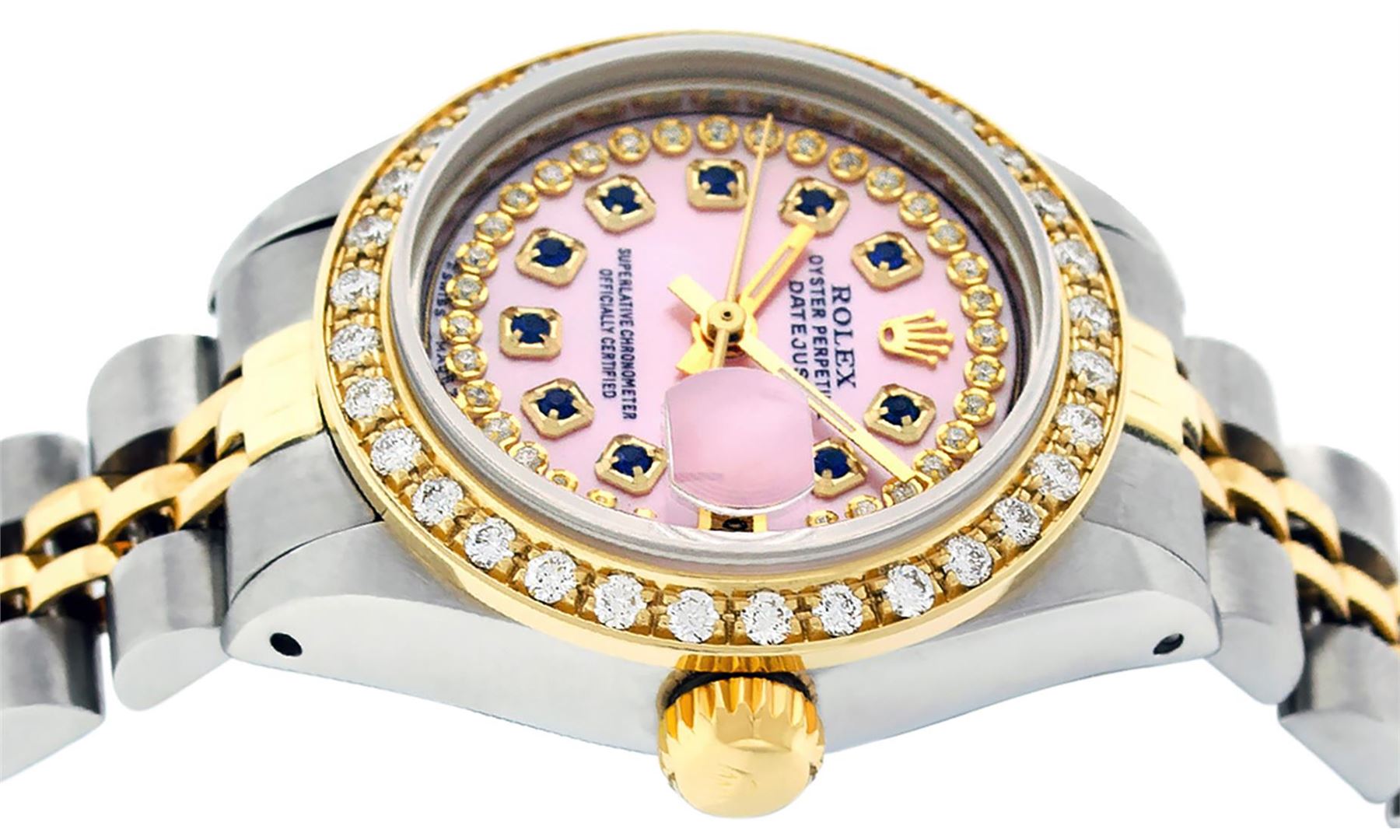 One Ladies Two Tone Rolex Datejust Polished, Serviced & Electronically Tested, Yellow Gold & Stainless Steel Case: 26mm, Yellow Gold Crown, Custom Bezel: New 18K Yellow Gold Beadset Diamond Bezel, Diamond Count: 43 Diamonds in dial, Total Weight .70 Carat, Clarity: SI-VS, Color: G to H. Custom Crystal: New Synthetic Sapphire Cyclops Lens. Custom Hands: New Luminescent Hands. Movement: Automatic Winding Movement. Custom Dial: Mother Of Pearl String Diamond and Sapphire Dial, Stone Count: 33 Diamonds + 10 Sapphires, Clarity: SI-VS, Color: G to H. Date Window: 3 O'clock Position Date Display, Model: Datejust. Condition: G-6 Extra Fine. Bracelet: Two Tone Yellow Gold & Stainless Steel Jubilee Band. Bright Polish. 6.0 Inch Length, Adjustable. Standard Clasp, With Rolex Logo. This Watch Has Been Serviced Time Tested And Is In Excellent Condition It Is Free Of All Scratches And Dents.