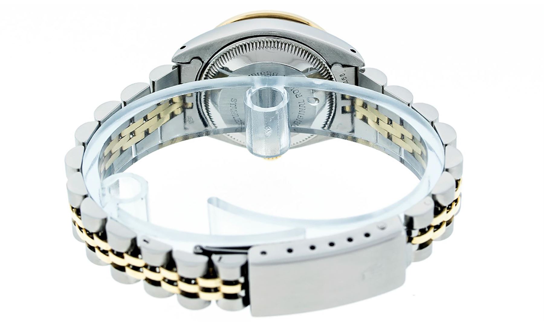 One Ladies Two Tone Rolex Datejust Polished, Serviced & Electronically Tested, Yellow Gold & Stainless Steel Case: 26mm, Yellow Gold Crown, Custom Bezel: New 18K Yellow Gold Beadset Diamond Bezel, Clarity: SI-VS, Color: G to H. Custom Crystal: New Synthetic Sapphire Cyclops Lens. Custom Hands: New Luminescent Hands. Movement: Automatic Winding Movement. Custom Dial: Mother Of Pearl String Diamond Dial, Diamond Count: 43 Diamonds, Clarity: SI-VS, Color: G to H. Date Window: 3 O'Clock Position Date Display, Model: Datejust. Condition: G-6 Extra Fine. Bracelet: Two Tone Yellow Gold & Stainless Steel Jubilee Band. Bright Polish. 6.0 Inch Length, Adjustable. Standard Clasp, With Rolex Logo. This Watch Has Been Serviced Time Tested And Is In Excellent Condition It Is Free Of All Scratches And Dents.