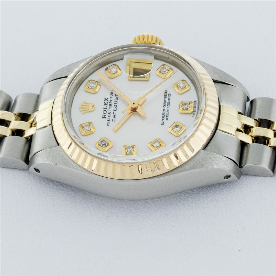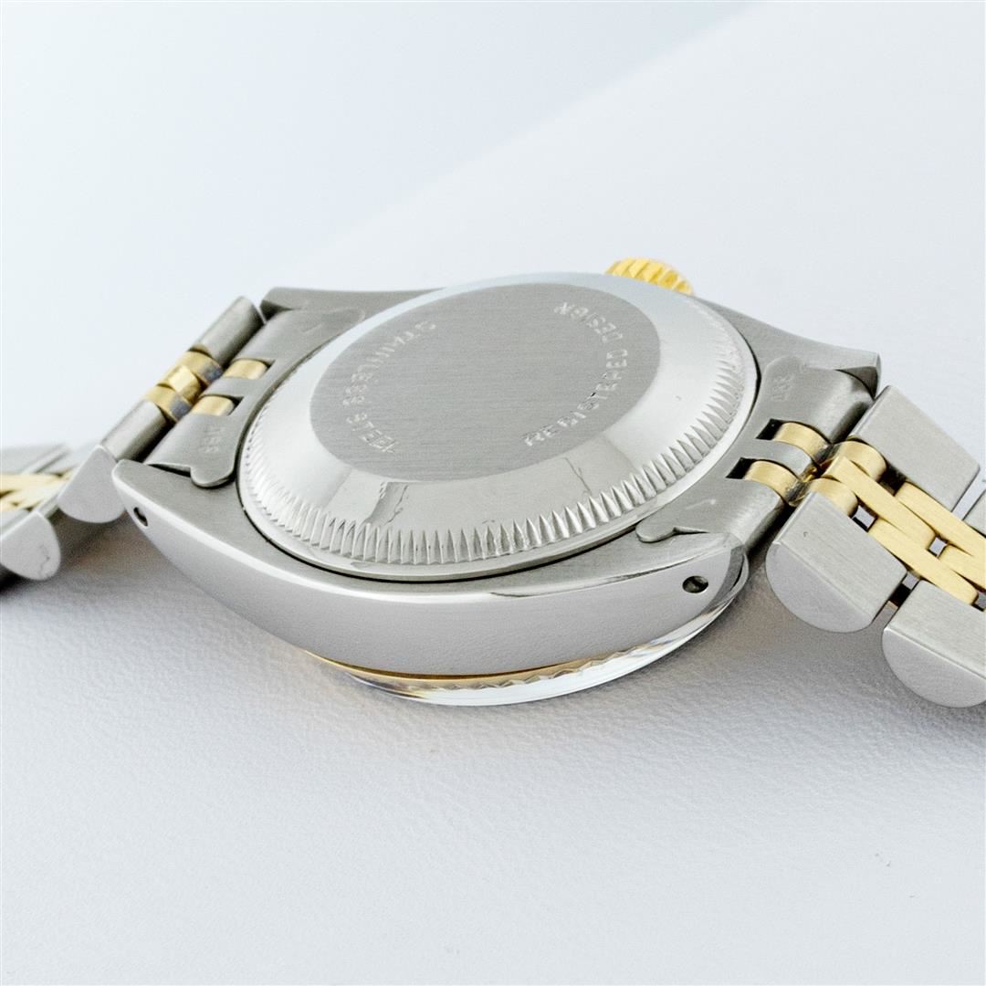 One Ladies Pre Owned Two Tone Rolex Datejust Polished, Serviced & Electronically Tested, Rolex Yellow Gold & Stainless Steel Case: 26mm, Rolex Yellow Gold Crown, Rolex Bezel: Yellow Gold Fluted Bezel. Custom Crystal: New Acrylic Cyclops Lens. Custom Hands: New Luminescent Hands. Rolex Movement: Automatic Winding Movement. Custom Dial: Refinished To Mother Of Pearl With Added Diamond Hour Markers, Diamond Count: 10 Diamonds In Dial, Color: G to H, Clarity: VS2-SI1. Date Window: 3 O'Clock Position Date Display, Model: Datejust. Condition: G-6 Extra Fine. Rolex Bracelet: Two Tone Yellow Gold & Stainless Steel Jubilee Band. Bright Polish. 6.0 Inch Length, Adjustable. Standard Clasp, With Rolex Logo. This Watch Has Been Serviced Time Tested And Is In Excellent Condition It Is Free Of All Scratches And Dents.