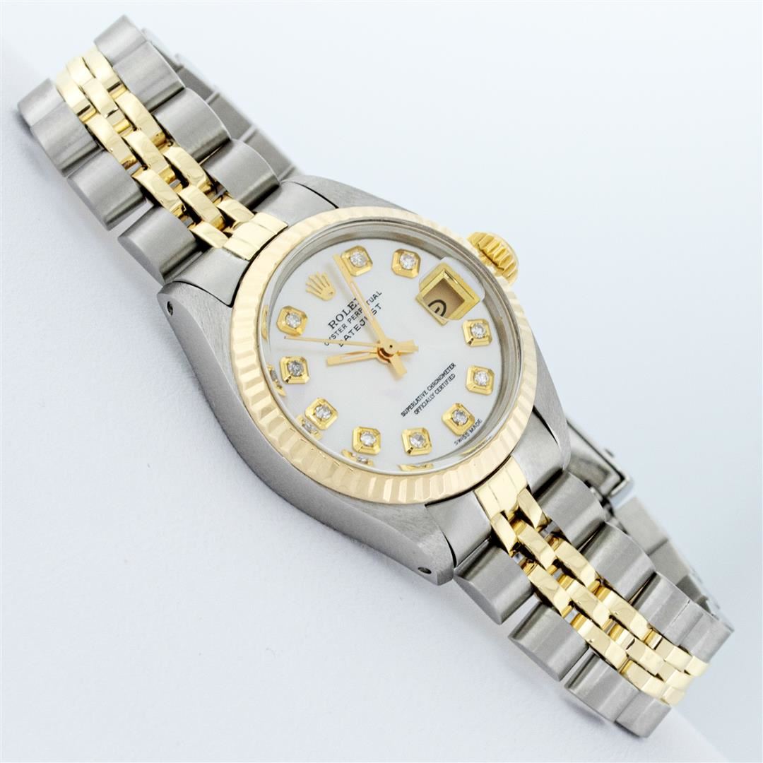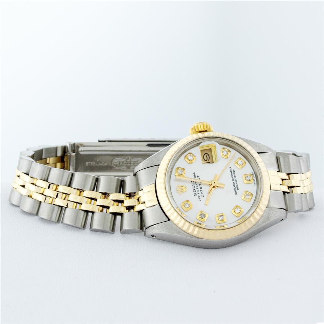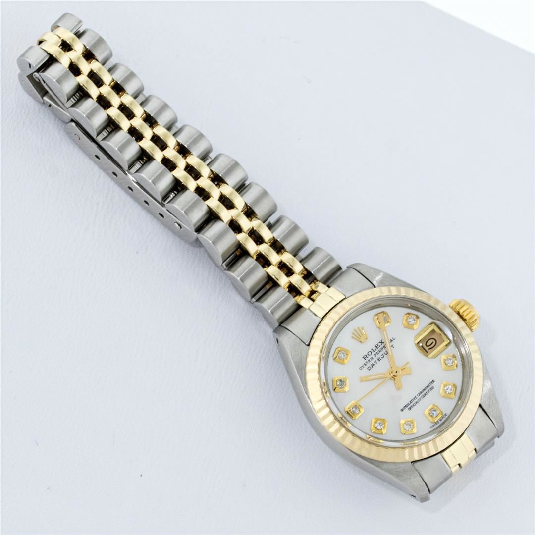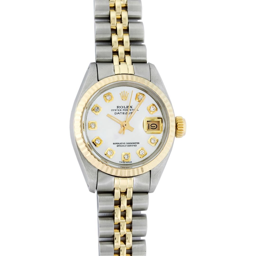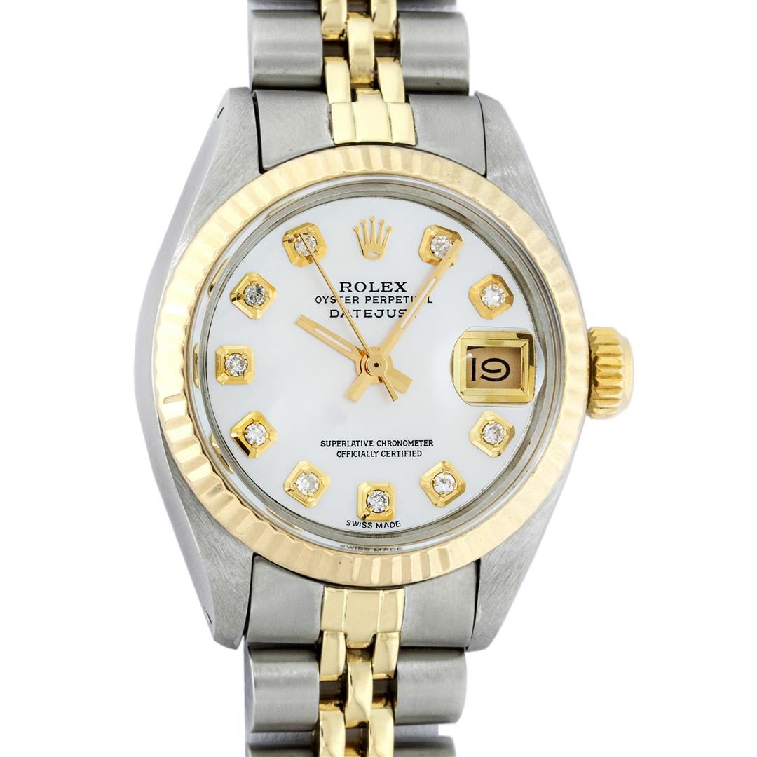 One Ladies Pre Owned Two Tone Rolex Datejust Polished, Serviced & Electronically Tested, Rolex Yellow Gold & Stainless Steel Case: 26mm, Rolex Yellow Gold Crown, Rolex Bezel: Yellow Gold Fluted Bezel. Custom Crystal: New Acrylic Cyclops Lens. Custom Hands: New Luminescent Hands. Rolex Movement: Automatic Winding Movement. Custom Dial: Refinished To Mother Of Pearl With Added Diamond Hour Markers, Diamond Count: 10 Diamonds In Dial, Color: G to H, Clarity: VS2-SI1. Date Window: 3 O'Clock Position Date Display, Model: Datejust. Condition: G-6 Extra Fine. Rolex Bracelet: Two Tone Yellow Gold & Stainless Steel Jubilee Band. Bright Polish. 6.0 Inch Length, Adjustable. Standard Clasp, With Rolex Logo. This Watch Has Been Serviced Time Tested And Is In Excellent Condition It Is Free Of All Scratches And Dents.